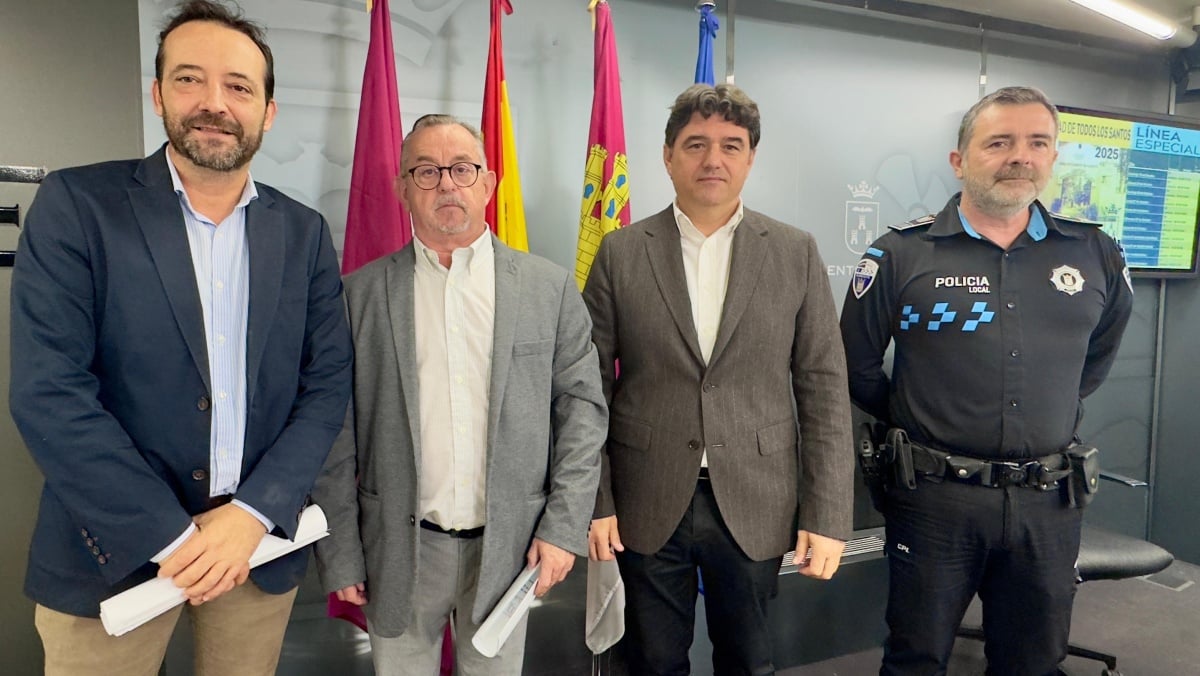 Los concejales de Movilidad, Francisco Navarro, y de Cementerios, Carlos Calero, acompañados del jefe de la Policía Local, Mario Rubio, y Julio Jiménez, de Mortualba, han informado en rueda de prensa del dispositivo especial que el Ayuntamiento va a poner en marcha con motivo de la festividad de Todos los Santos.