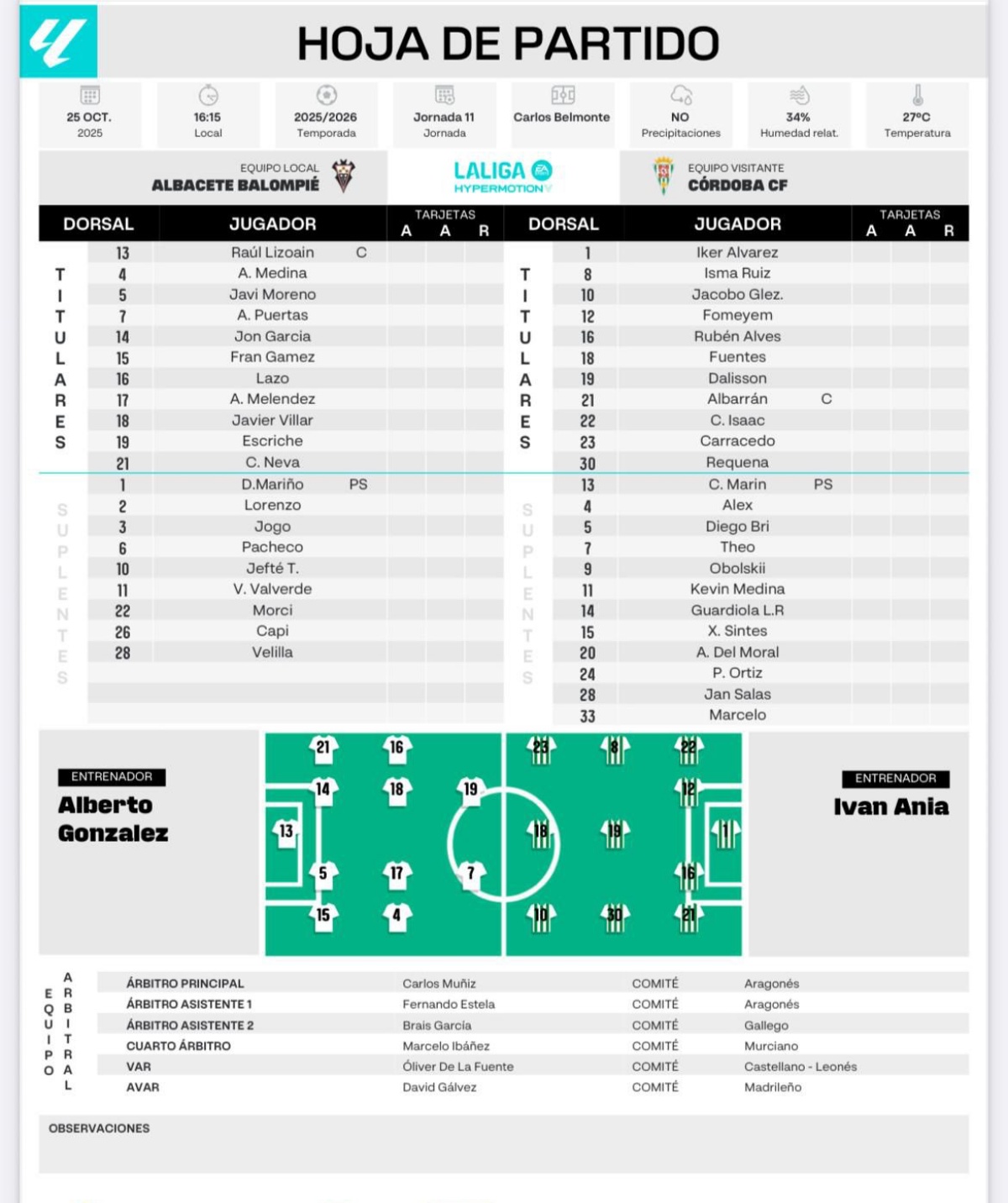 Por parte del Córdoba CF, Iván Ania apostó por un once compuesto por Iker Álvarez en portería; el ex albacetista Carlos Isaac, Fomeyem, Alves y Albarrán, en defensa; Isma Ruiz, Dalysson y Requena, en el centro del campo; y Carracedo, Jacobo y Fuentes, en ataque.