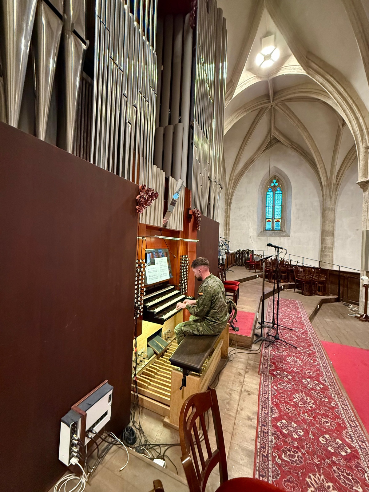 El órgano, que es toda una obra de ingeniería, se encuentra en la Catedral de San Martín, y hasta él llegó Mario Piñero junto a sus compañeros de la Brigada Multinacional Eslovaquia. Además de llevar a cabo su labor reforzando la seguridad, el capitán David Menéndez, de esta Brigada, comparte con El Digital de Albacete que “también llevamos a cabo otro tipo de actividades culturales, deportivas y religiosas, que ponen de manifiesto nuestro compromiso con la sociedad eslovaca, su cultura y tradiciones”, por lo que la brigada al completo emprendió “una etapa del camino de Santiago desde la Basílica de Marianska hasta la Catedral junto a compañeros españoles, eslovacos, checos, portugueses y rumanos”. A la llegada, se ofició una misa, en la que Mario fue el encargado de poner la nota musical.