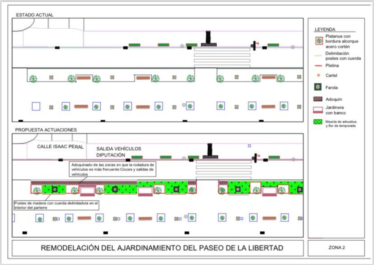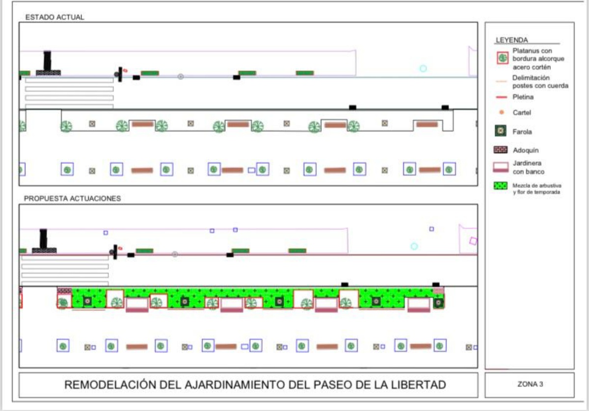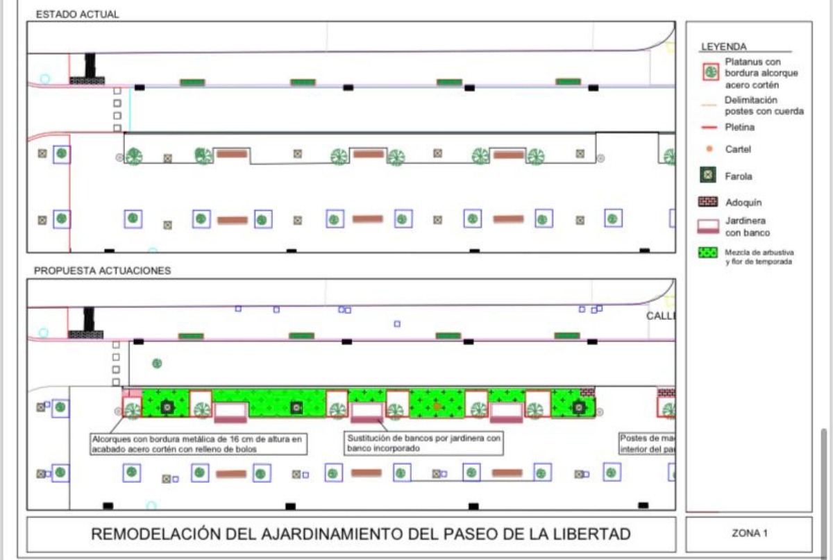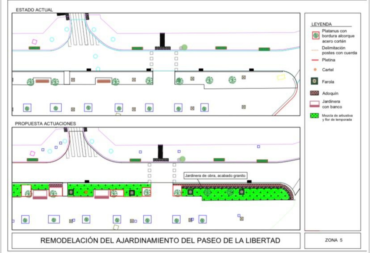 Asimismo, la concejala ha explicado que se colocarán nuevas plantaciones, se colocarán 15 jardineras con banco que sustituirán a los bancos existentes en el Paseo de la Libertad. Contarán con especies arbustivas y herbáceas seleccionadas por la variedad cromática de su follaje y floración para aportar riqueza visual, diversidad vegetal y embellecimiento del entorno urbano. El nuevo modelo incluirá banco frontal.