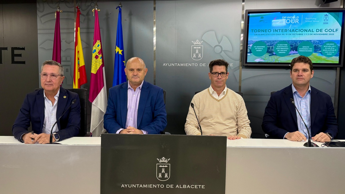El concejal de Deportes, Francisco Villaescusa, ha presentado el Torneo Internacional de Golf ‘DP Word Tour’ junto a Cristian Herrero y Roberto Pacheco del Club de Golf ‘Las Pinaillas’, y el vicepresidente de la Federación de Golf de Castilla-La Mancha, Pascual Martínez.