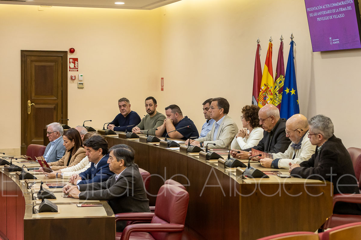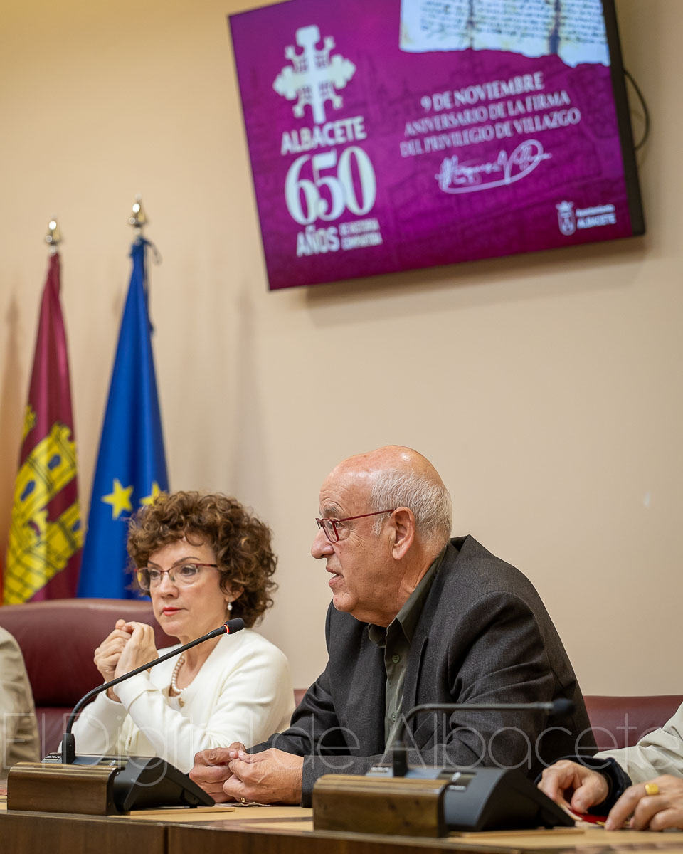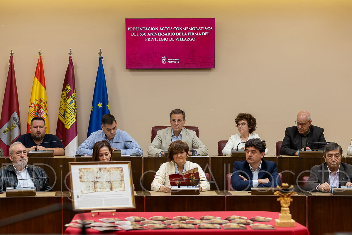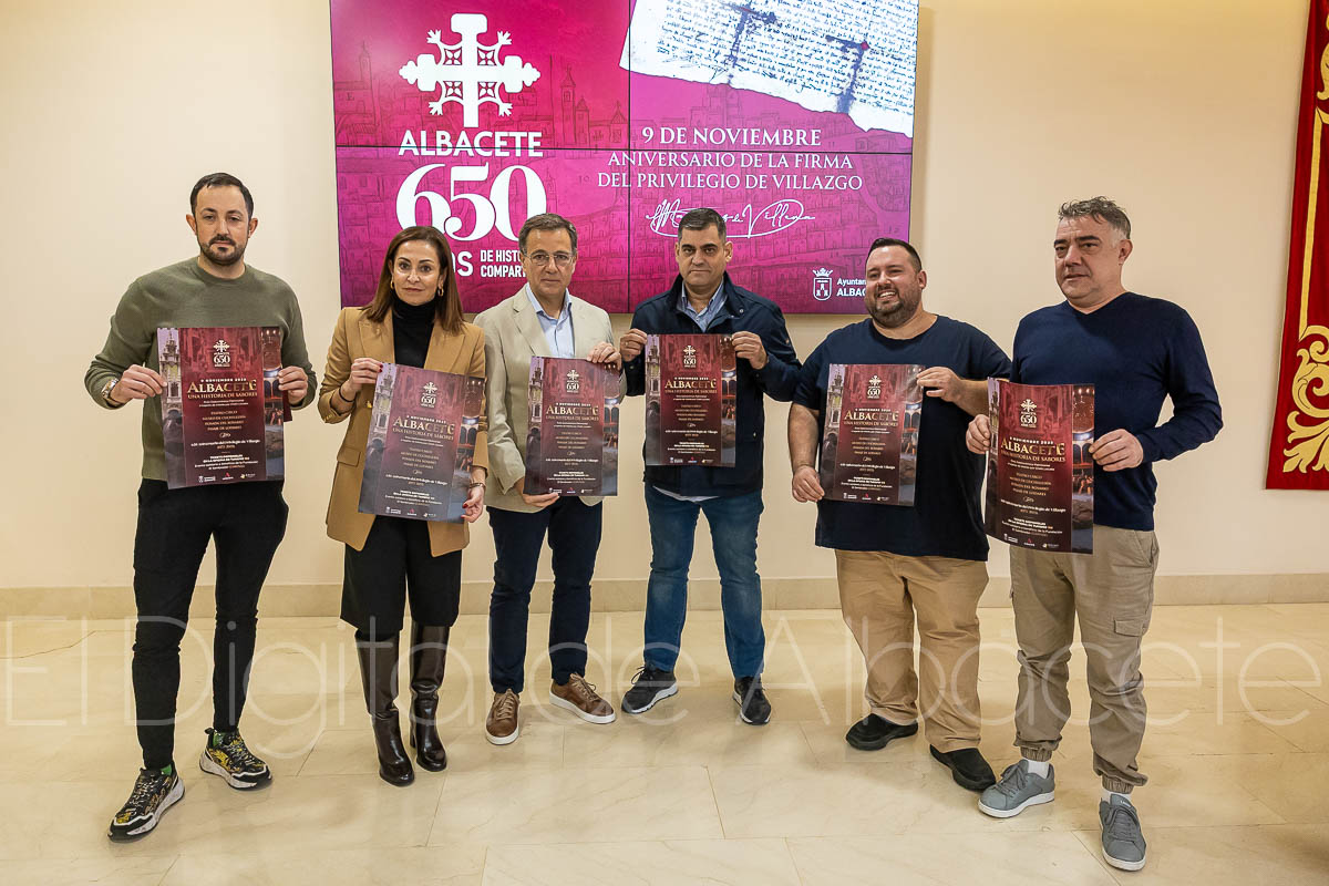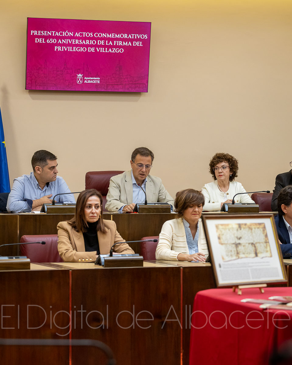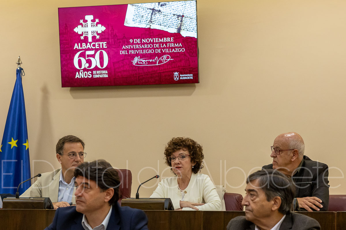 El alcalde Manuel Serrano ha presentado en rueda de prensa las actividades organizadas por el Ayuntamiento para conmemorar el 650 aniversario del Privilegio de Villazgo concedido por el Marqués de Villena a la ciudad Albacete, acompañado por los concejales del Equipo de Gobierno Francisco Navarro, Elena Serrallé, la directora del Archivo Histórico Provincial de Albacete, Elvira Valero de la Rosa, los historiadores Vicente Carrión, Aurelio Pretel, Miguel Lucas, Carlos Ayllón y Esteban Belmonte, así como el presidente de la Asociación Provincial de Empresarios de Hostelería y Turismo, APEHT, David Giménez, los cocineros Juan Monteagudo, Rafa Herreros y Carlos Arjona.