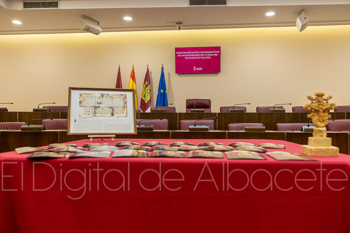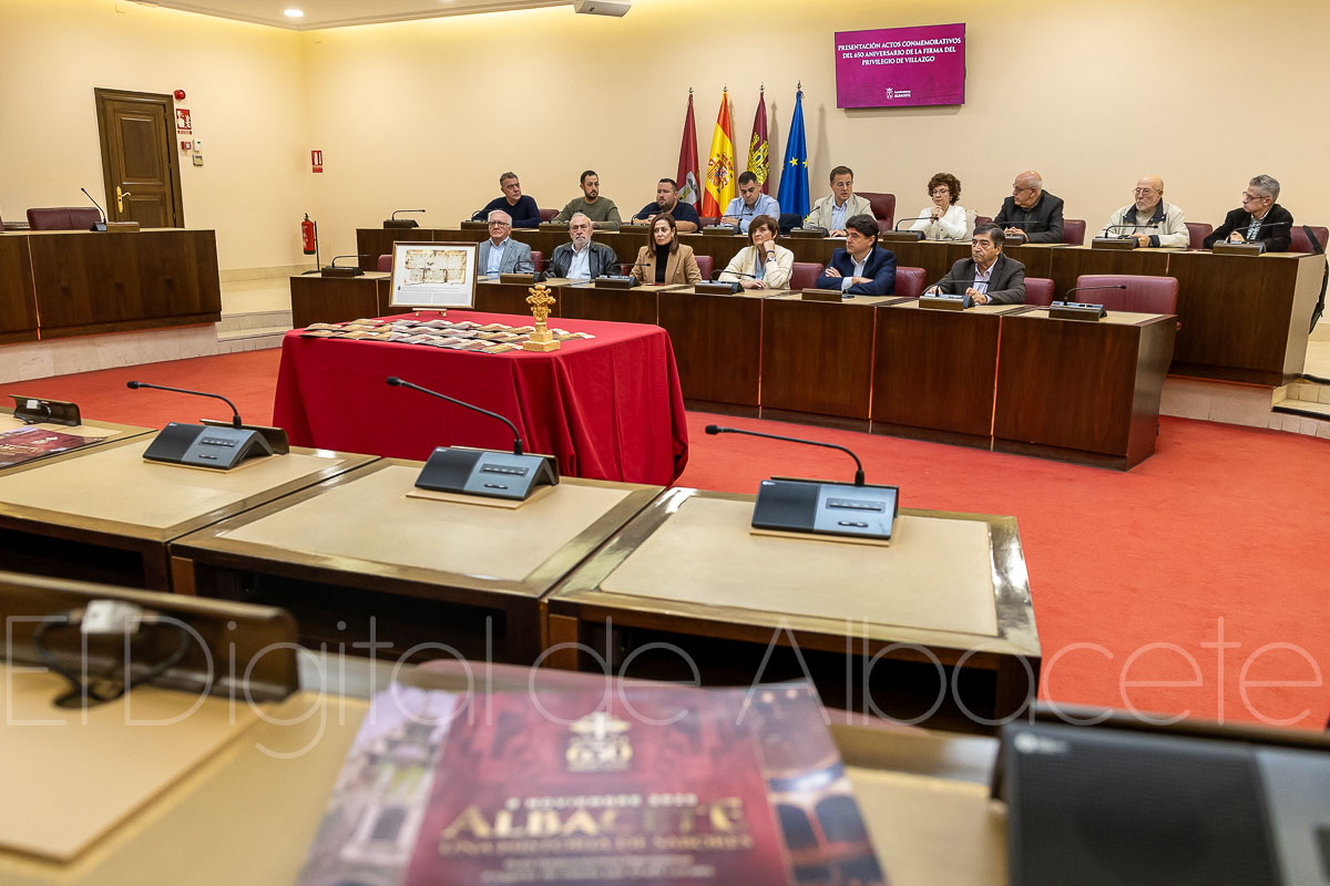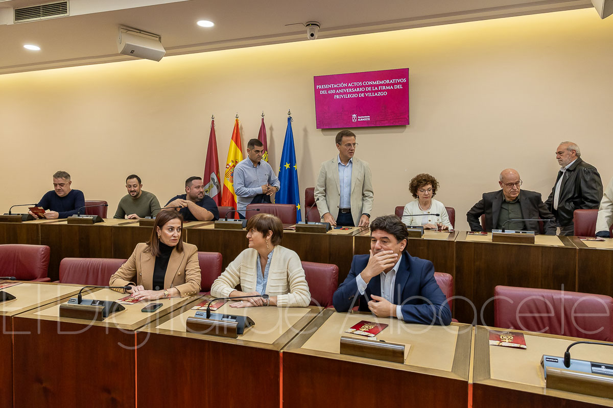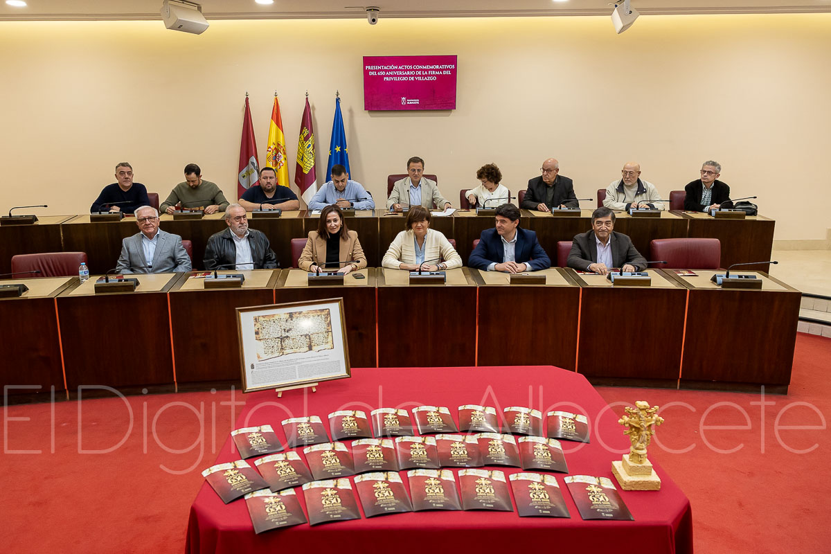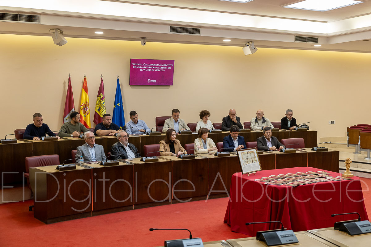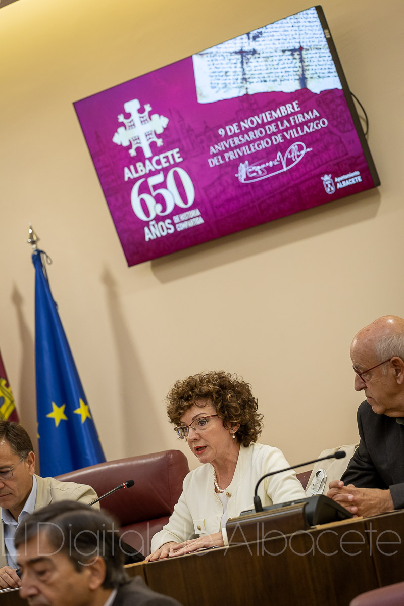 El alcalde Manuel Serrano ha presentado en rueda de prensa las actividades organizadas por el Ayuntamiento para conmemorar el 650 aniversario del Privilegio de Villazgo concedido por el Marqués de Villena a la ciudad Albacete, acompañado por los concejales del Equipo de Gobierno Francisco Navarro, Elena Serrallé, la directora del Archivo Histórico Provincial de Albacete, Elvira Valero de la Rosa, los historiadores Vicente Carrión, Aurelio Pretel, Miguel Lucas, Carlos Ayllón y Esteban Belmonte, así como el presidente de la Asociación Provincial de Empresarios de Hostelería y Turismo, APEHT, David Giménez, los cocineros Juan Monteagudo, Rafa Herreros y Carlos Arjona.