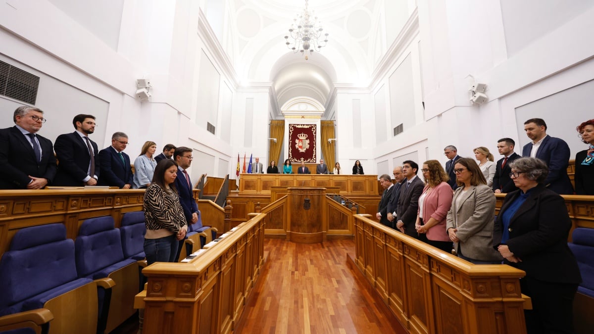 Con todos los diputados regionales presentes -de los tres grupos parlamentarios PSOE, PP y Vox- puestos en pie, así como el presidente autonómico y los miembros del Gobierno que han acudido al salón de plenos para el desarrollo de la sesión plenaria, la Cámara ha permanecido en silencio durante un minuto en homenaje a las víctimas y a sus familiares.
