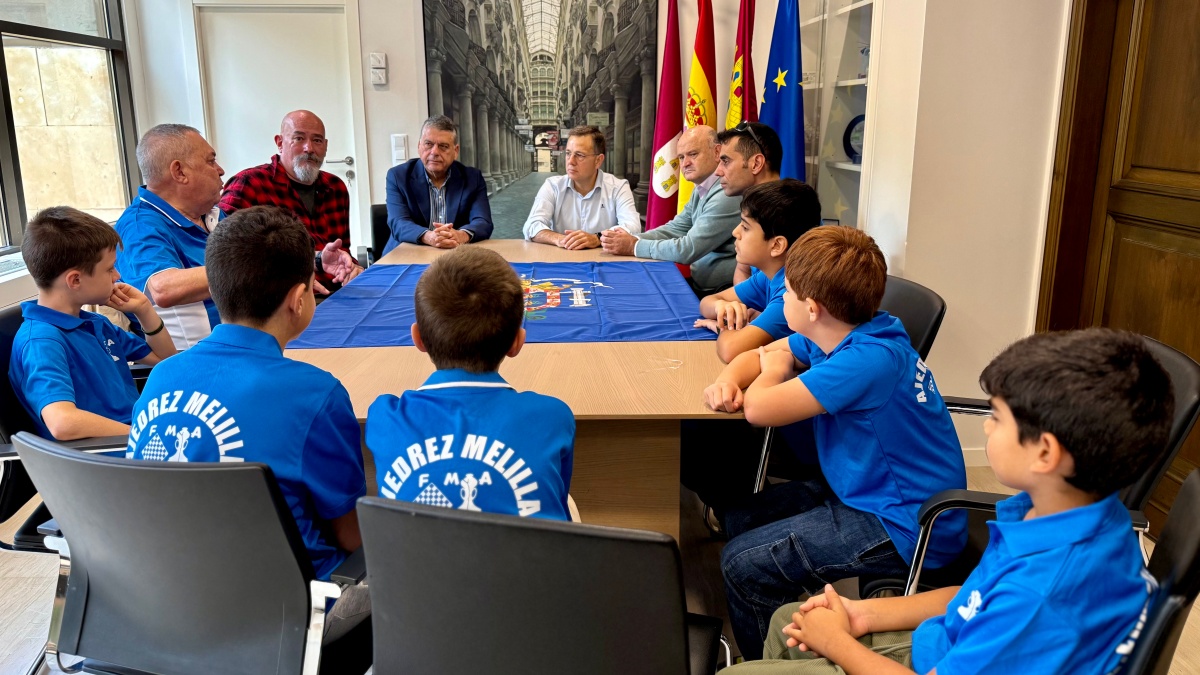 El alcalde Manuel Serrano ha recibido en el Ayuntamiento al presidente del Federación Española de Ajedrez, Francisco Javier Ochoa de Echagüen Estibález, quien venía con los responsables federativos de Castilla-La Mancha, Facundo Castelli, y de Melilla, José Francisco García Ávila, acompañado de un grupo de chavales ajedrecistas melillenses.
