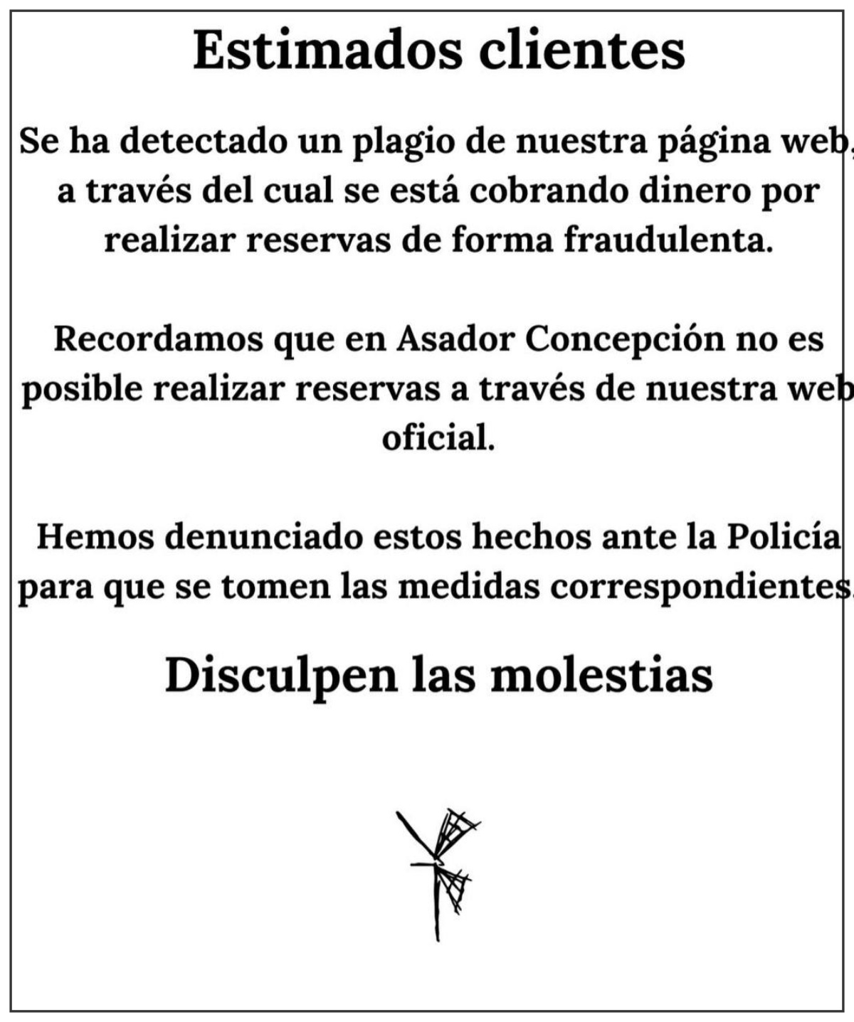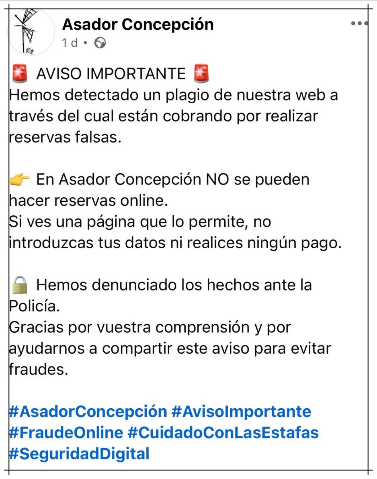 Una situación que ya está en manos de la Policía, como indican desde la dirección del restaurante. Por ello, desde Asador Concepción aclaran a sus clientes que en este restaurante “no se pueden hacer reservas online y que si ves una página web que te lo permite, no introduzcas tus datos ni realices ningún pago”.