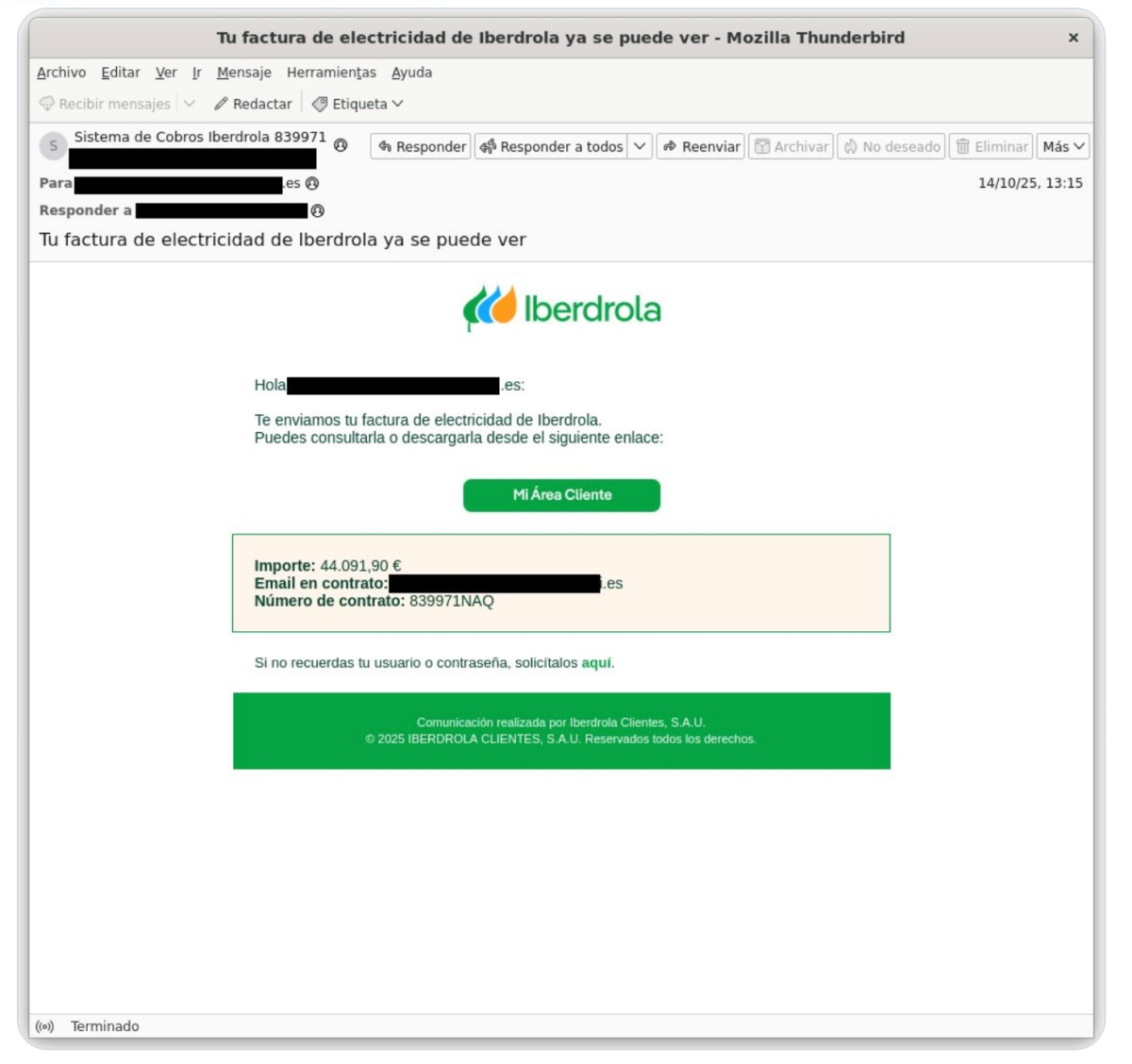 Así, la Guardia Civil ha explicado que los ciberdelincuentes informan, haciéndose pasar por esta empresa, de que “puedes consultar y descargar tu factura desde un enlace que supuestamente te lleva al Área Cliente”, replicando exactamente los correos que llegan a sus clientes cada mes con la factura de electricidad.