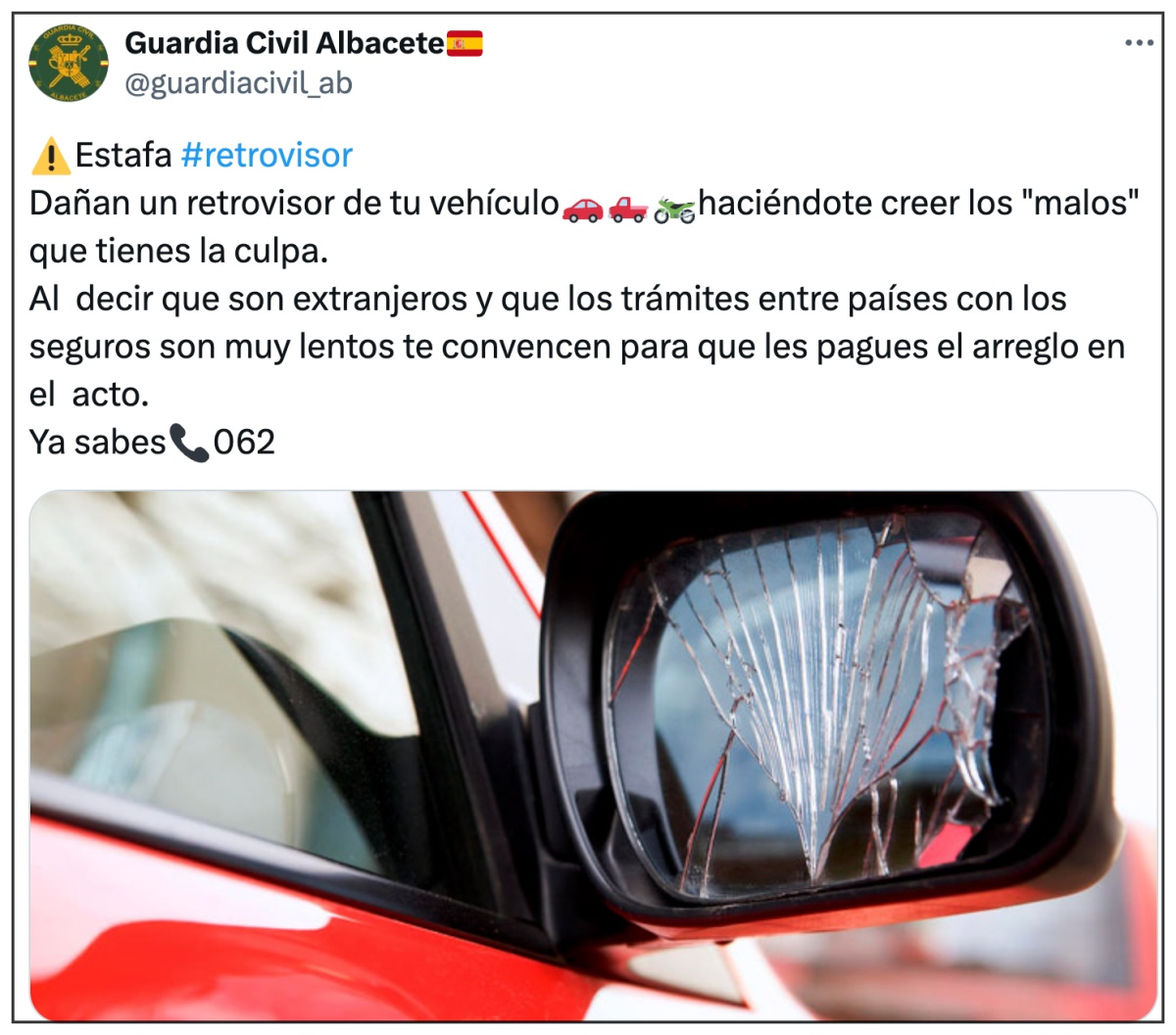 Así, la Guardia Civil de Albacete alerta sobre este fraude que funciona de la siguiente manera: “Dañan un retrovisor de tu vehículo, haciéndote creer que tienes la culpa”, tal y como señala la Benemérita a través de su perfil en X (antes Twitter), y manifiestan que “dicen que son extranjeros y que los trámites entre países con los seguros son muy lentos”. Así, tratan de convencerte para que “les pagues el arreglo del desperfecto en el acto”.