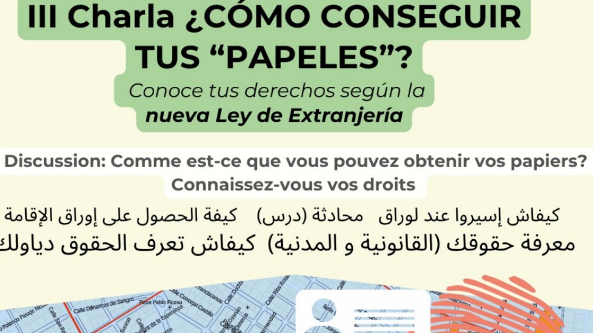 Este próximo martes, 11 de noviembre, el Centro Sociocultural Ensanche acogerá una charla dirigida a personas migrantes sobre el proceso para conseguir la documentación pertinente para regularizar su situación, tal y como se puede ver en su cartel anunciador. La iniciativa busca ofrecer información clara y práctica sobre los trámites legales y los derechos de las personas que se encuentran en España y desean obtener estos documentos.