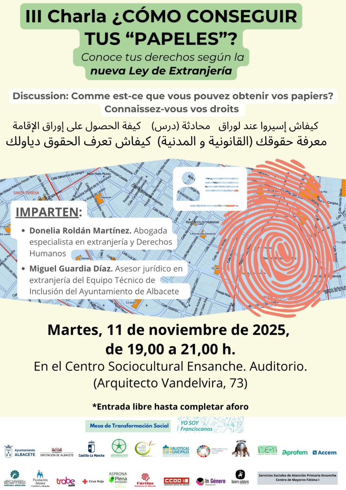 La charla forma parte de la Mesa de Transformación Social, con la colaboración también de ‘Yo soy Franciscanos’. Del mismo modo, estará impartida por Donelia Roldán, abogada especialista en extranjería y Derechos Humanos; y Miguel Guardia, asesor jurídico en extranjería del Equipo Técnico de Inclusión del Ayuntamiento de Albacete.