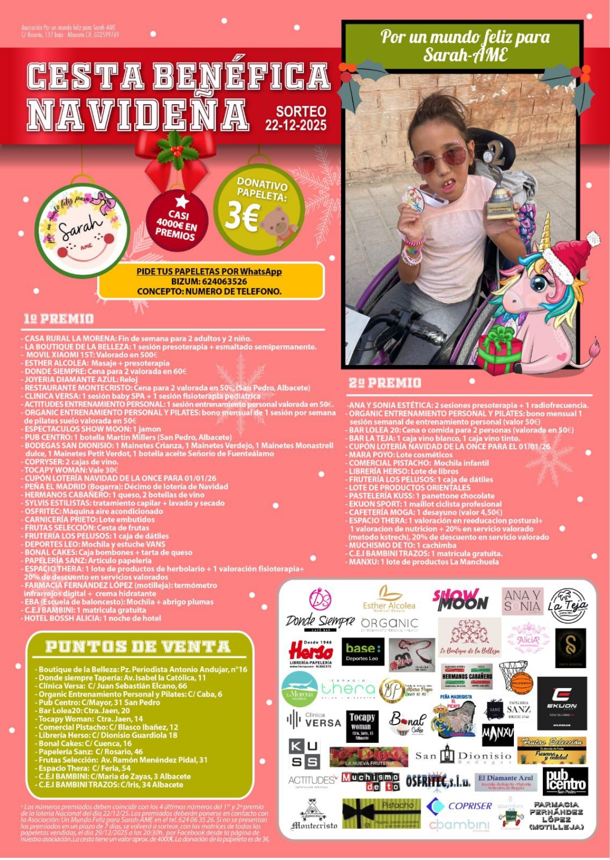 Cada papeleta para poder participar en el sorteo de esta especial Cesta Benéfica Solidaria “es de un donativo de 3 euros”, que irán destinados a ayudar a esta pequeña de Albacete. Al respecto, incidía la madre de esta niña albaceteña que este pequeño donativo “supone un mundo para nosotras y para que Sarah pueda seguir costeando las terapias y adaptaciones que necesita”.