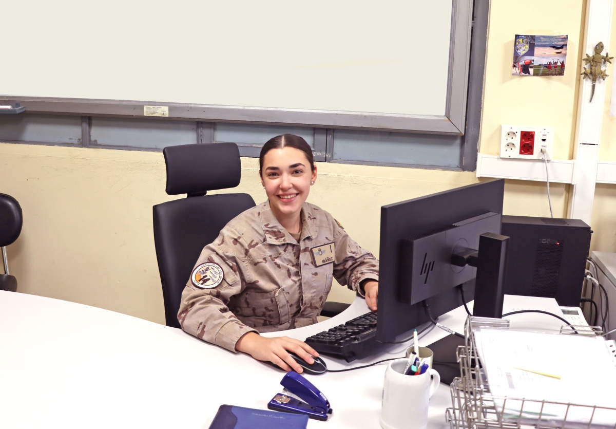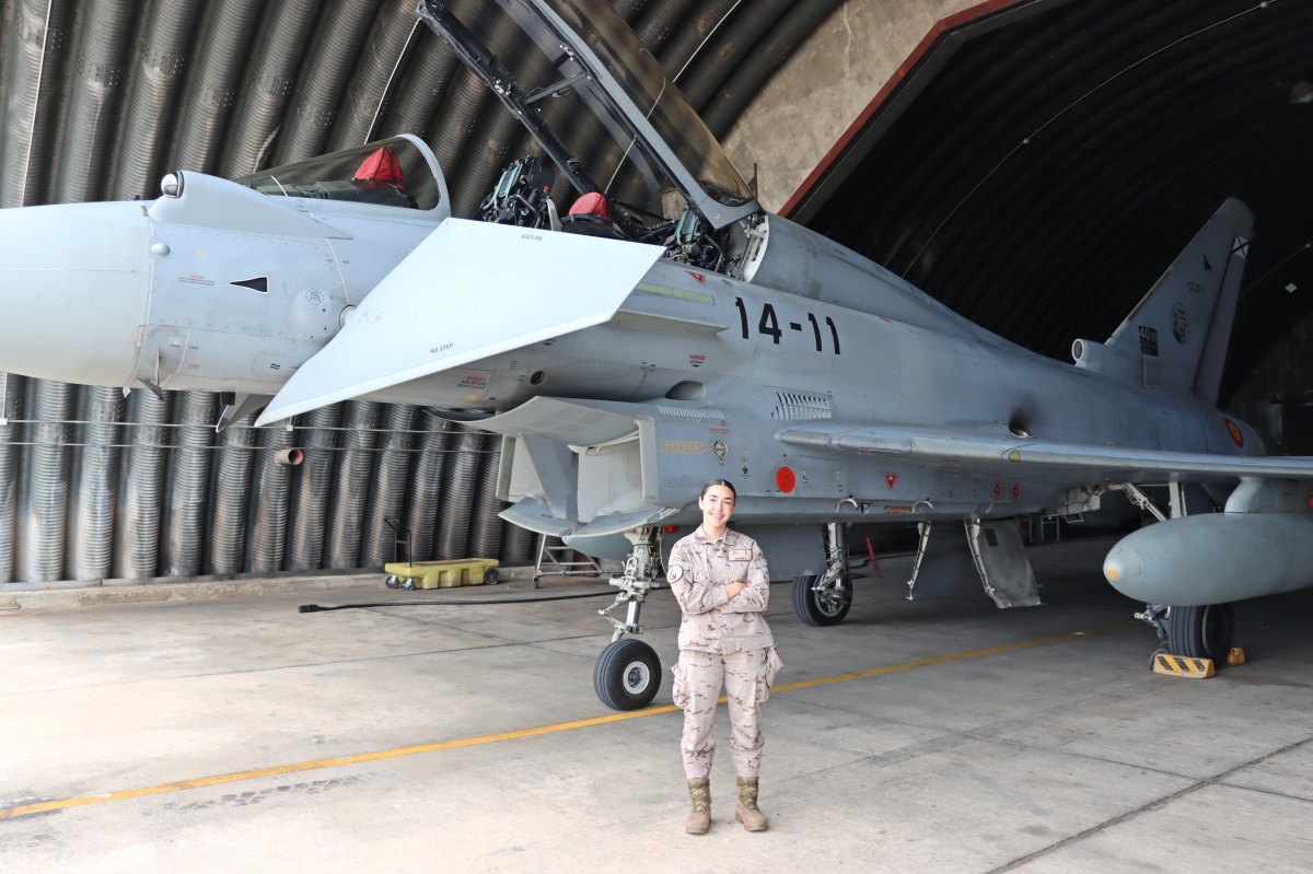 Actualmente, la benjamina del Ala 14 de Albacete trabaja en el Escuadrón de Abastecimiento, donde realiza su labor dedicada a “la gestión y el mantenimiento de lo relacionado al armamento aéreo”. “Todo el armamento que está en la Base pasa por nosotros o bien para mantenimiento o para enviarlo a otras unidades”, explica, y detalla que “como acabo de entrar recientemente, por ahora estoy aprendiendo y formándome bien sobre todo el sistema de armas del Eurofighter”.