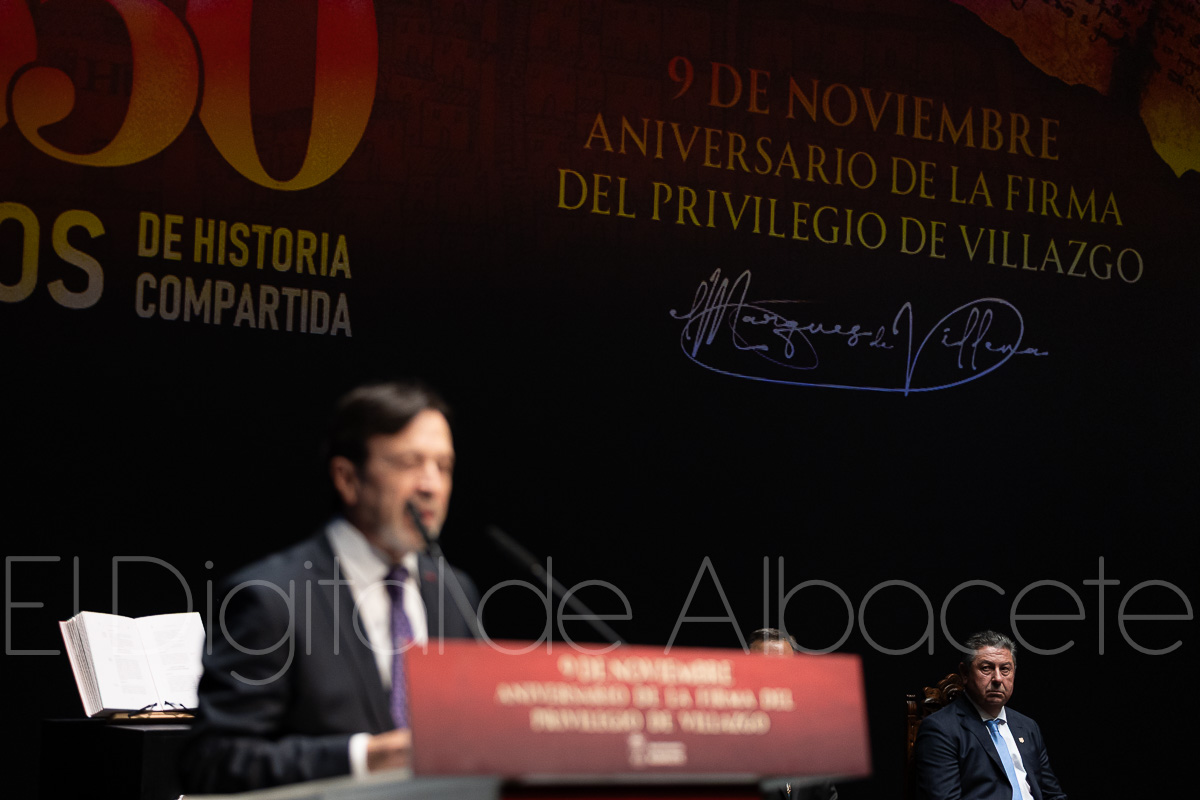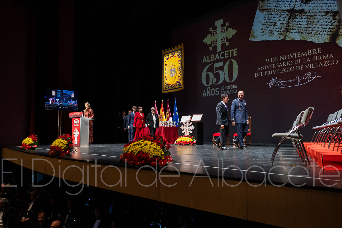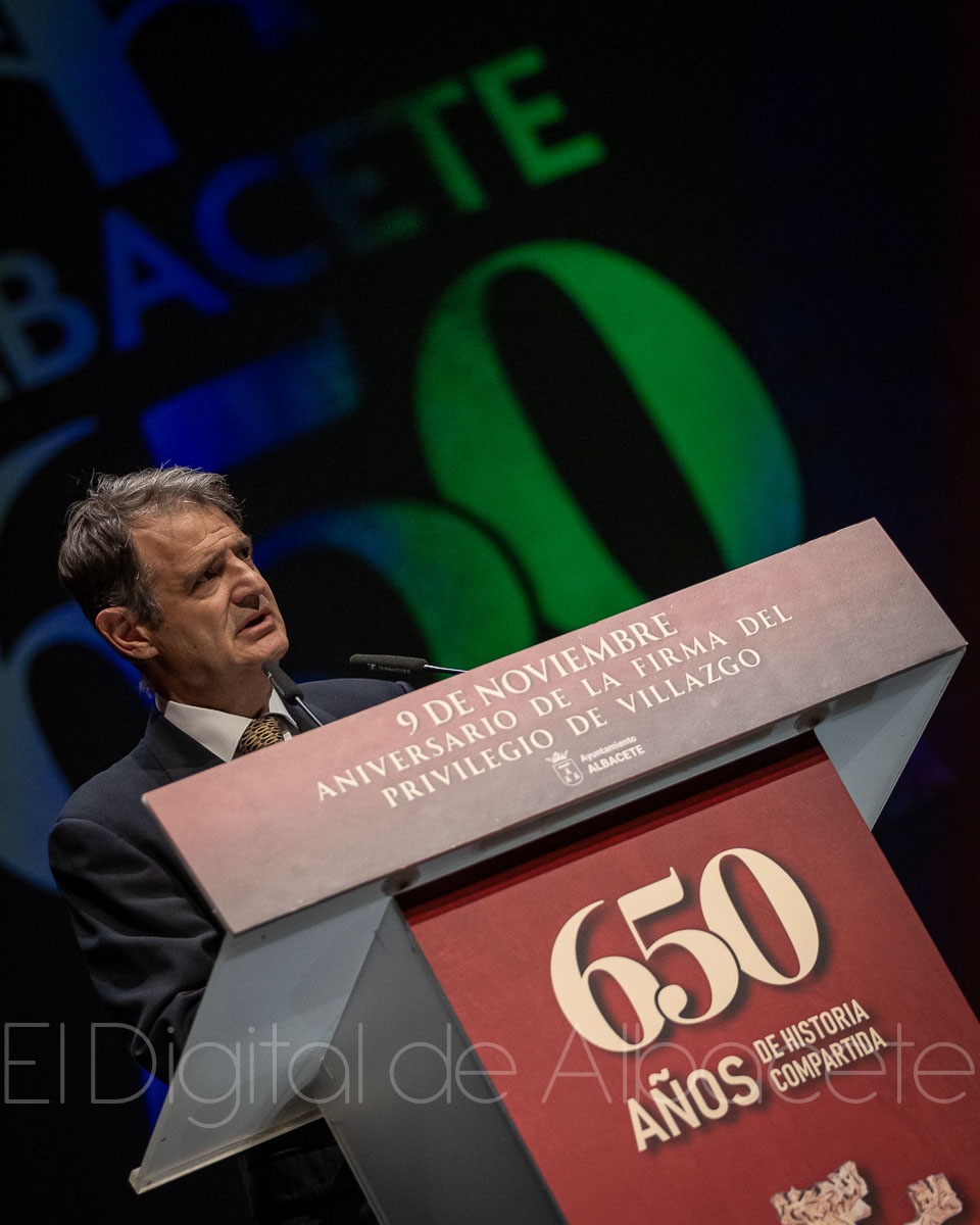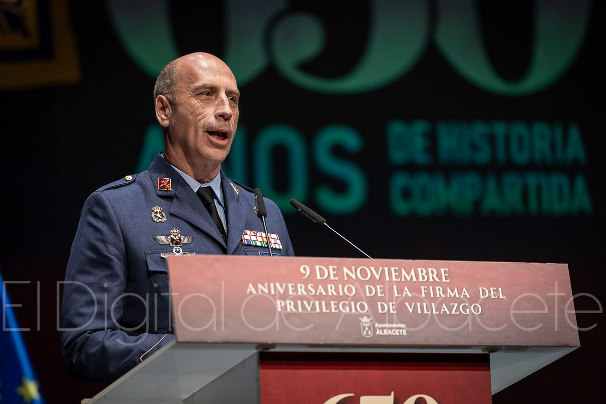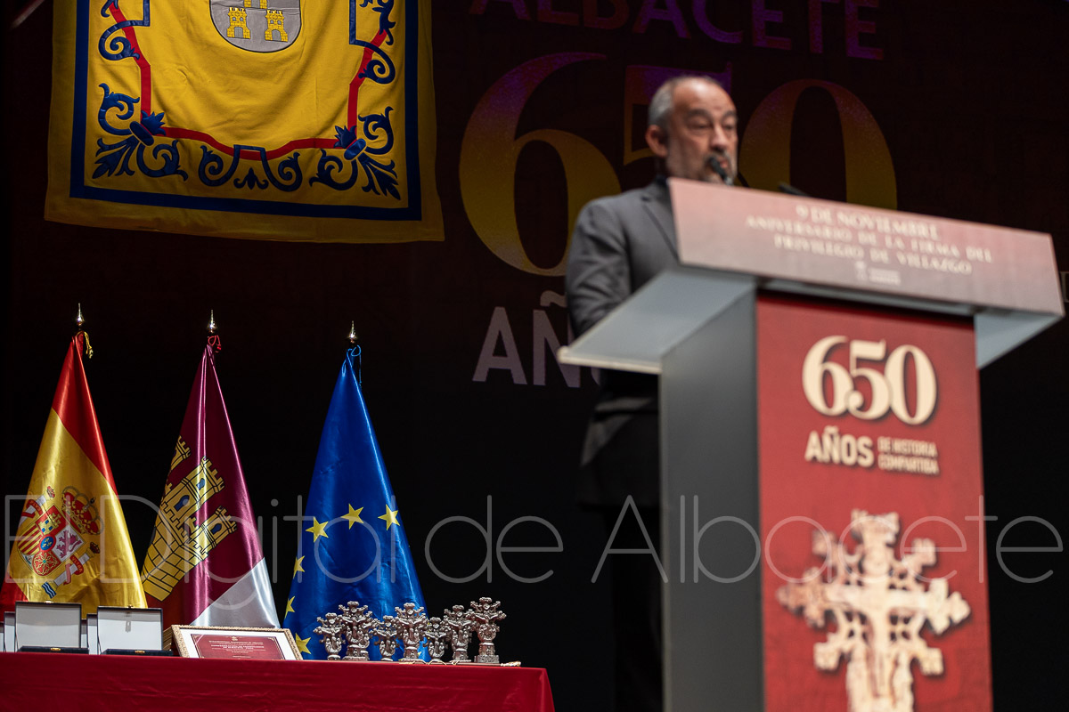 El alcalde de la ciudad, Manuel Serrano, destacaba sobre la firma del Privilegio de Villazgo que fue “un hito fundacional de Albacete y una efeméride que hoy celebramos con sencillez, pero también con orgullo”. En la misma línea, ponía en valor a los protagonistas de la jornada, que han recibido las Medallas de Oro de la ciudad y al Mérito Municipal, manifestando que son “lo mejor de nuestra historia reciente en diversos aspectos: el ámbito económico, con la Medalla a nuestros empresarios, que se esfuerzan e innovan para crear riqueza y empleo; el ámbito educativo, con el reconocimiento a la Universidad, que ha sido un verdadero revulsivo y un vivero de formación superior y también de investigación; el ámbito sanitario, representado por el Colegio Médicos, que es un símbolo de compromiso y atención sanitaria para el bienestar de todos; y el ámbito de las Fuerzas Armadas, modelo de modernidad, de sacrificio y de cercanía a los ciudadanos, que han elevado a lo más alto las expectativas de Albacete, gracias a la presencia de la Base Aérea y del Ejército del Aire”