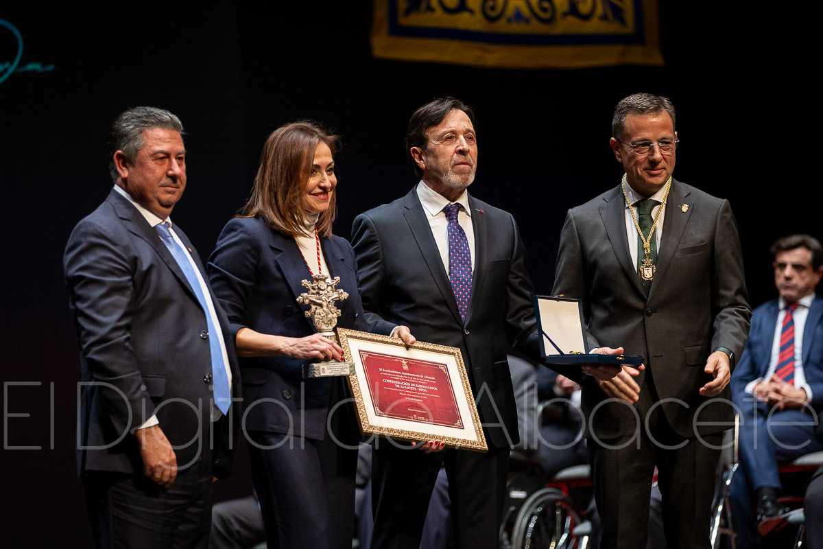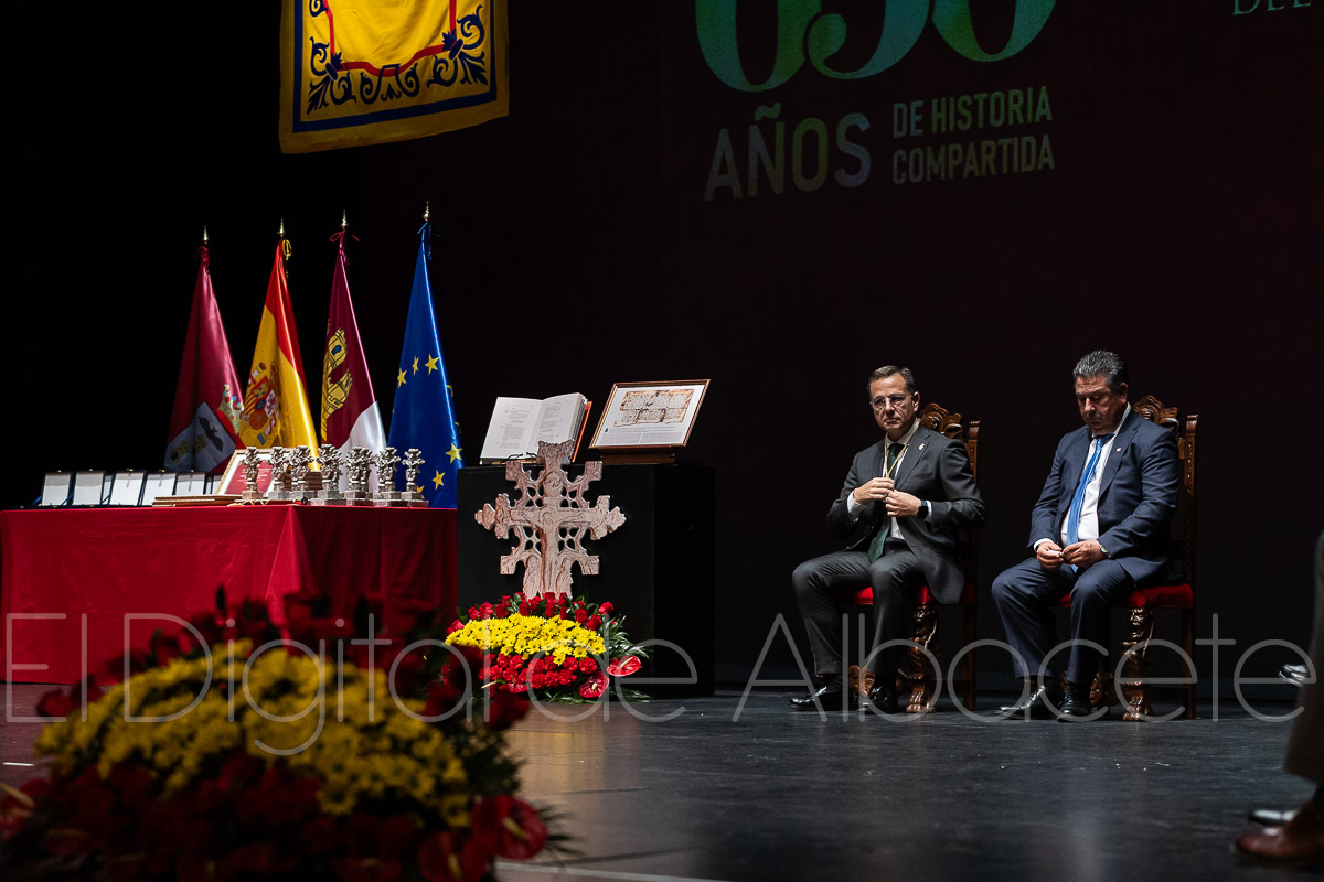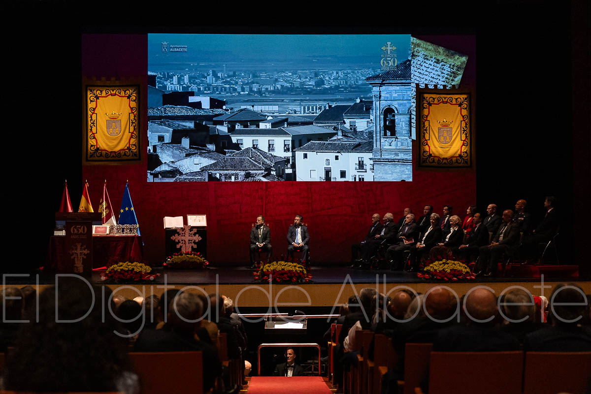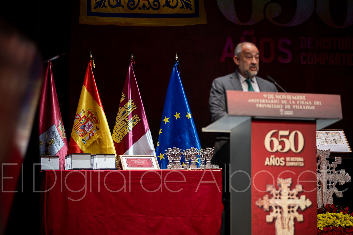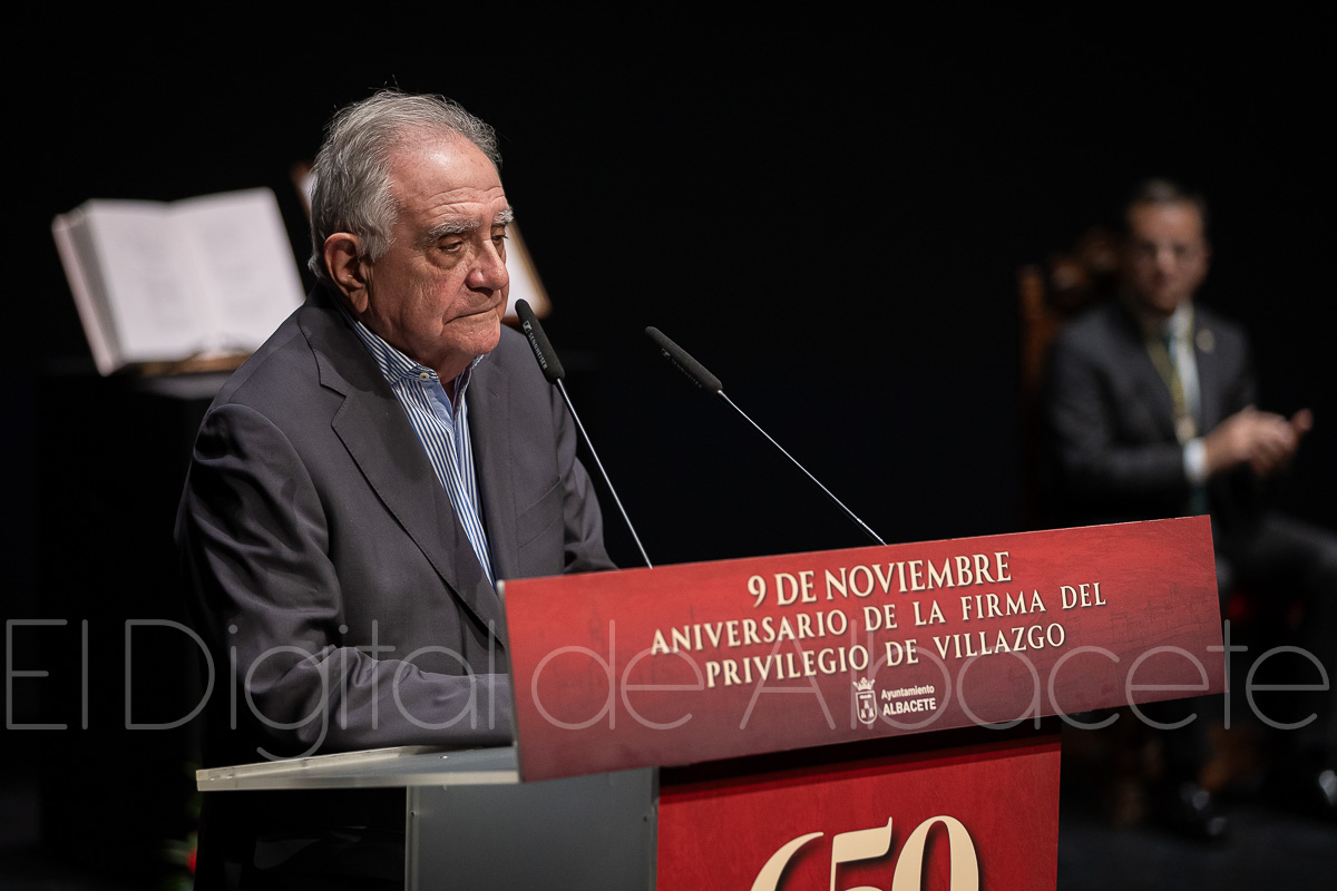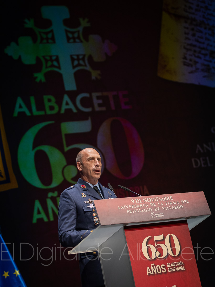 El alcalde de la ciudad, Manuel Serrano, destacaba sobre la firma del Privilegio de Villazgo que fue “un hito fundacional de Albacete y una efeméride que hoy celebramos con sencillez, pero también con orgullo”. En la misma línea, ponía en valor a los protagonistas de la jornada, que han recibido las Medallas de Oro de la ciudad y al Mérito Municipal, manifestando que son “lo mejor de nuestra historia reciente en diversos aspectos: el ámbito económico, con la Medalla a nuestros empresarios, que se esfuerzan e innovan para crear riqueza y empleo; el ámbito educativo, con el reconocimiento a la Universidad, que ha sido un verdadero revulsivo y un vivero de formación superior y también de investigación; el ámbito sanitario, representado por el Colegio Médicos, que es un símbolo de compromiso y atención sanitaria para el bienestar de todos; y el ámbito de las Fuerzas Armadas, modelo de modernidad, de sacrificio y de cercanía a los ciudadanos, que han elevado a lo más alto las expectativas de Albacete, gracias a la presencia de la Base Aérea y del Ejército del Aire”