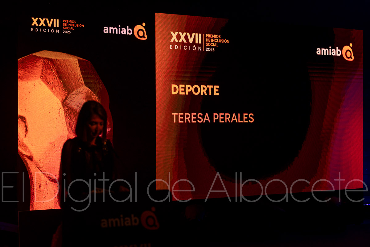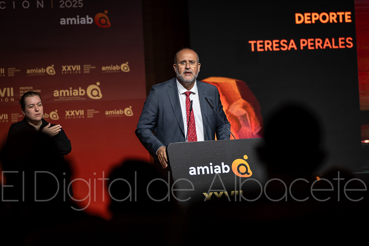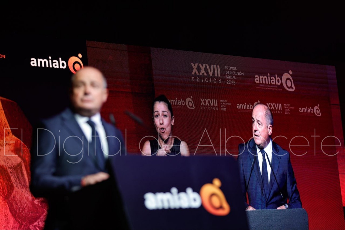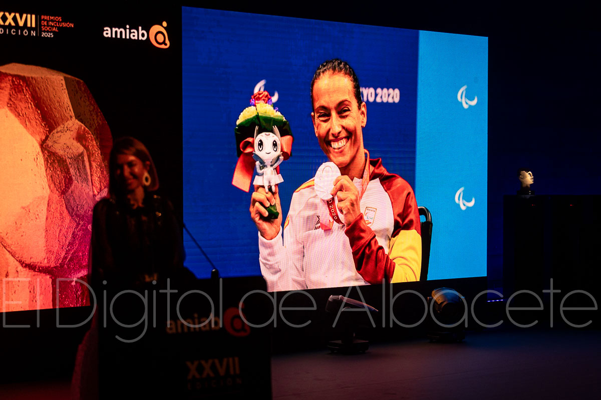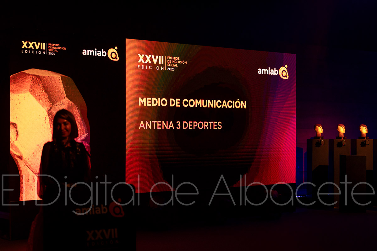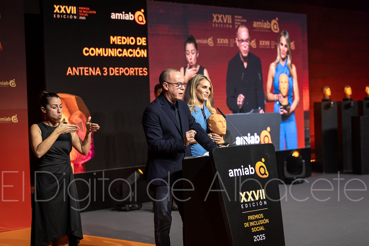 El Palacio de Congresos de Albacete acogía en la noche de este lunes, 10 de noviembre, la XXVII edición de los Premios de Inclusión Social de Amiab. Unos tradicionales galardones que en esta ocasión han sido para Antena 3 Deportes, el Congreso de los Diputados, el Comité Español de Representantes de Personas con Discapacidad (CERMI), Grupo Rujamar, la deportista Teresa Perales, el Servicio Público de Empleo Estatal (SEPE), la Asociación de Familias de Niños con Cáncer de Castilla-La Mancha AFANION, la Federación de Deportes para Personas con Discapacidad Intelectual de Castilla-La Mancha (FECAM), y Asociación para la actividad física y deporte adaptado ‘Metasport CLM’.