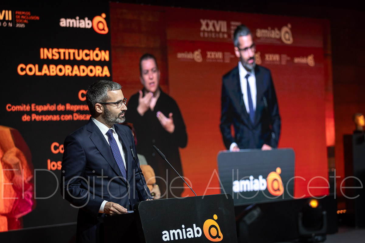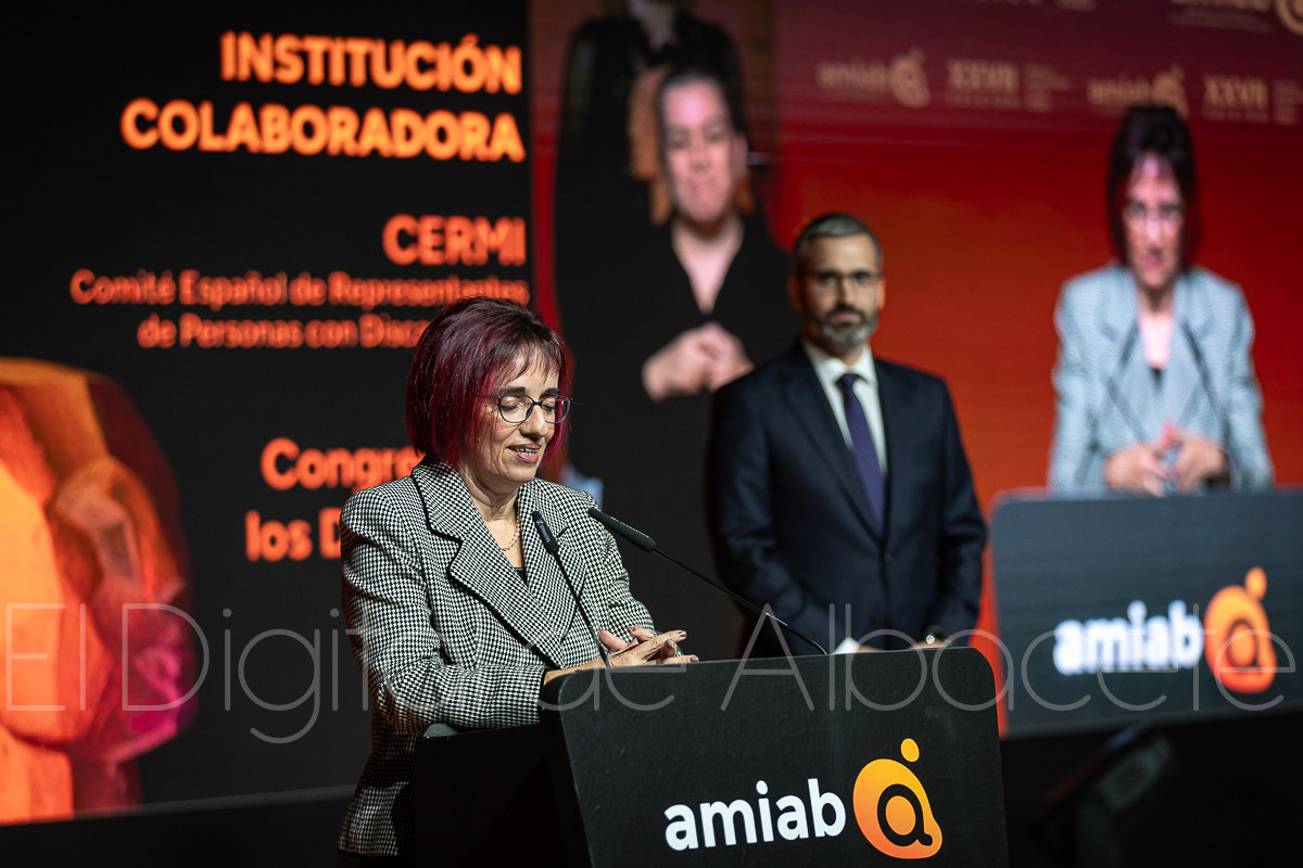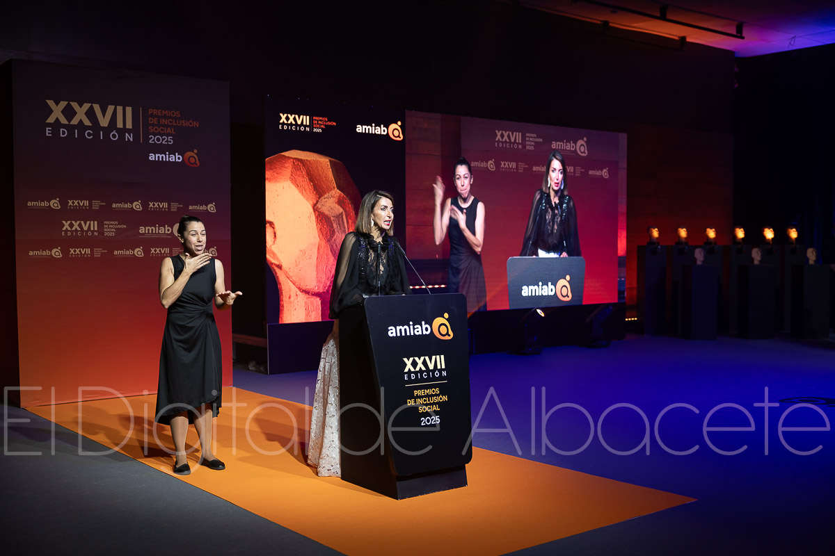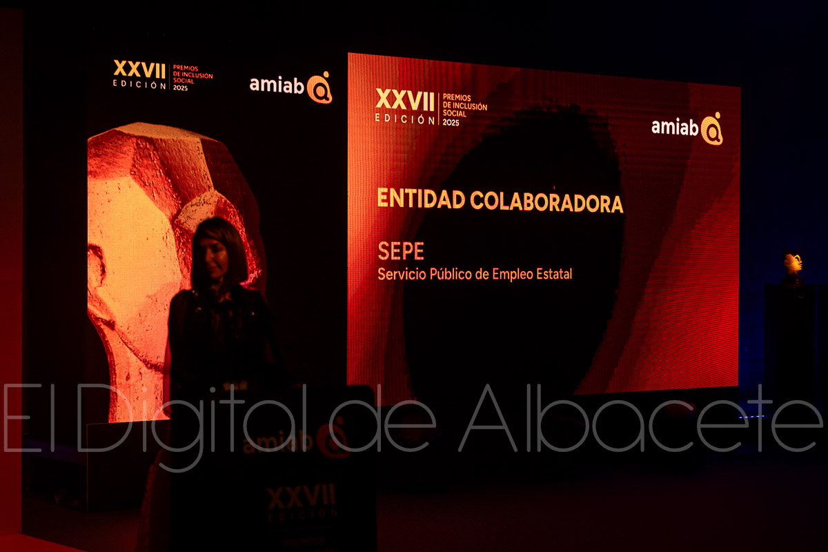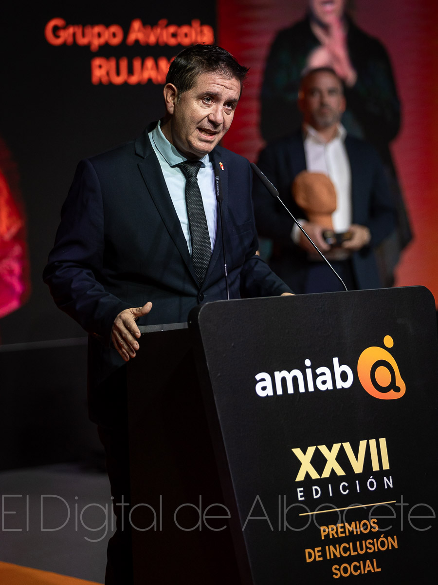El Palacio de Congresos de Albacete acogía en la noche de este lunes, 10 de noviembre, la XXVII edición de los Premios de Inclusión Social de Amiab. Unos tradicionales galardones que en esta ocasión han sido para Antena 3 Deportes, el Congreso de los Diputados, el Comité Español de Representantes de Personas con Discapacidad (CERMI), Grupo Rujamar, la deportista Teresa Perales, el Servicio Público de Empleo Estatal (SEPE), la Asociación de Familias de Niños con Cáncer de Castilla-La Mancha AFANION, la Federación de Deportes para Personas con Discapacidad Intelectual de Castilla-La Mancha (FECAM), y Asociación para la actividad física y deporte adaptado ‘Metasport CLM’.