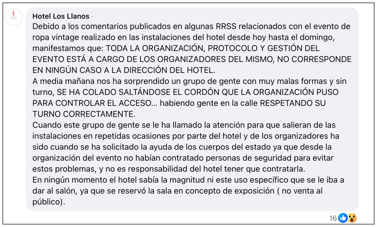 En la misma línea que las expuestas por esta persona, otras muchas han criticado a través de redes sociales lo ocurrido, tanto que el propio Hotel Los Llanos ha publicado un comunicado al respecto en Facebook. El comunicado del hotel dice así: “Debido a los comentarios publicados en algunas redes sociales relacionados con el evento de ropa vintage realizado en las instalaciones del hotel desde el viernes y hasta el domingo, manifestamos que toda la organización, protocolo y gestión del evento está a cargo de los organizadores del mismo, no corresponde en ningún caso a la dirección del hotel. A media mañana nos ha sorprendido un grupo de gente con muy malas formas y sin turno, se ha colado saltándose el cordón que la organización puso para controlar el acceso… habiendo gente en la calle respetando su turno correctamente. Cuando a este grupo de gente se le ha llamado la atención para que salieran de las instalaciones en repetidas ocasiones por parte del hotel y de los organizadores, ha sido cuando se ha solicitado la ayuda de los cuerpos del estado ya que desde la organización del evento no habían contratado personas de seguridad para evitar estos problemas, y no es responsabilidad del hotel tener que contratarla. En ningún momento el hotel sabía la magnitud ni este uso específico que se le iba a dar al salón, ya que se reservó la sala en concepto de exposición ( no venta al público)”.