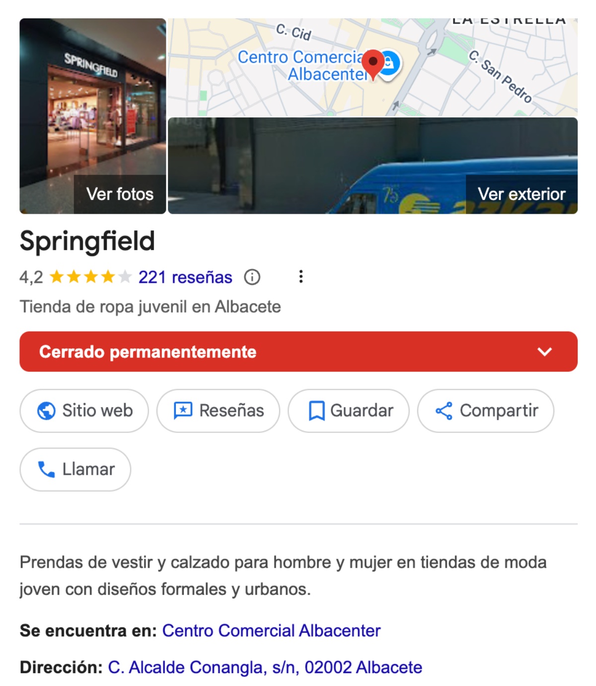 La tienda de Springfield en el centro comercial Albacenter ha bajado definitivamente la persiana. En su puerta puede leerse un cartel en el que la marca informa: «Cierre definitivo. Para cambios, devoluciones u otras gestiones os esperamos en Springfield de la calle Tinte. Sentimos las molestias». Además, en Google el establecimiento ya figura como «cerrado permanentemente».