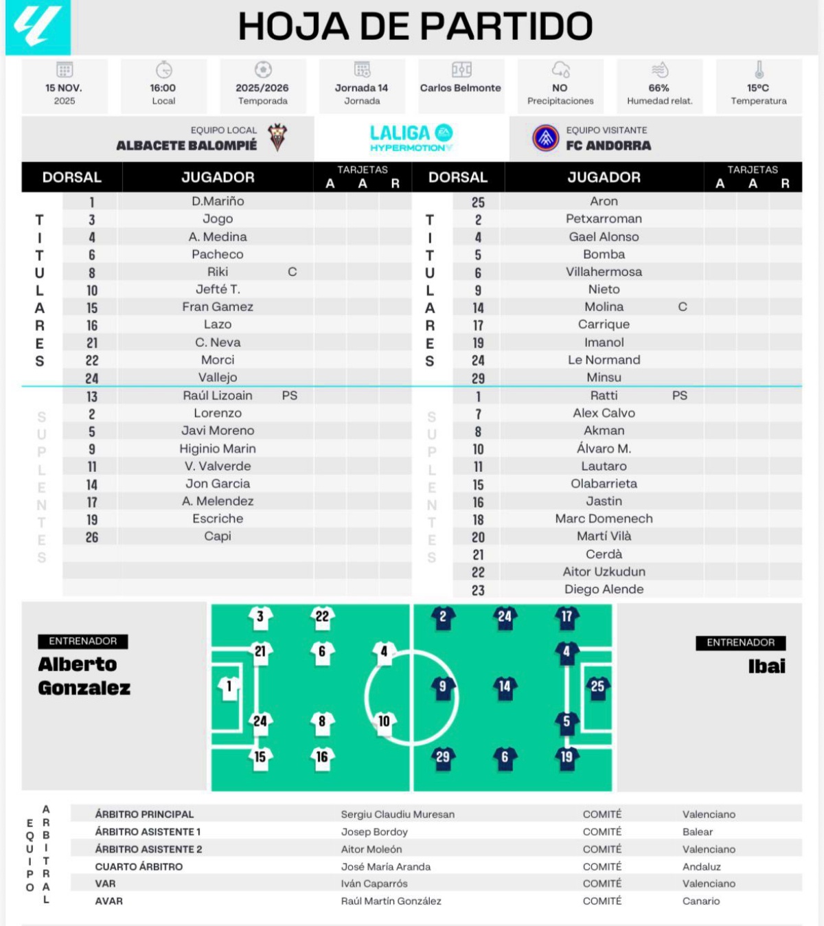 Consumidos los quince minutos de rigor, los protagonistas volvieron al terreno de juego y mientras que el Albacete lo hizo con la misma combinación de mimbres que comenzó el partido, en las filas del Andorra no ocurrió lo mismo, pues Ibai Gómez dejó en la caseta al amonestado Bomba y dio entrada a Diego Alende.