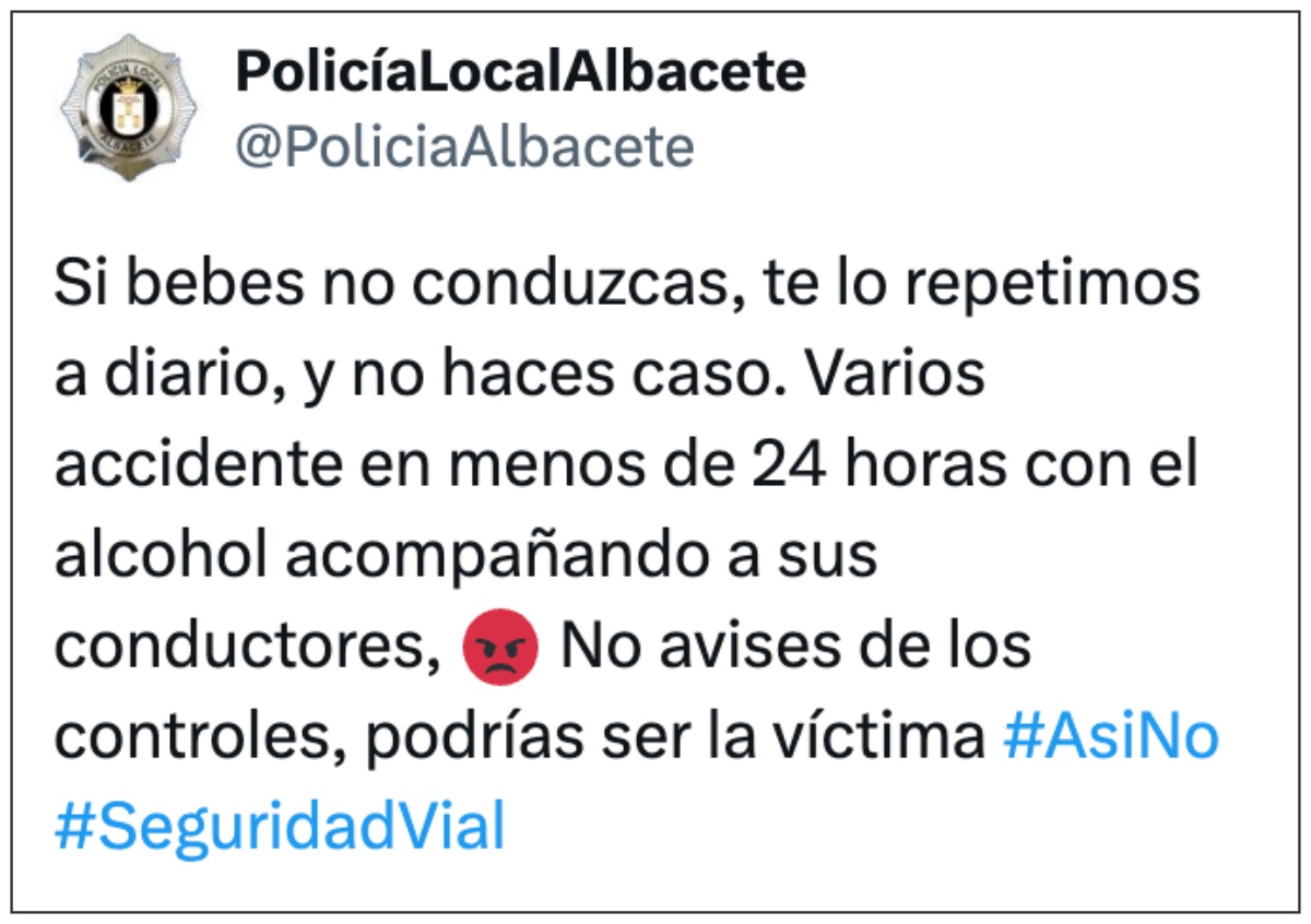 Además, en su mismo mensaje, con un claro “No avises”, la Policía Local de Albacete pide a la ciudadania que no alerte de donde se ubican los controles de alcoholemia que de manera aleatoria instala el cuerpo de seguridad municipal es diversos puntos de la ciudad. No se trata –insisten los agentes– de una cuestión de recaudación, sino de seguridad vial. Cada aviso que señala por dónde no pasar puede estar abriendo una ruta alternativa a un conductor ebrio que, minutos después, provoque un siniestro con consecuencias irreparables.