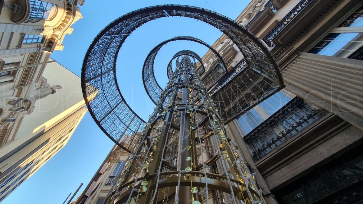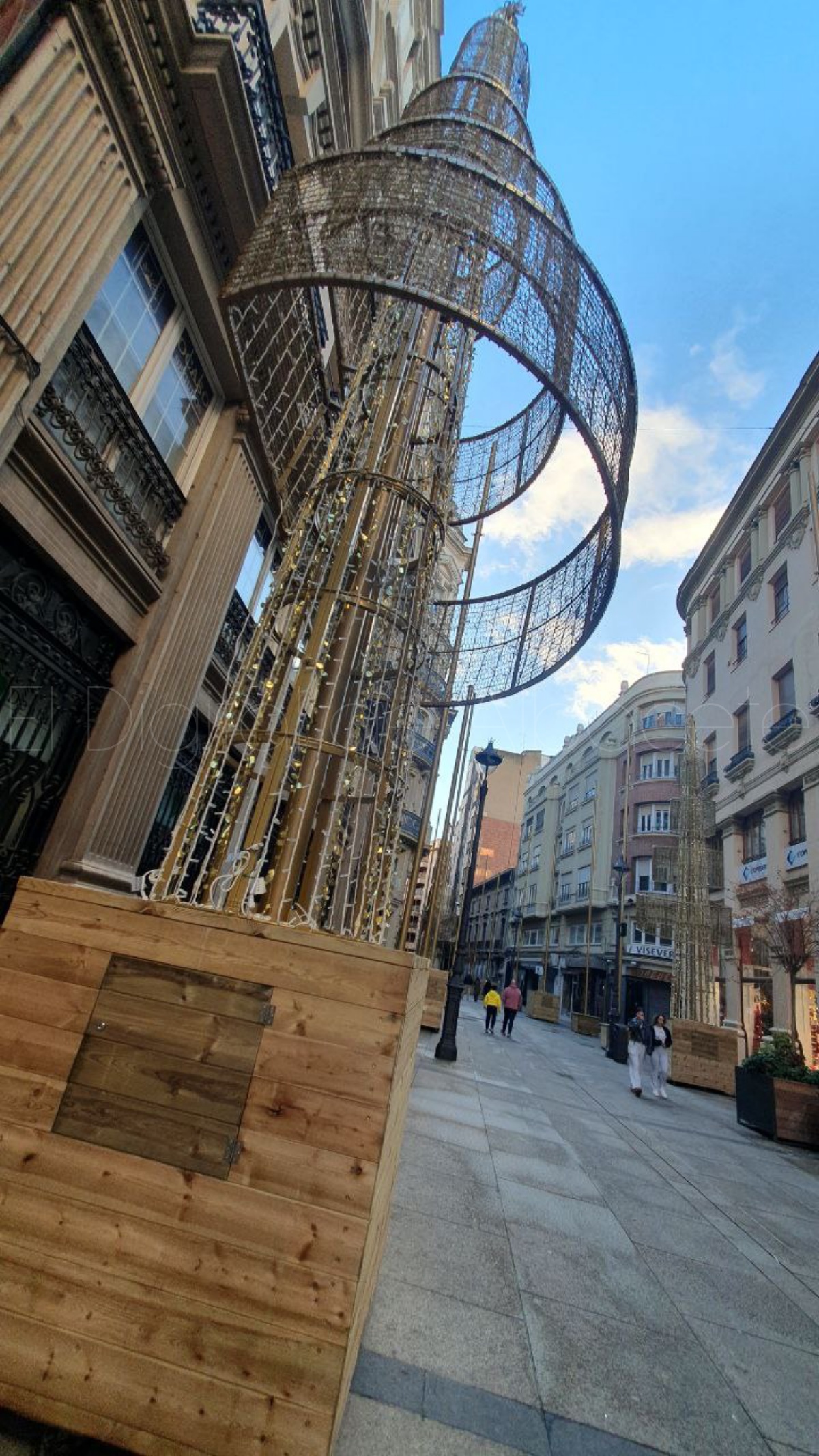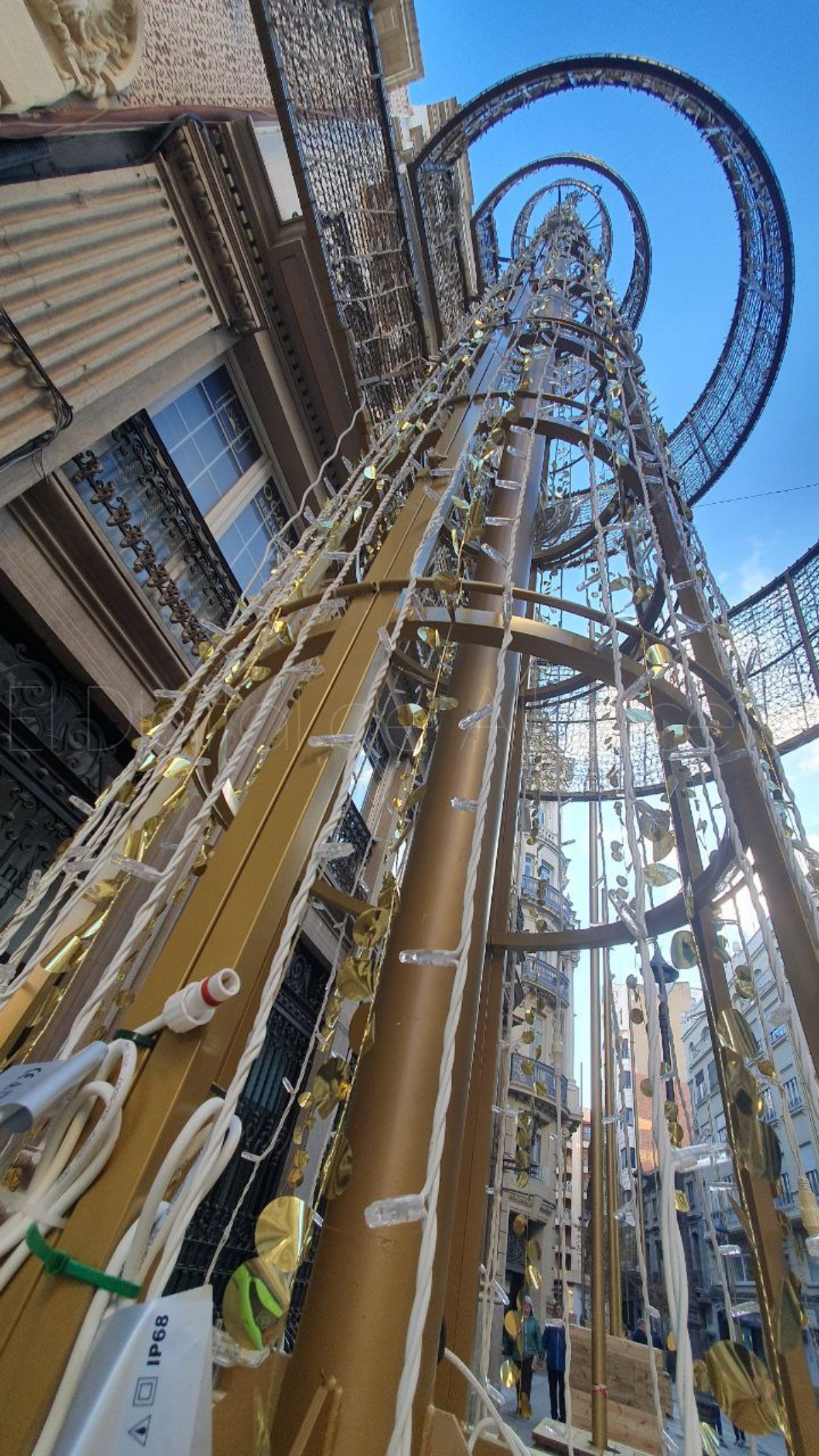 - Formato: 15 árboles-estructura de 11 m de altura y 2,70 m de ancho, lacados en oro y con base de madera, de los que partirán ramales iluminados (efecto “semiparaguas” de ≥8 m) con motivos colgantes (estrellas) RGB de 2 x 2 m.