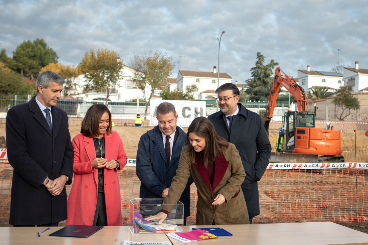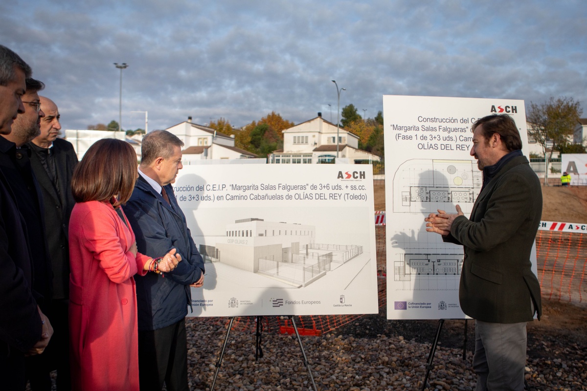 El presidente autonómico, Emiliano García-Page, ha puesto hoy la primera piedra del CEIP ‘Margarita Salas Falgueras’, en la localidad de Olías del Rey, donde ha estado acompañado por el consejero de Educación, Cultura y Deportes, Amador Pastor; el delegado de la Junta en Toledo, Álvaro Gutierrez; y la alcaldesa de la localidad, Charo Navas; entre otros.
