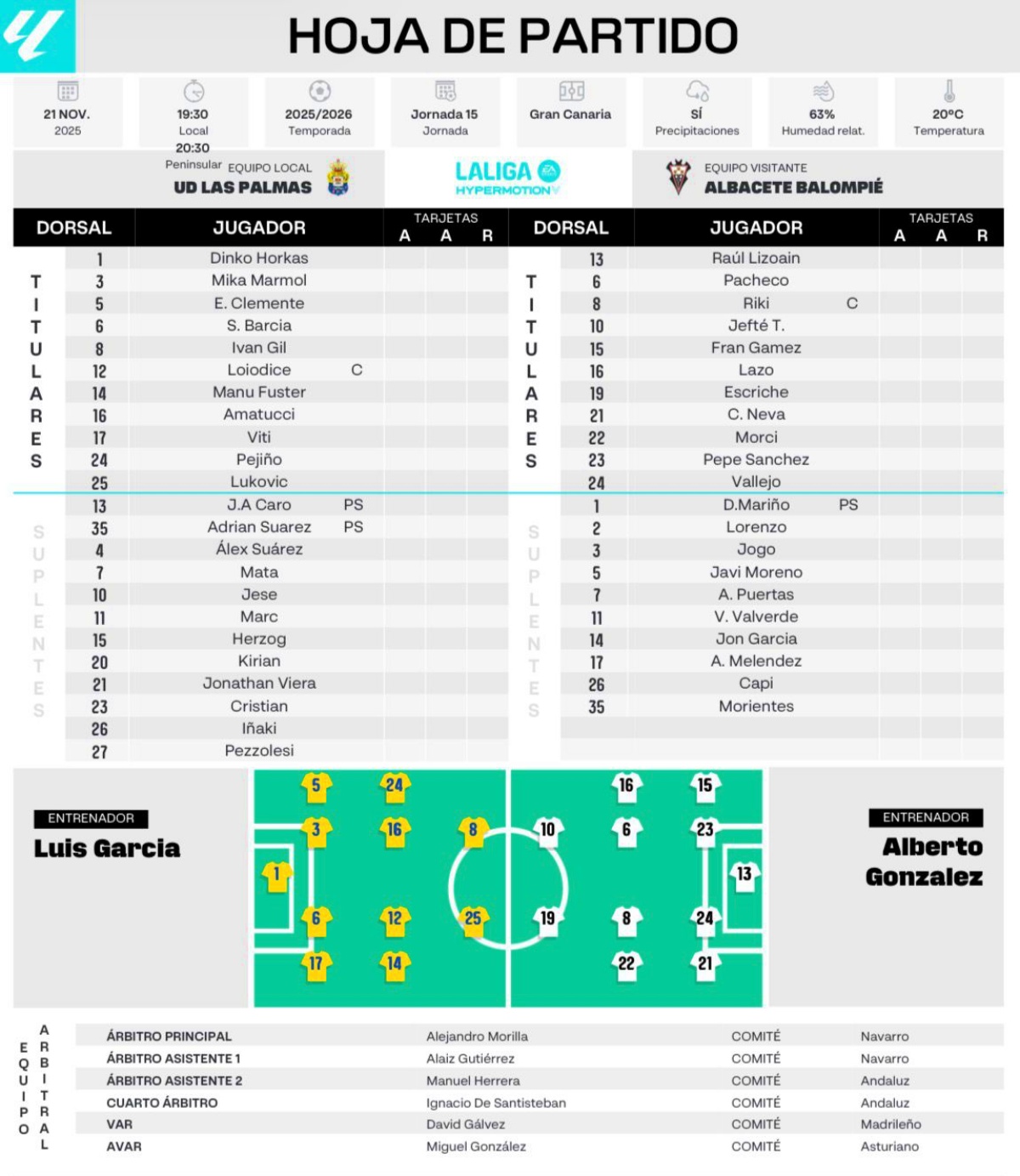 Por parte de la UD Las Palmas, Luis García apostó por un once compuesto por Horkas en portería; Viti, Barcia, Mármol y Clemente, en defensa; Manu Fuster, Loiodice, Amatucci y Pejiño, en el centro del campo; y Lukovic e Iván Gil, en ataque.