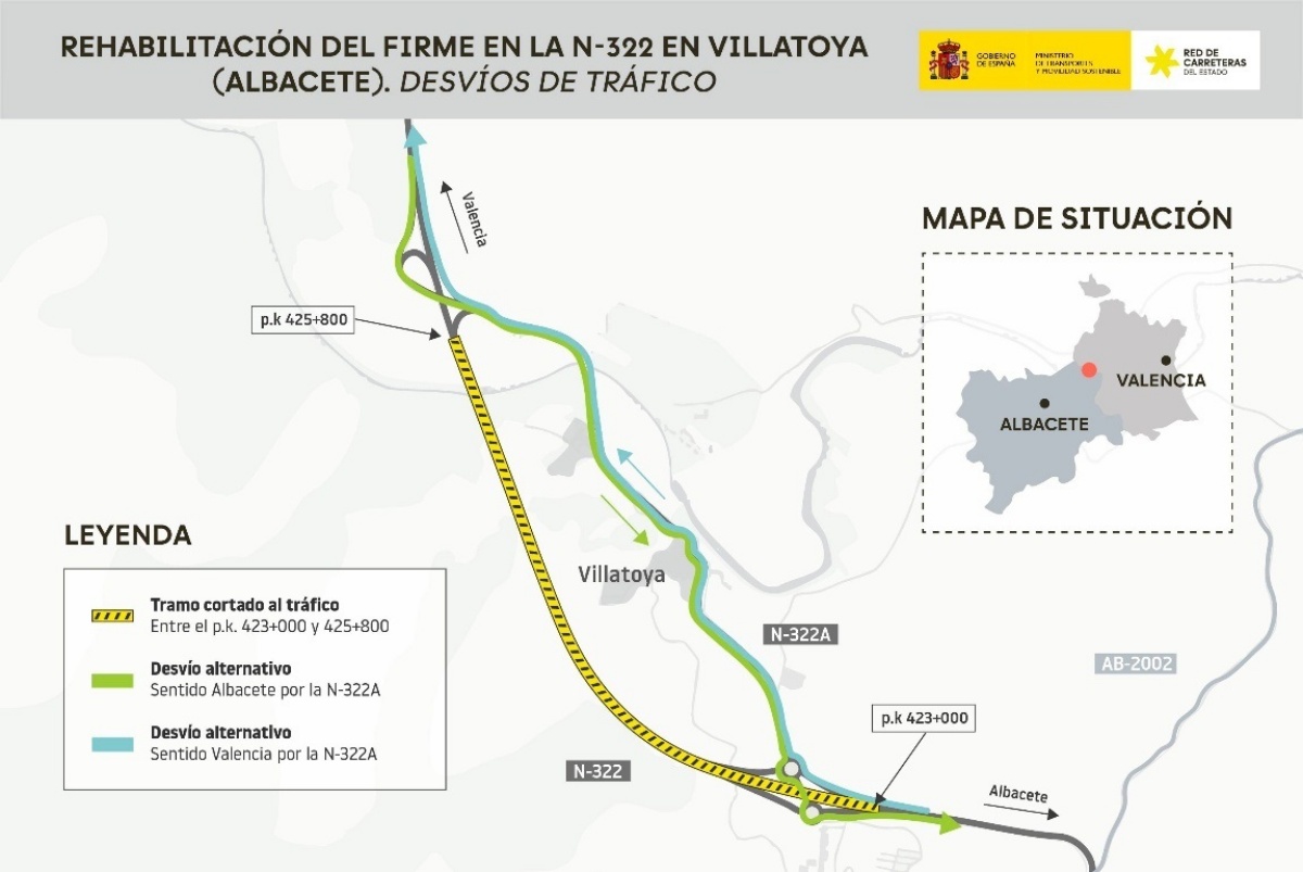 Para asegurar la fluidez del tráfico durante esta operación, se habilitará un itinerario alternativo a través de la N-322A, antigua travesía de Villatoya. En la zona más estrecha de esta antigua travesía se regulará mediante semáforos el paso alternativo de cada sentido.
