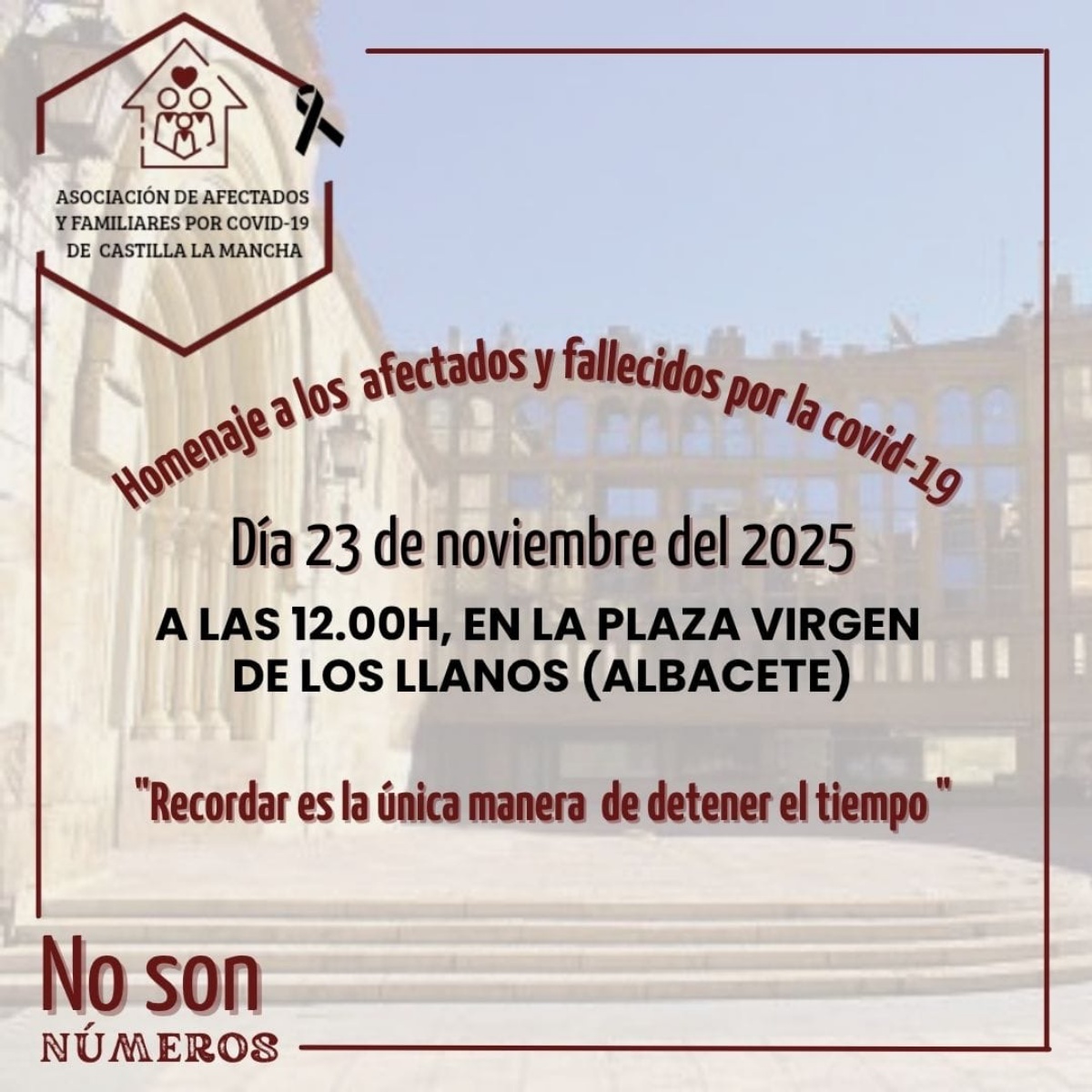 Bajo el lema ‘Recordar es la única de detener el tiempo’ se realizará este especial homenaje a los afectados y fallecidos por el COVID-19 en Albacete. En concreto, la Asociación de Afectados y Familiares por COVID-19 de Castilla-La Mancha desarrollará este acto a partir de las 12:00 horas en la Plaza Virgen de Los Llanos, este domingo, 23 de noviembre.