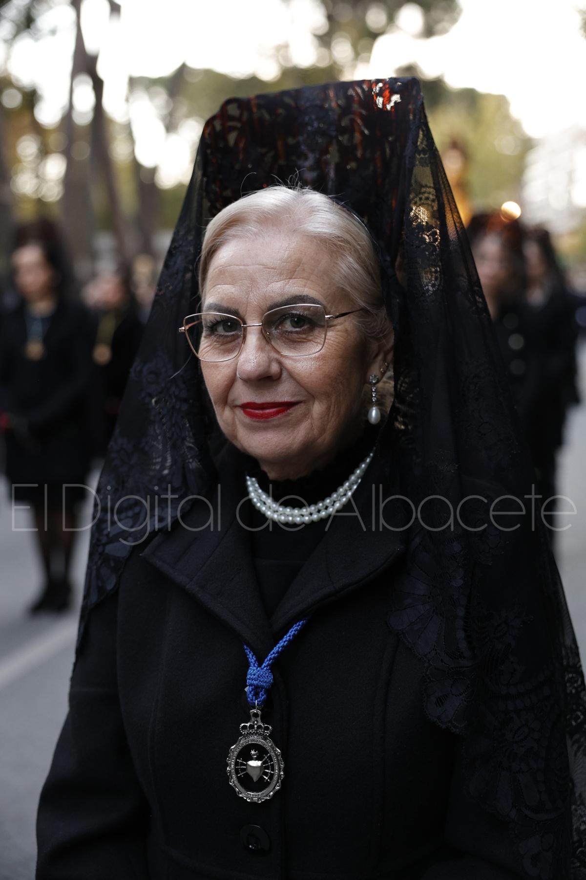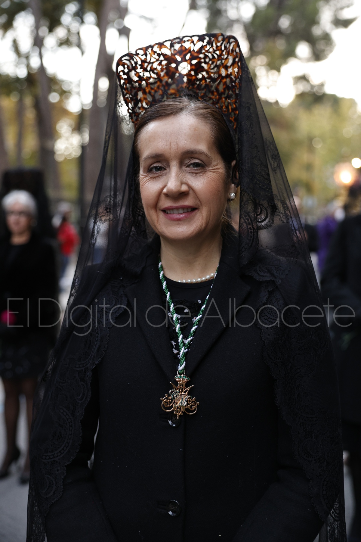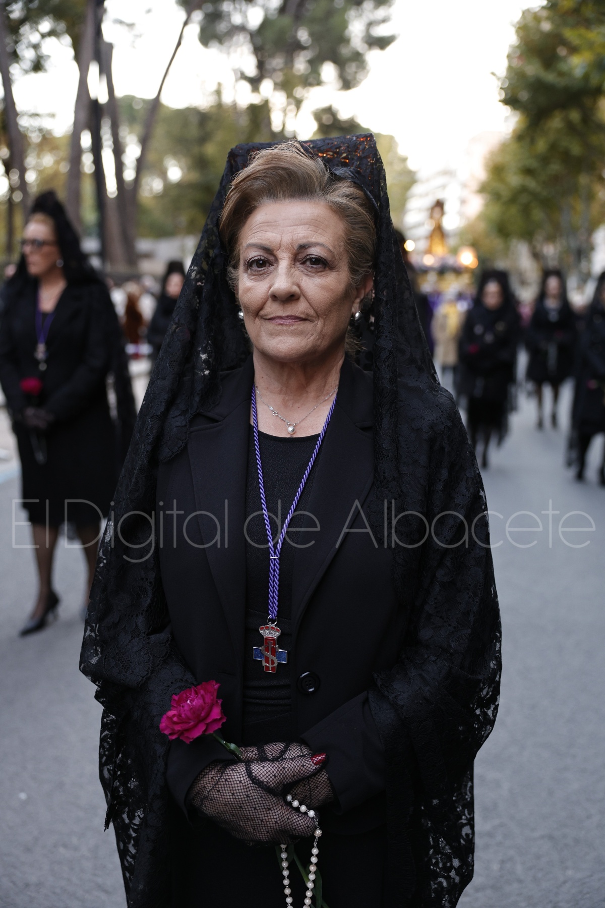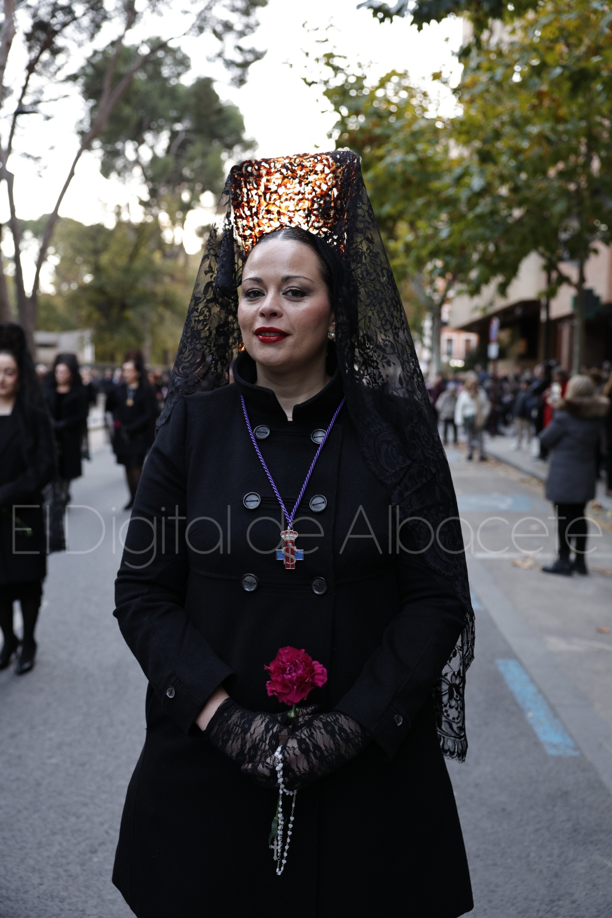 Pero además de numerosos fieles y devotos, acompañaban en su caminar por la ciudad al Cristo de Medinaceli en esta Procesión Extraordinaria, mujeres ataviadas con la tradicional mantilla española. Un detalle que contribuía a realzar la solemnidad de este acto histórico que vivía en la tarde de este domingo, 23 de noviembre, la ciudad de Albacete con motivo del 75 aniversario de la Real e Ilustre Esclavitud de Nuestro Padre Jesús Nazareno de Medinaceli.