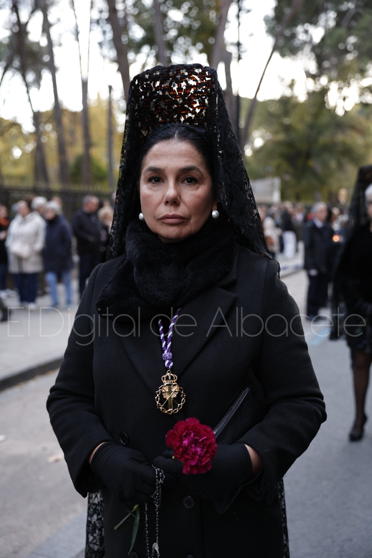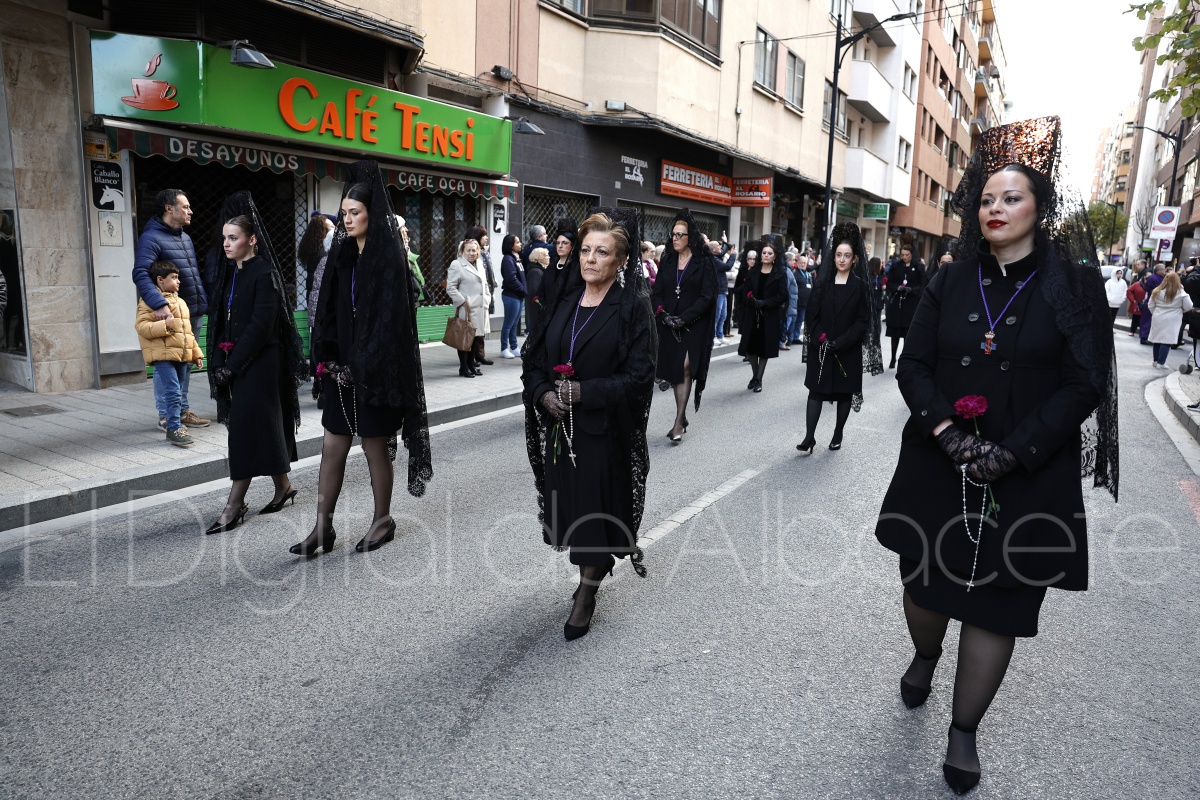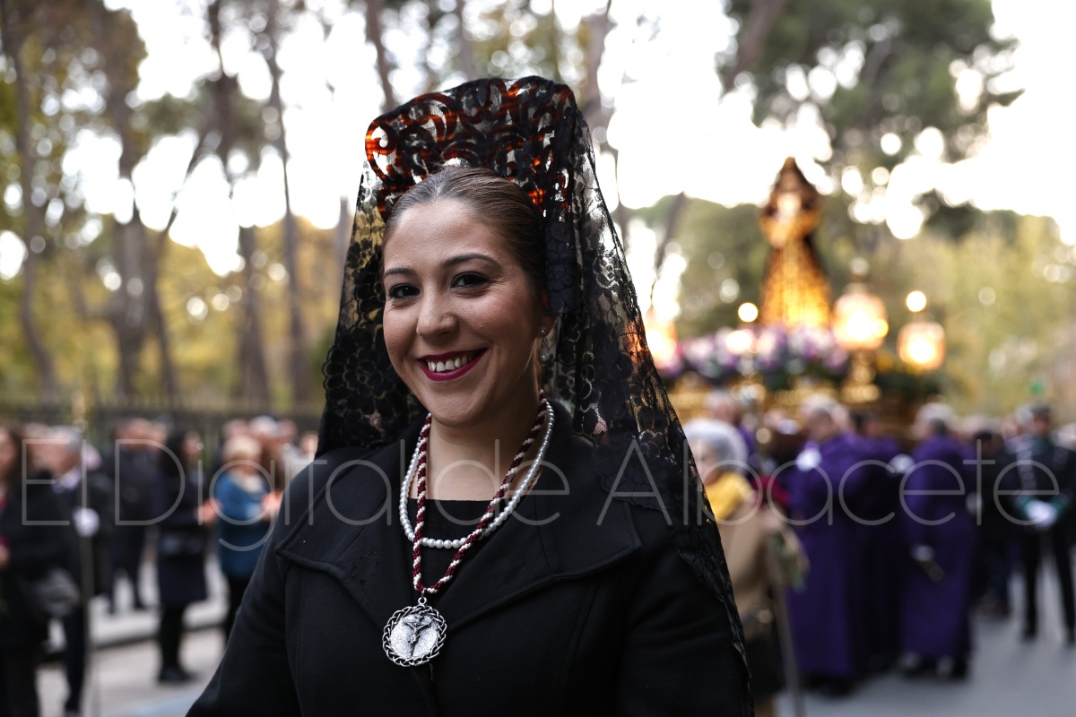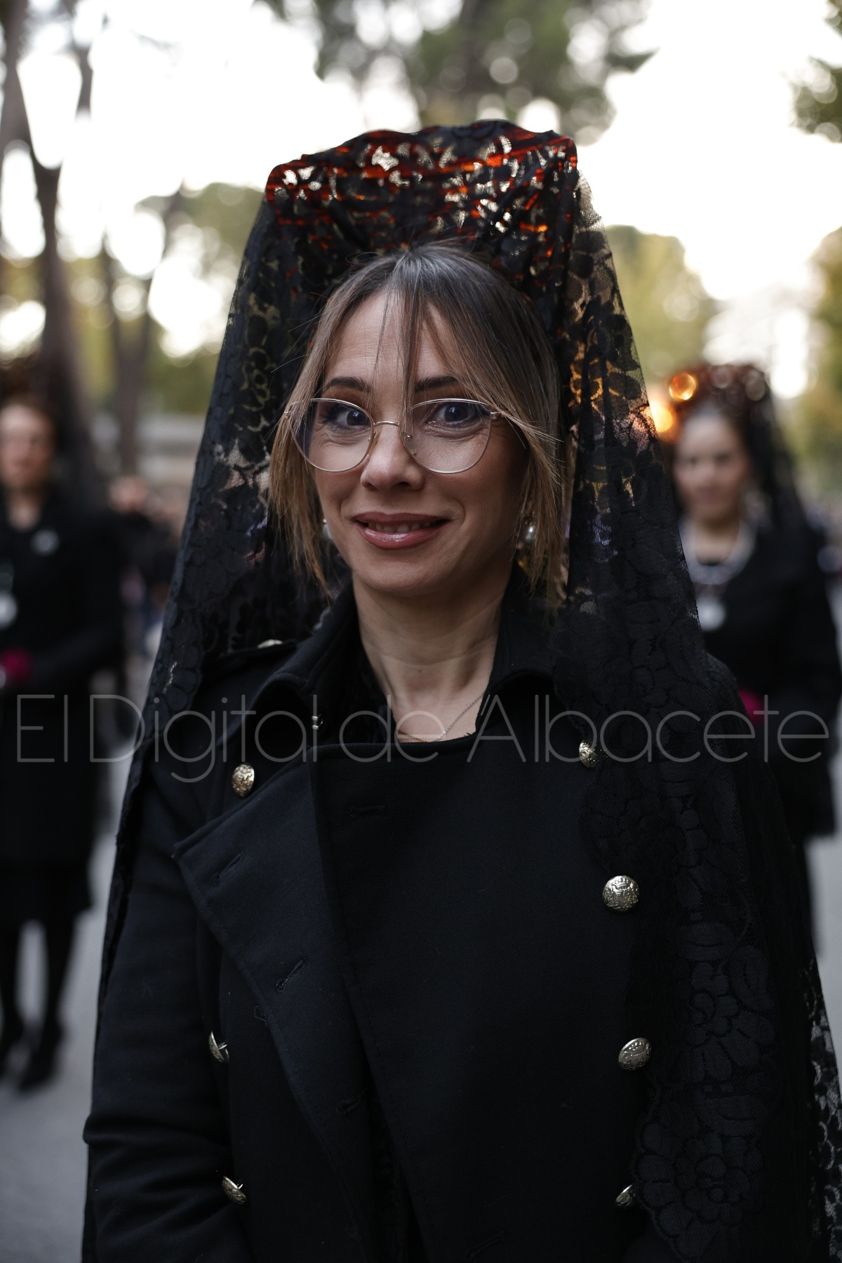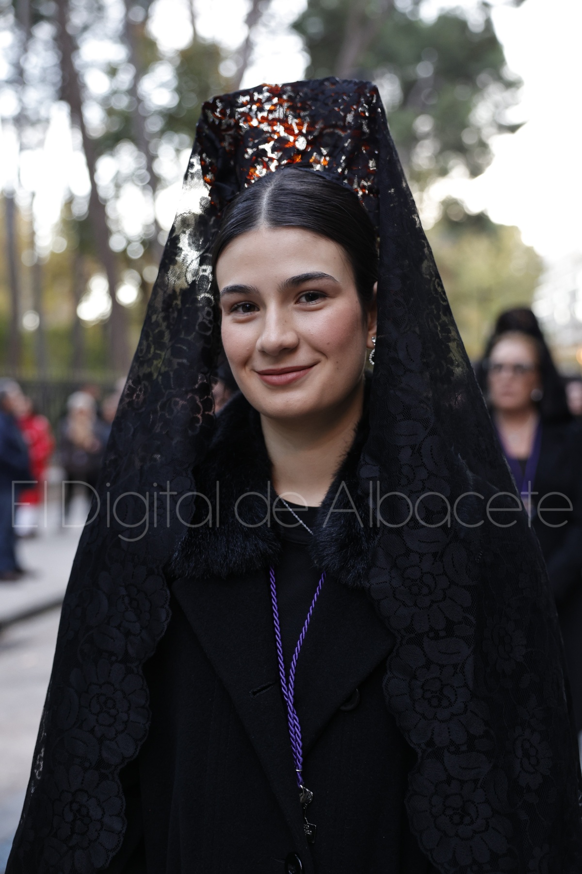 Pero además de numerosos fieles y devotos, acompañaban en su caminar por la ciudad al Cristo de Medinaceli en esta Procesión Extraordinaria, mujeres ataviadas con la tradicional mantilla española. Un detalle que contribuía a realzar la solemnidad de este acto histórico que vivía en la tarde de este domingo, 23 de noviembre, la ciudad de Albacete con motivo del 75 aniversario de la Real e Ilustre Esclavitud de Nuestro Padre Jesús Nazareno de Medinaceli.