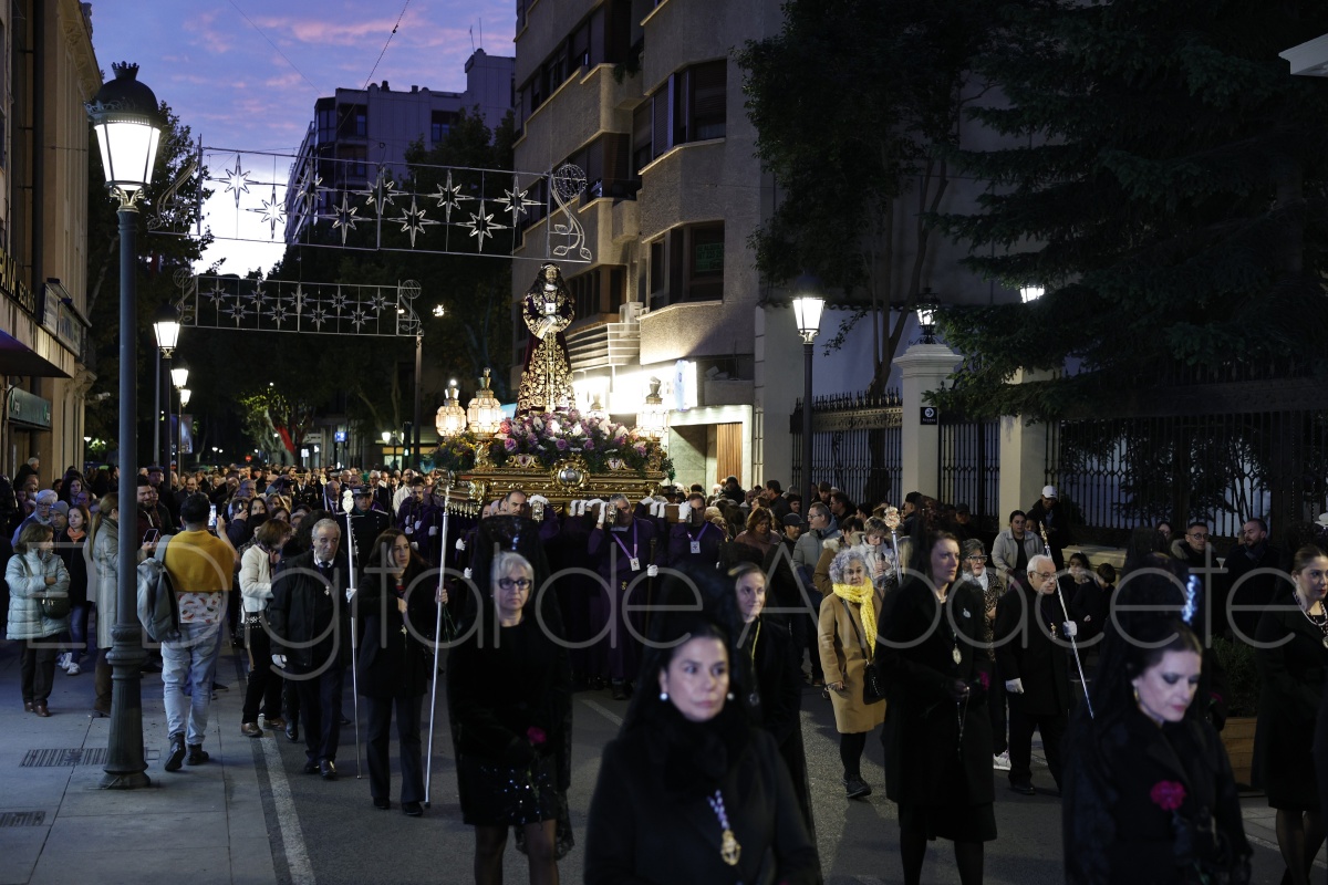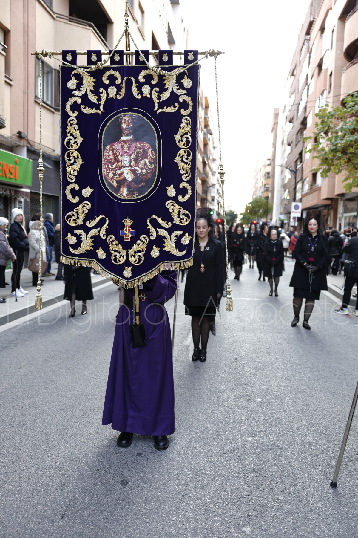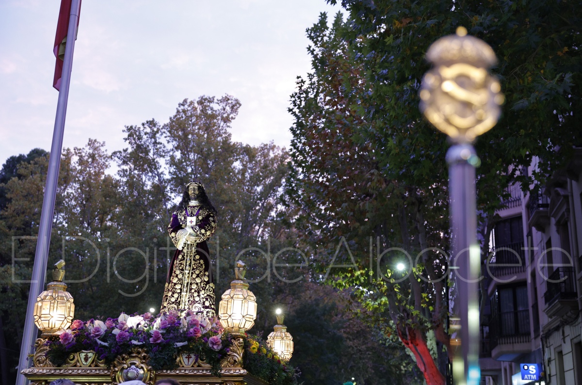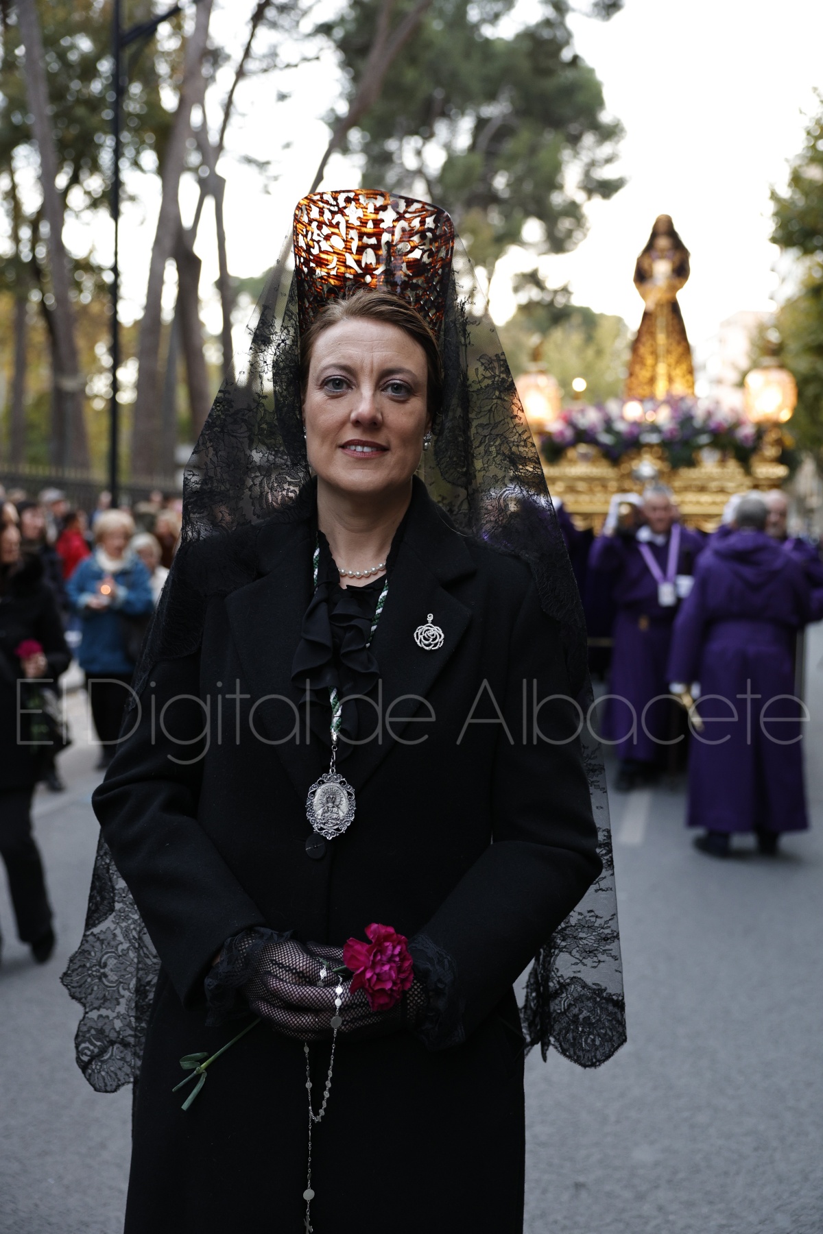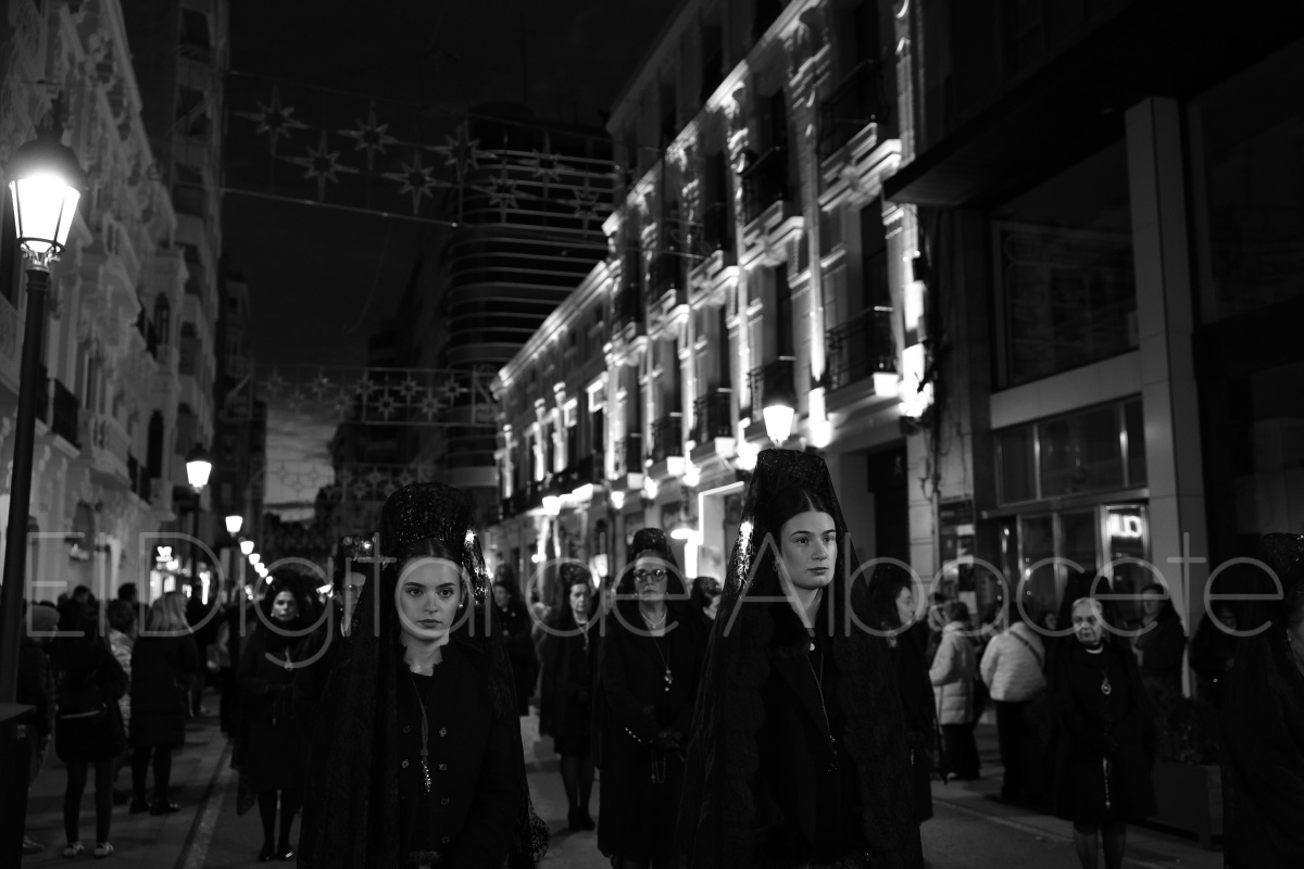 Pero además de numerosos fieles y devotos, acompañaban en su caminar por la ciudad al Cristo de Medinaceli en esta Procesión Extraordinaria, mujeres ataviadas con la tradicional mantilla española. Un detalle que contribuía a realzar la solemnidad de este acto histórico que vivía en la tarde de este domingo, 23 de noviembre, la ciudad de Albacete con motivo del 75 aniversario de la Real e Ilustre Esclavitud de Nuestro Padre Jesús Nazareno de Medinaceli.