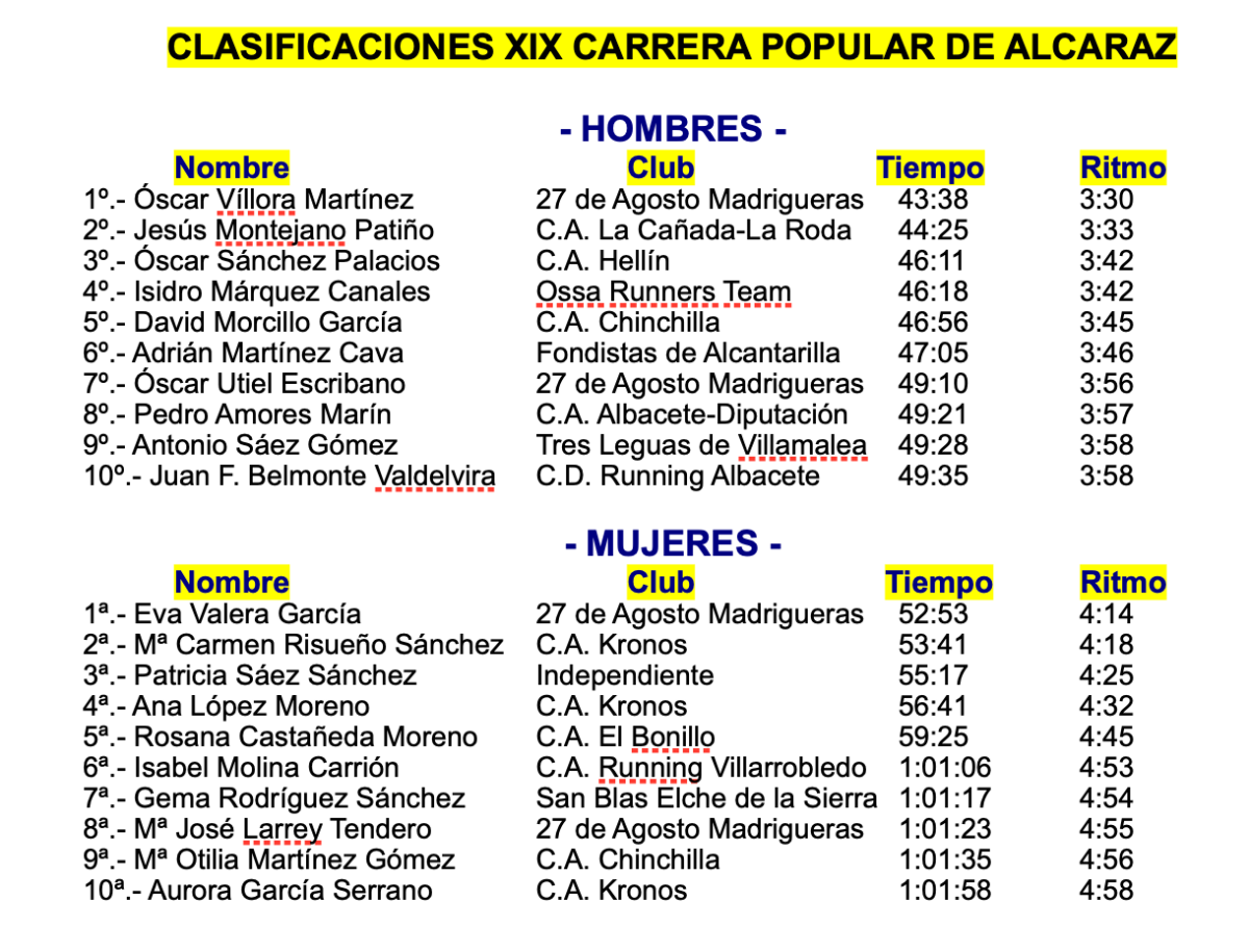 La XIX Carrera Popular Alcaraz-Cortes-Alcaraz repitió ganadores por tercer año consecutivo: Óscar Víllora Martínez y Eva Valera García, ambos del Club de Atletismo 27 de Agosto de Madrigueras. Y lo que dejó claro fue la certificación de Mª Ángeles Magán Talavera, ausente en esta carrera, como campeona del XXIV Circuito Provincial de Carreras Populares, uniéndose así a José Antonio Hernández Navajas, que ya aseguró su triunfo hace semanas.