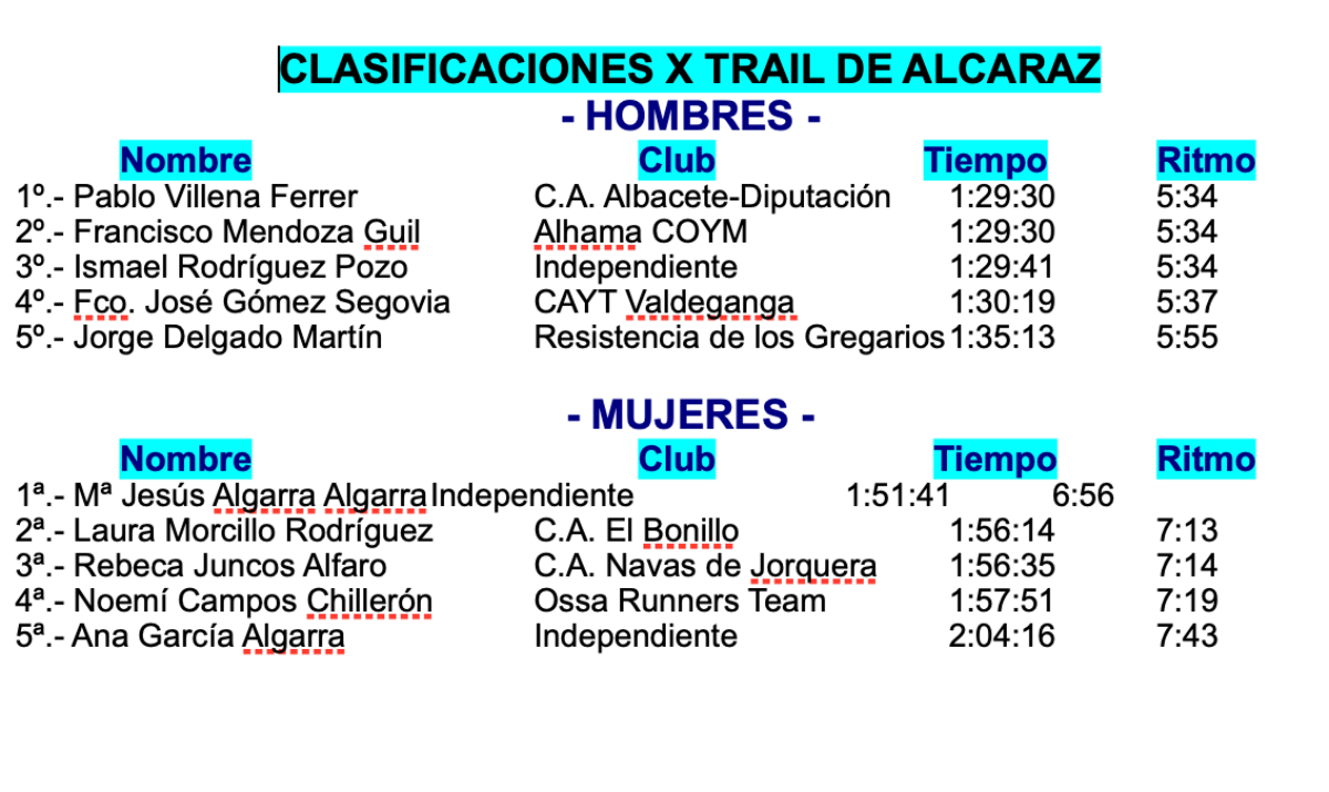 Por lo tanto, con la general decidida de antemano, el X Trail de Alcaraz sirvió para determinar qué dos atletas se hacían con la última victoria del año, honor que cayó en Pablo Villena Ferrer (C.A. Albacete-Diputación) y en María Jesús Algarra Algarra (Independiente). Y demostró, una vez más, el gran compañerismo y la amistad que se da en este tipo de pruebas, pues Pablo entró en meta de la mano de Francisco Mendoza Guil (Alhama COYM), aunque la alfombra de cronometraje determinó el primer puesto para el corredor del C.A. Albacete-Diputación, quien este año, previamente, había ganado en Vianos. Ismael Rodríguez Pozo (Independiente) completó el último pódium del año en trail. En la categoría femenina, por su parte, Laura Morcillo Rodríguez (C.A. El Bonillo) y Rebeca Juncos Alfaro (C.A. Navas de Jorquera) acompañaron a la campeona en el pódium.