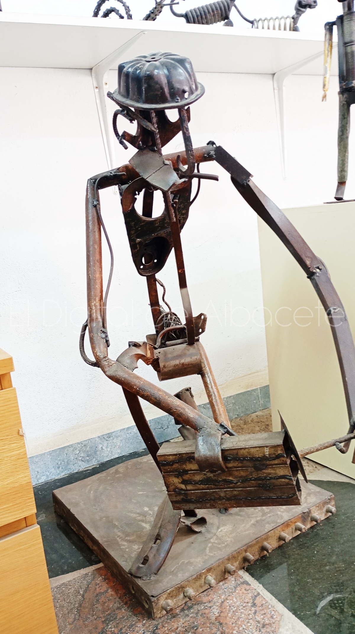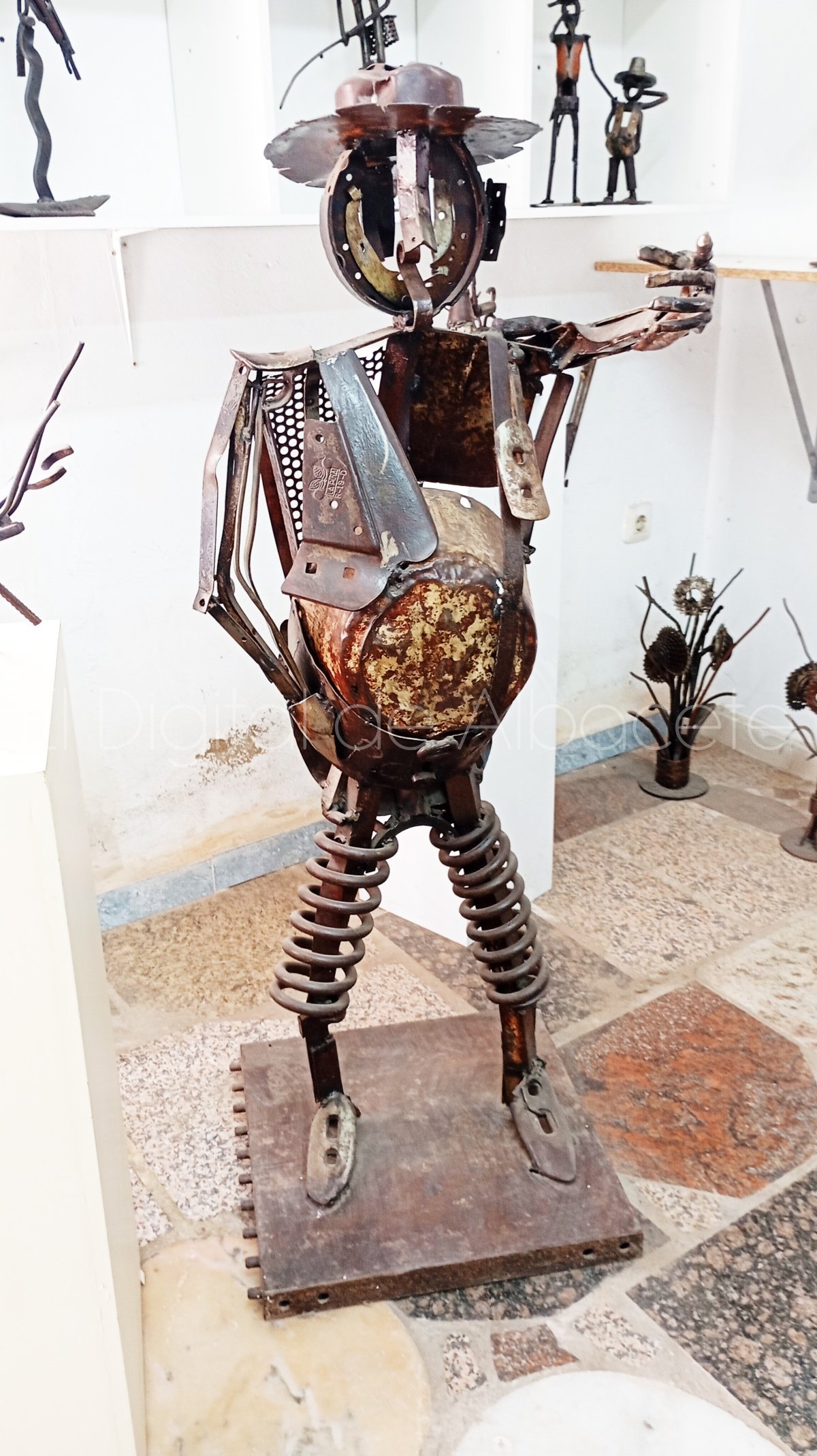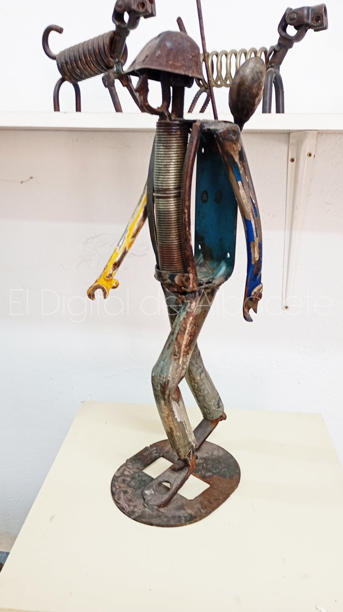 Luis Carrión ha dedicado toda su vida a ser albañil, y descubrió su vocación de escultor por casualidad. “Empecé desde muy joven ayudando a mi padre como albañil, y cinco años después me compre la herramienta y me fui por mi cuenta. A los 65 años me jubilé, y ahora que tengo 71 años, echo la vista atrás y me gusta pensar que, aunque he dedicado toda mi vida a esto, con el tiempo me convertí en un albañil ‘de los buenos’, porque he hecho muchísimas cosas. Lo de trabajar con el hierro me surgió de golpe. Tengo un primo, Lucas Karvazz, que es un escultor de renombre. Entre otras cosas, fundó el Instituto Rural de Arte ‘Hoz del Júcar’ en 2006, una residencia internacional para artistas y creativos ubicada en Casas del Cerro. Por aquel entonces yo tenía 50 años, y me encargué de la construcción del edificio, y aparte le buscaba chatarra a mi primo para sus obras escultóricas. A raíz de verle trabajar, me di cuenta de que me atraía eso de hacer obras con metal reciclado, y pensé que podía intentarlo. Así que me puse con ello, hasta que un día mi primo me animó a participar en un concurso de escultura en Minglanilla. En este concurso me fue tan bien, que gané el primer premio por un Quijote que hice de metal. En ese momento me di cuenta de que eso era lo mío, me animé a seguir trabajando, y hasta ahora”, indica.