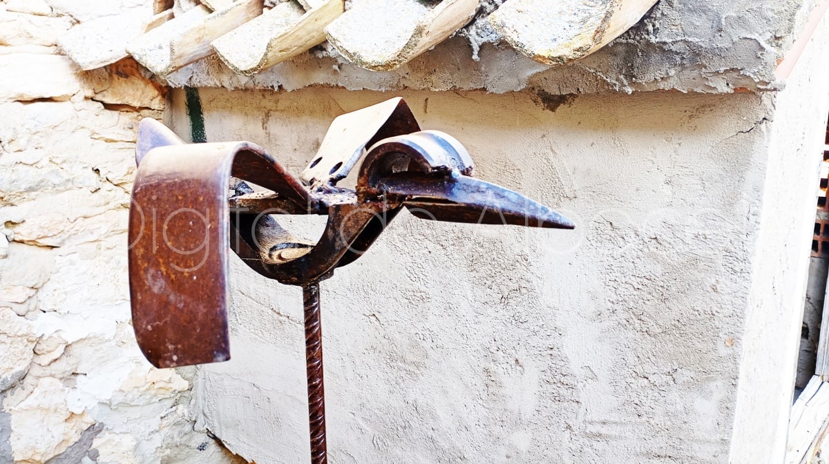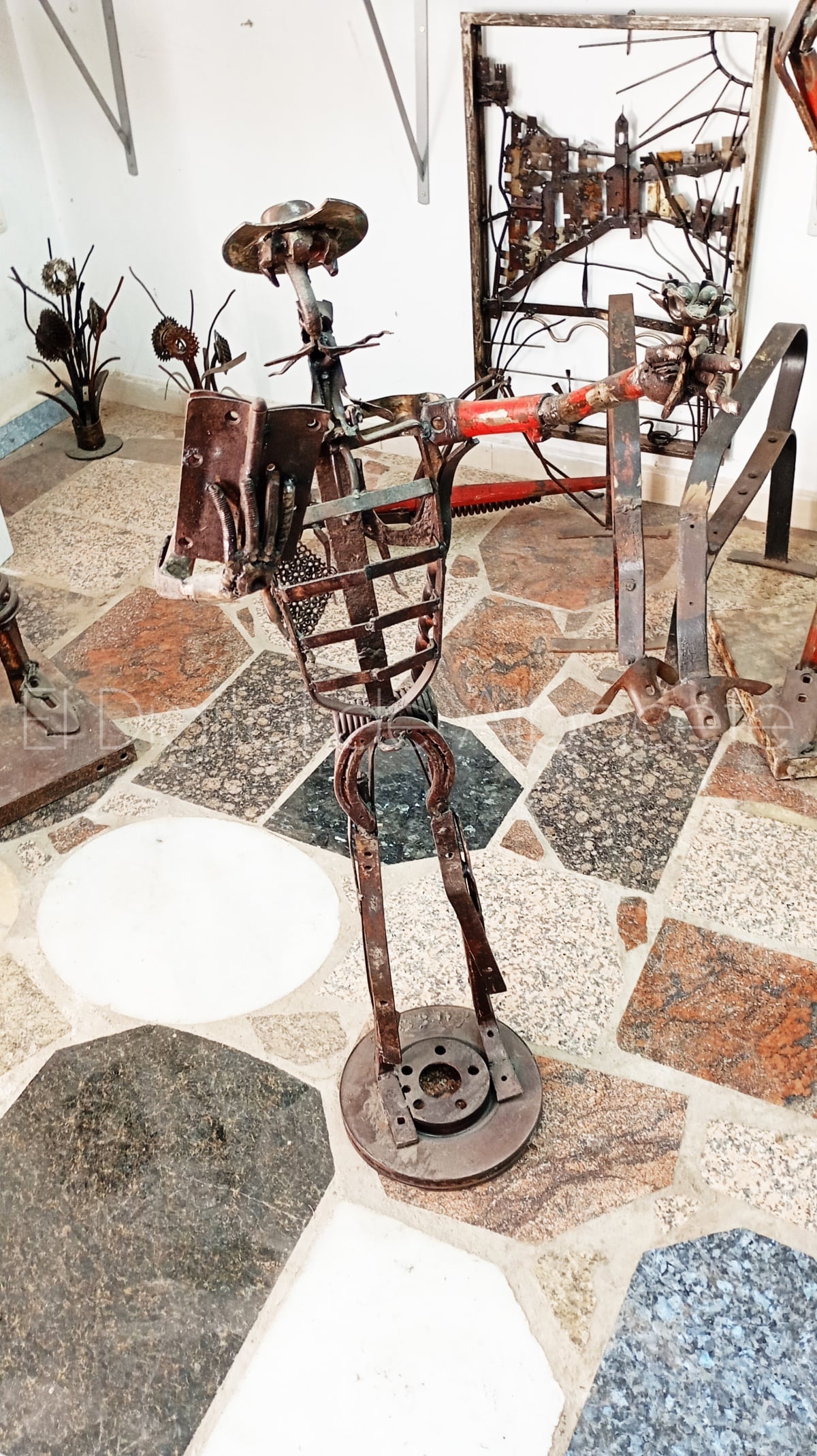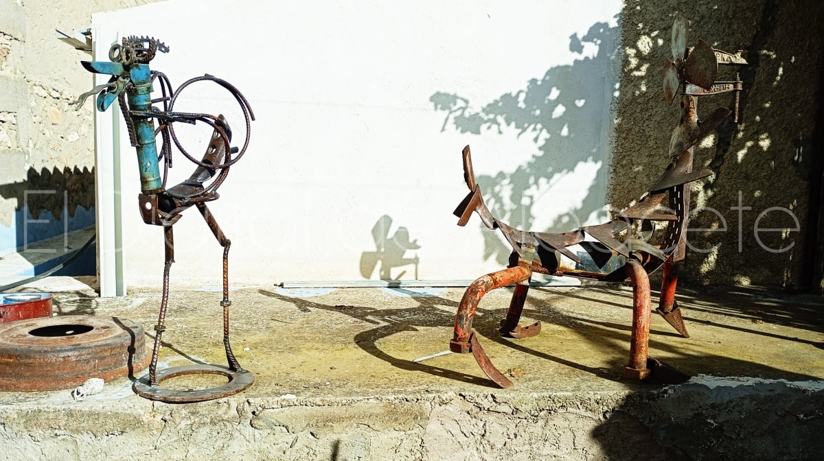 Lucas trabaja con materiales reciclados de los vertederos, chatarrerías, y desguaces, o con materiales que los vecinos del pueblo le traen de tractores o máquinas estropeadas. “Soy muy amigo de las chatarrerías, y parece que atraigo a los hierros, porque para ellos soy como una especie de imán. Voy por ahí, y me voy encontrando cosas increíbles, o al menos a mí me lo parecen. Además, cuando me encuentro alguna pieza, enseguida le encuentro apaño. También me trae cosas la gente del pueblo. Cosas que se les rompen, que no valen para nada, pero yo en mi taller les doy una segunda vida. Cuando encuentro algo, o me traen una pieza, me imagino al mirarla para qué me puede servir, o en que la puedo convertir, y así voy encajando mi escultura. Siempre empiezo las obras con alguna pieza que me inspira, o me lo dice. Por ejemplo, en el caso del Quijote empecé con el sombrero. A una pieza redonda le quité un trozo para que fuese como una bacía de barbero, y a partir de ahí comencé a armarlo. Luego le fui dando forma y movimiento. El pecho lo hice con el portaequipajes de una bicicleta antigua, y utilicé muelles de los aperos de la labranza. Muchas veces salgo en busca de alguna pieza que necesito, y otras las encuentro sin buscarlas, como si me buscaran ellas a mí”, refleja.