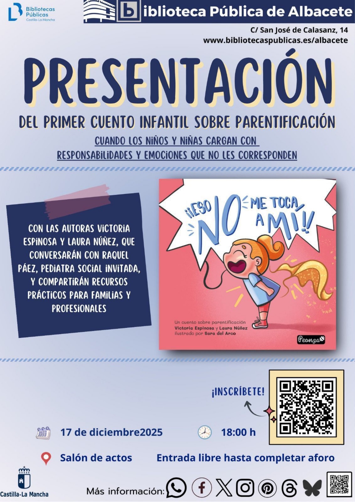 ‘¡Eso no me toca a mí!’ (editorial Peonza 2025) es el primer cuento infantil que aborda la parentificación, una realidad muy prevalente pero invisibilizada y que se presentará el próximo 17 de diciembre en Albacete. Un cuento sobre el que que la psicóloga albaceteña, Victoria Espinosa detallaba que “surgió de forma muy natural”, explicando que tanto ella como su compañera Laura Núñez “somos psicólogas generales sanitarias especializadas en apego y crianza, y al compartir casos clínicos veíamos que la parentificación y sus consecuencias aparecía con mucha frecuencia, tanto cuando tratábamos con familias como cuando trabajábamos con adultos”.