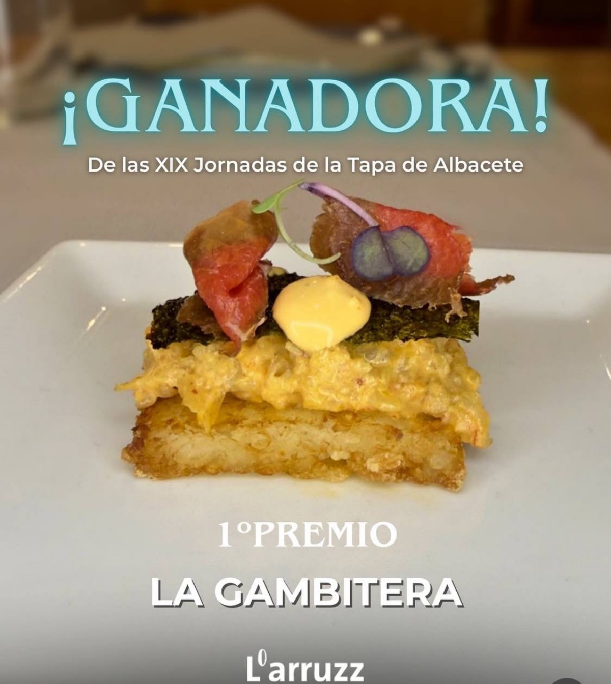 ‘La Gambitera’ la tapa del Restaurante L’Arruz de Albacete se ha proclamado ganadora de la Jornada de la Tapa. Un bocado de tartar de gamba marinado sobre un lingote de arroz crujiente de alga nori a la miel y flor de ternera ahumada al que los albaceteños no se han podido resistir como ha quedado demostrado.