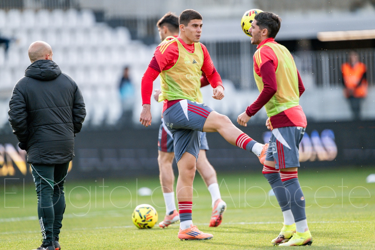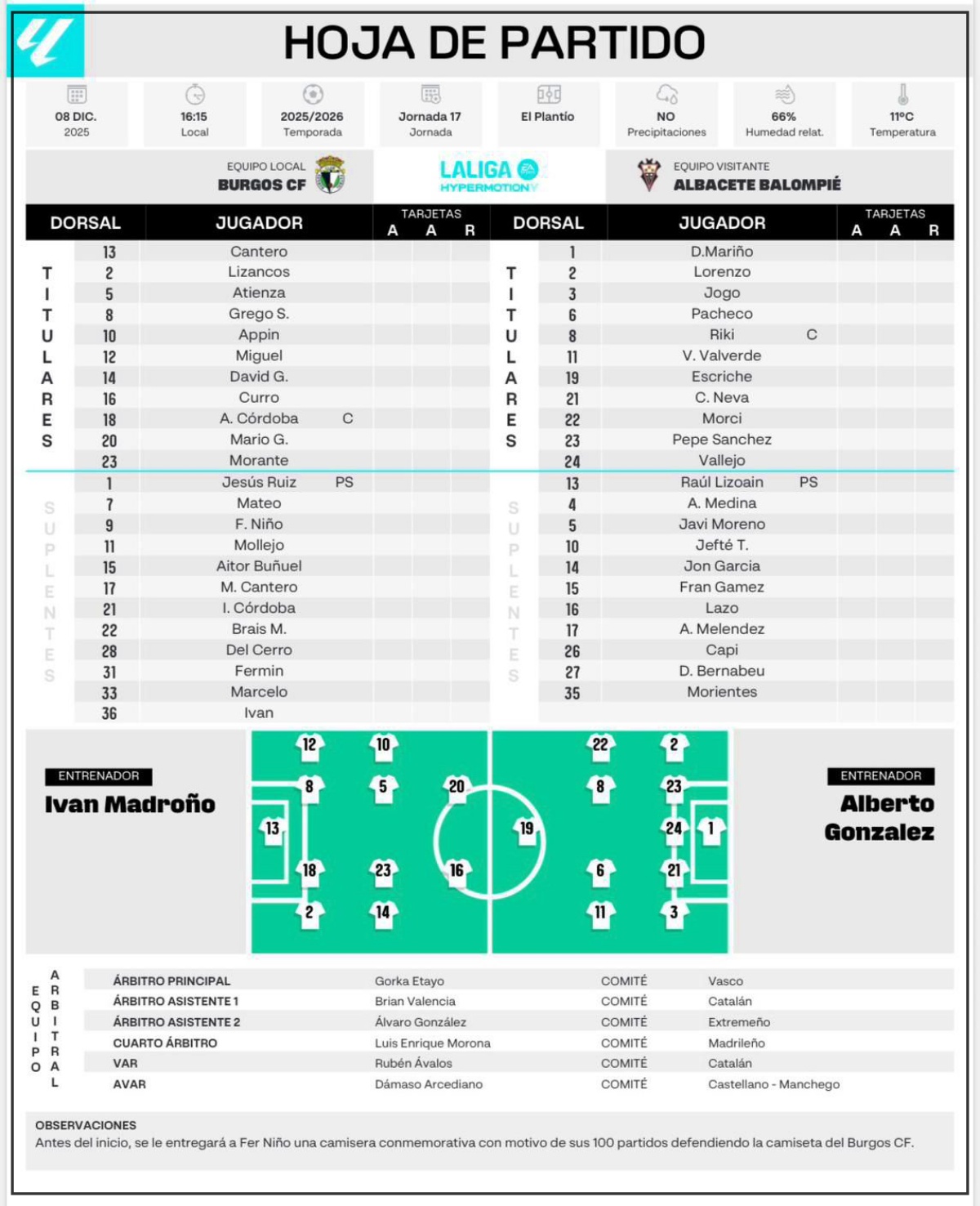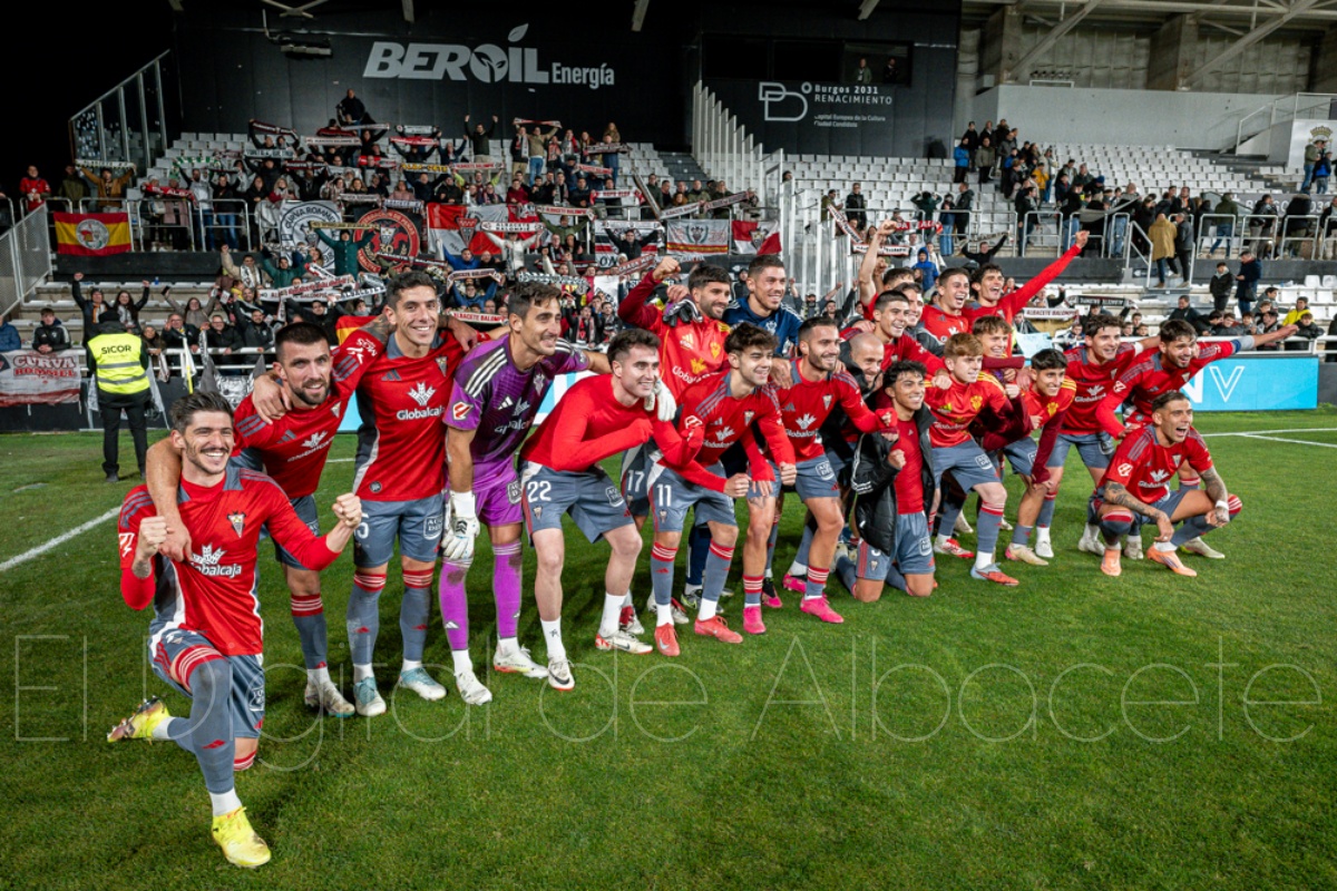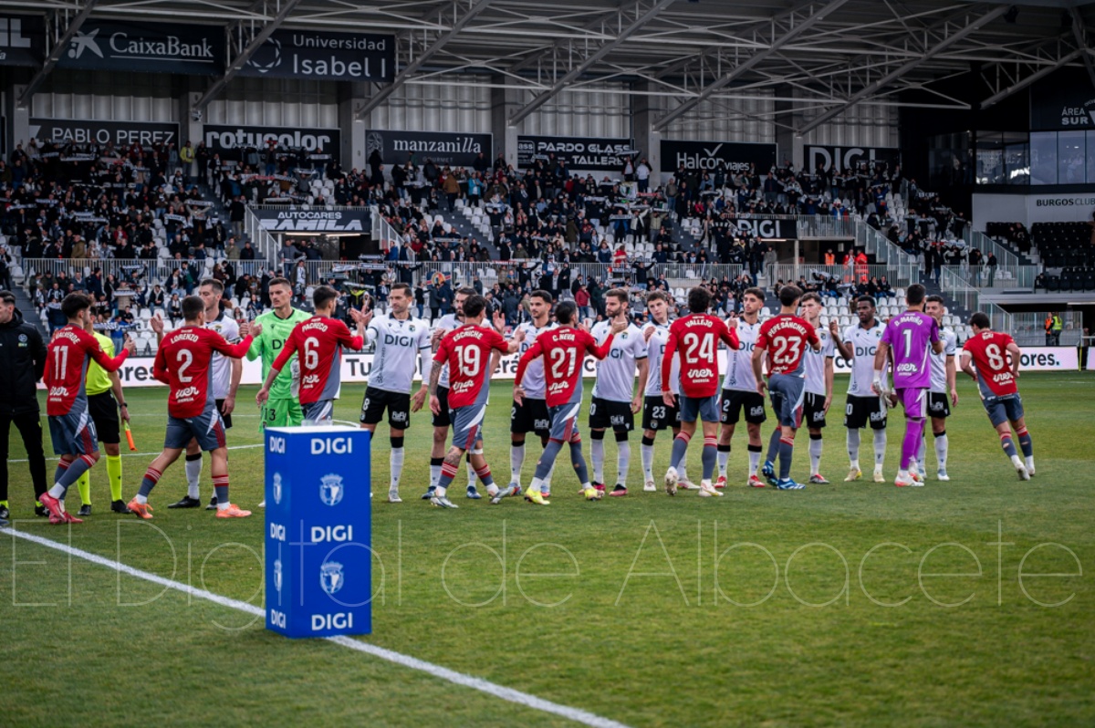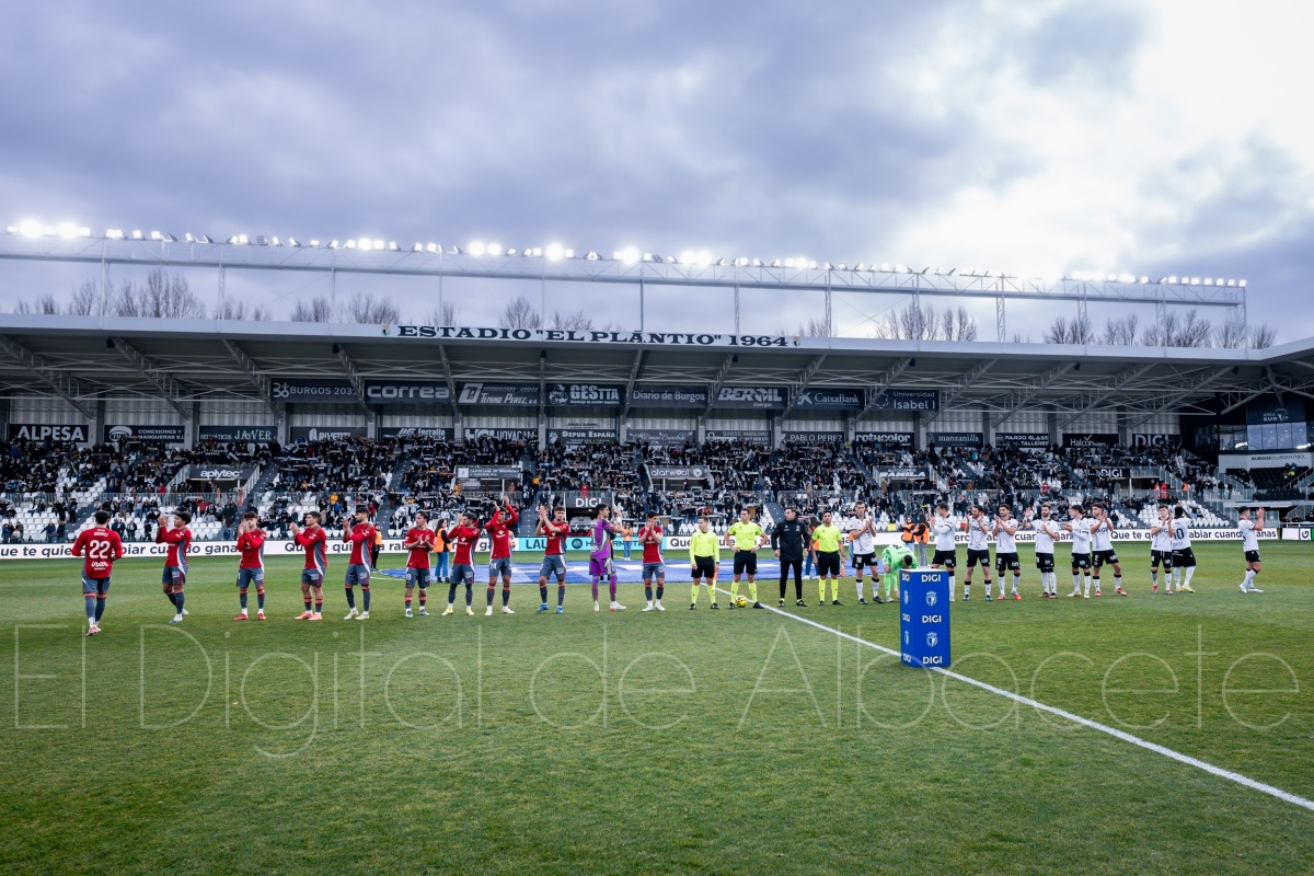 Por parte del Burgos CF, Luis Miguel Ramis, con quien tanto disfrutó la afición del Albacete mientras estuvo en el banquillo, apostó por un once compuesto por Ander Cantero en portería; Lizancos, Aitor Córdoba, Grego y Miguel, en defensa; David, Morante, Atienza y Appin, en el centro del campo; y Curro y Mario, en ataque.