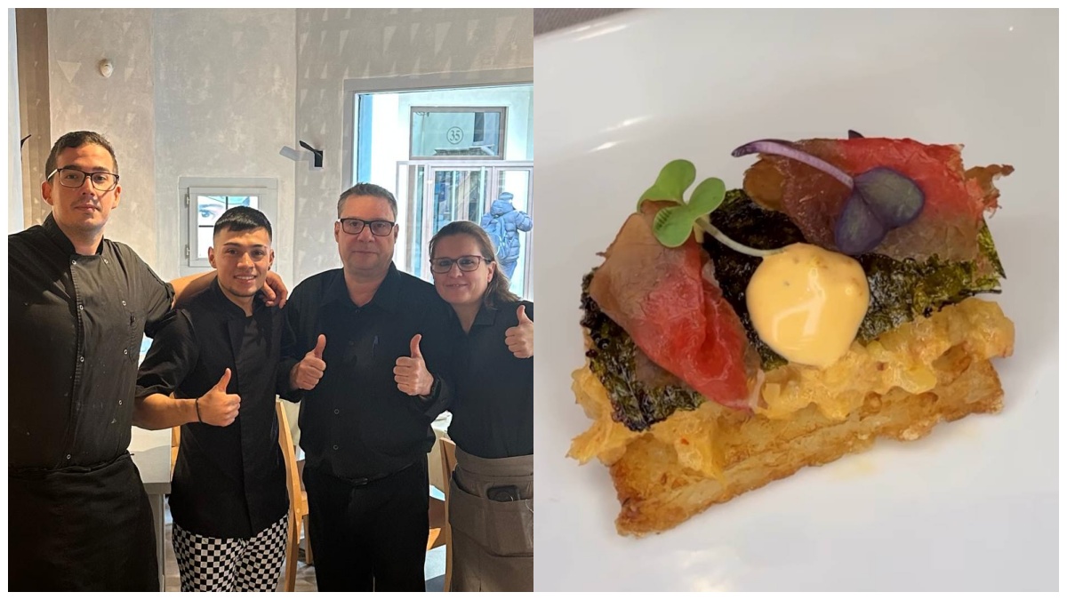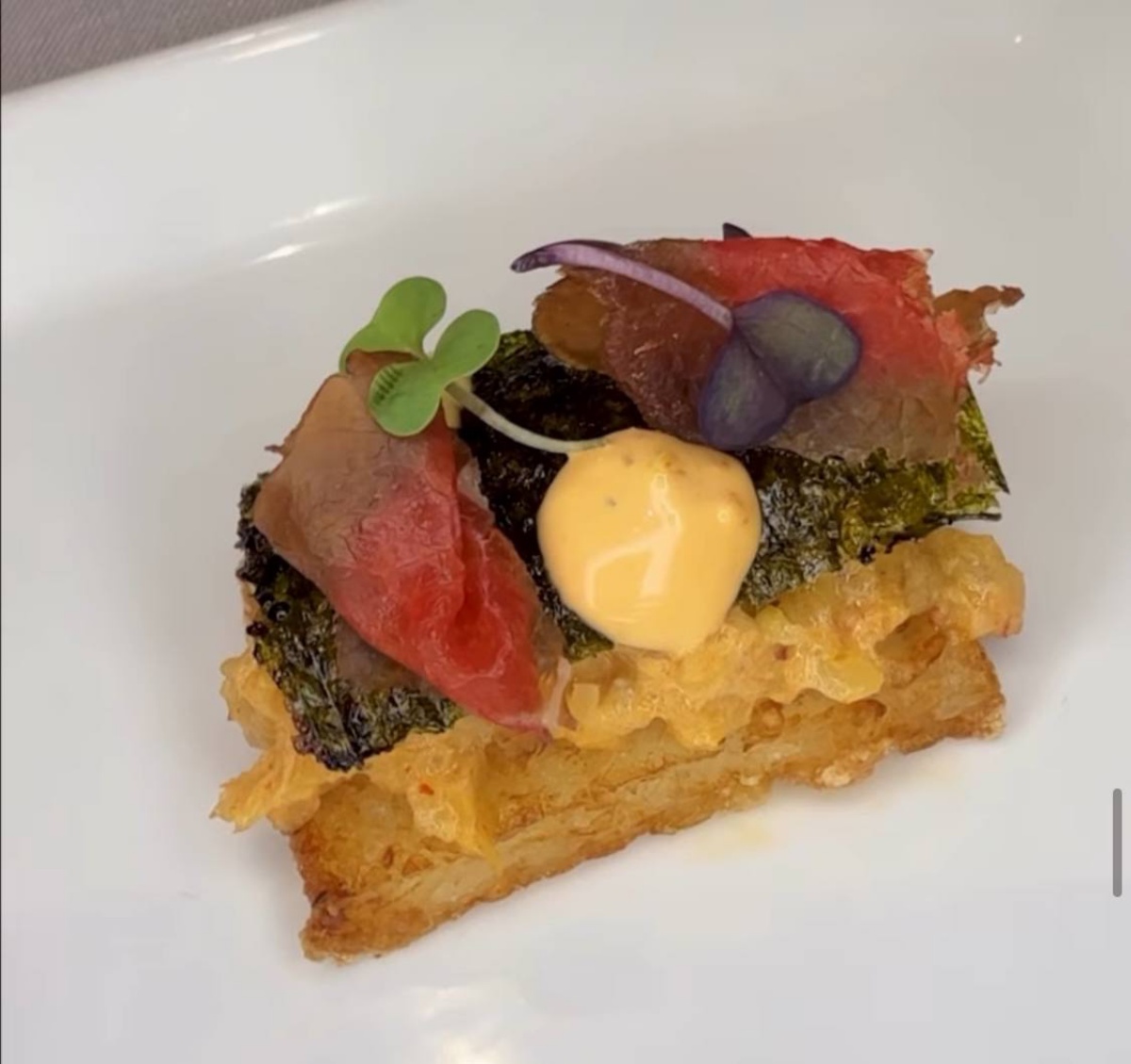 Sobre esta elección, destaca que hacen un guiño a su identidad como arrocería, que no puede faltar en sus creaciones, por lo que “esta tapa va sobre un crujiente de arroz frito”, como indica López-Bleda. “Son 23 años y nos gusta mantener ese guiño”, sostiene. Sobre el proceso de elaboración, manifiesta que tras esta base añaden un “alga nori, que untamos de miel y freímos”, coronando la creación con “una ternera ahumada que también hacemos nosotros”.