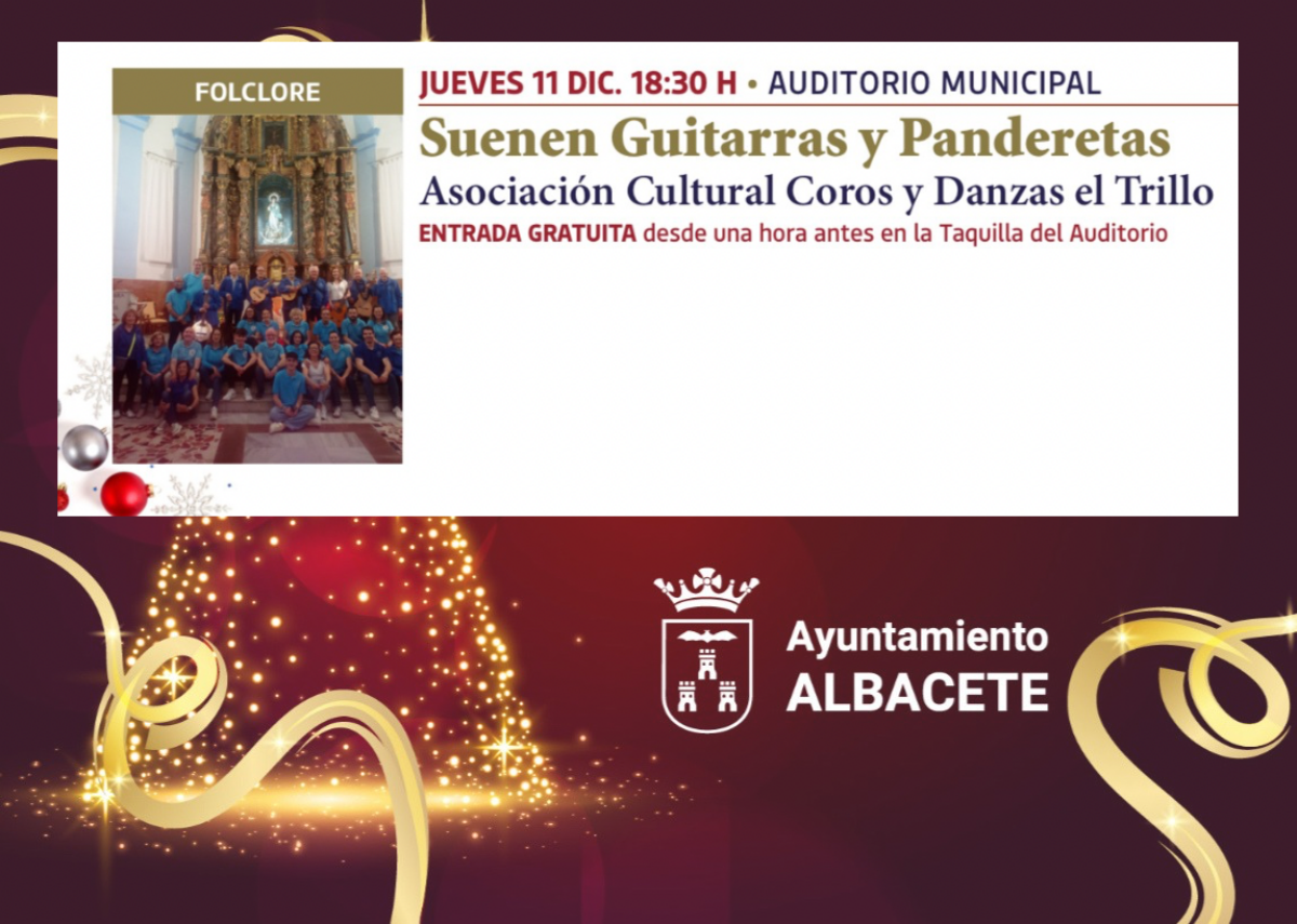 El Ayuntamiento continúa desarrollando su amplia programación de Navidad Cultural 2025/2026 y, dentro de ella, mañana jueves 11 de diciembre, el Auditorio Municipal se llenará de música y tradición con el espectáculo “Suenen Guitarras y Panderetas”, a cargo de la Asociación Cultural Coros y Danzas El Trillo. La actuación dará comienzo a las 18:30 horas y se presenta como una de las propuestas más participativas de estas fiestas.