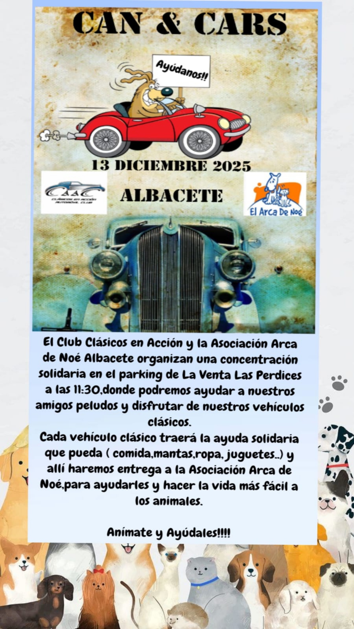 Este sábado, 13 de diciembre, la solidaridad y la pasión por el motor se dan cita en Albacete de la mano del Club Clásicos en Acción y la Asociación El Arca de Noé con un encuentro muy especial que tendrá lugar a partir de las 11:30 horas en el parking de ‘La Venta de las Perdices’, donde los amantes de los vehículos clásicos podrán disfrutar de estas joyas de cuatro ruedas, mientras colaboran con el refugio.
