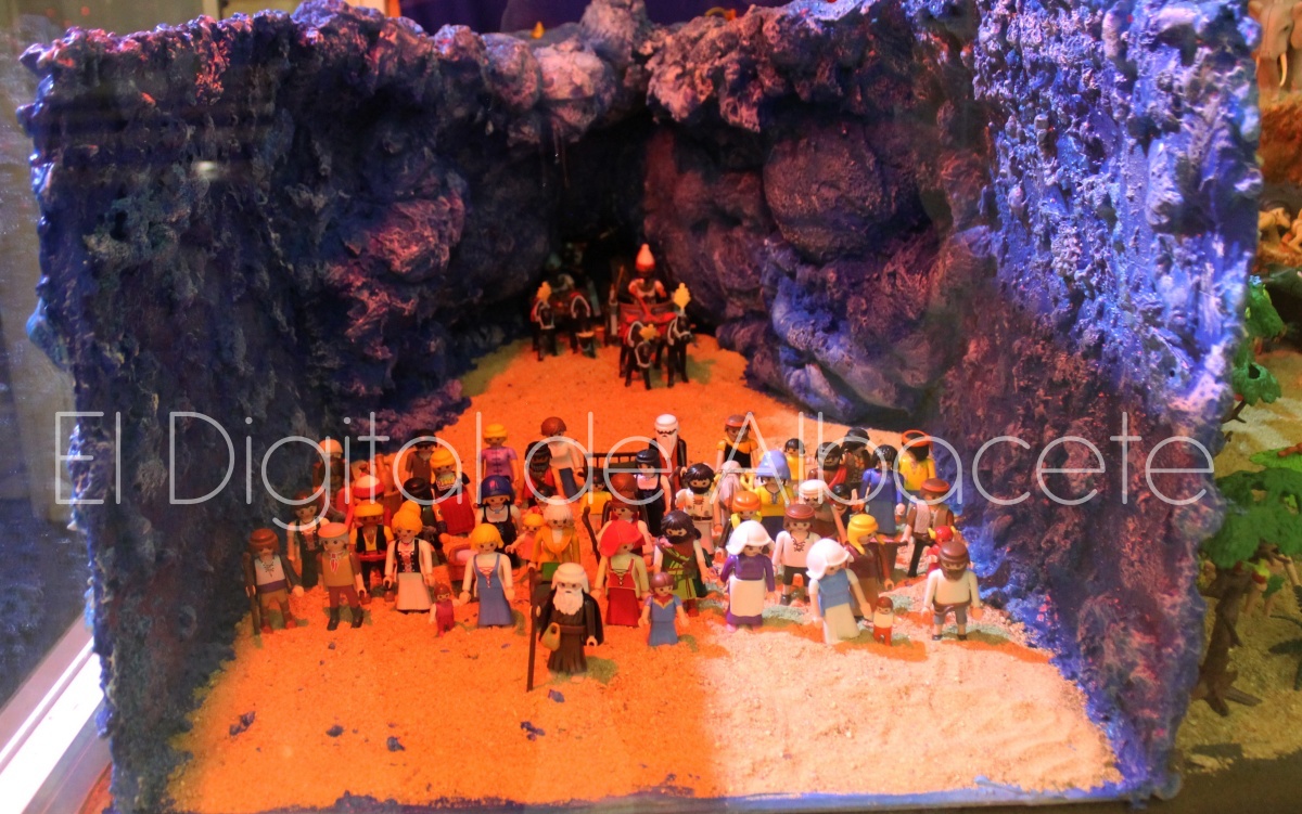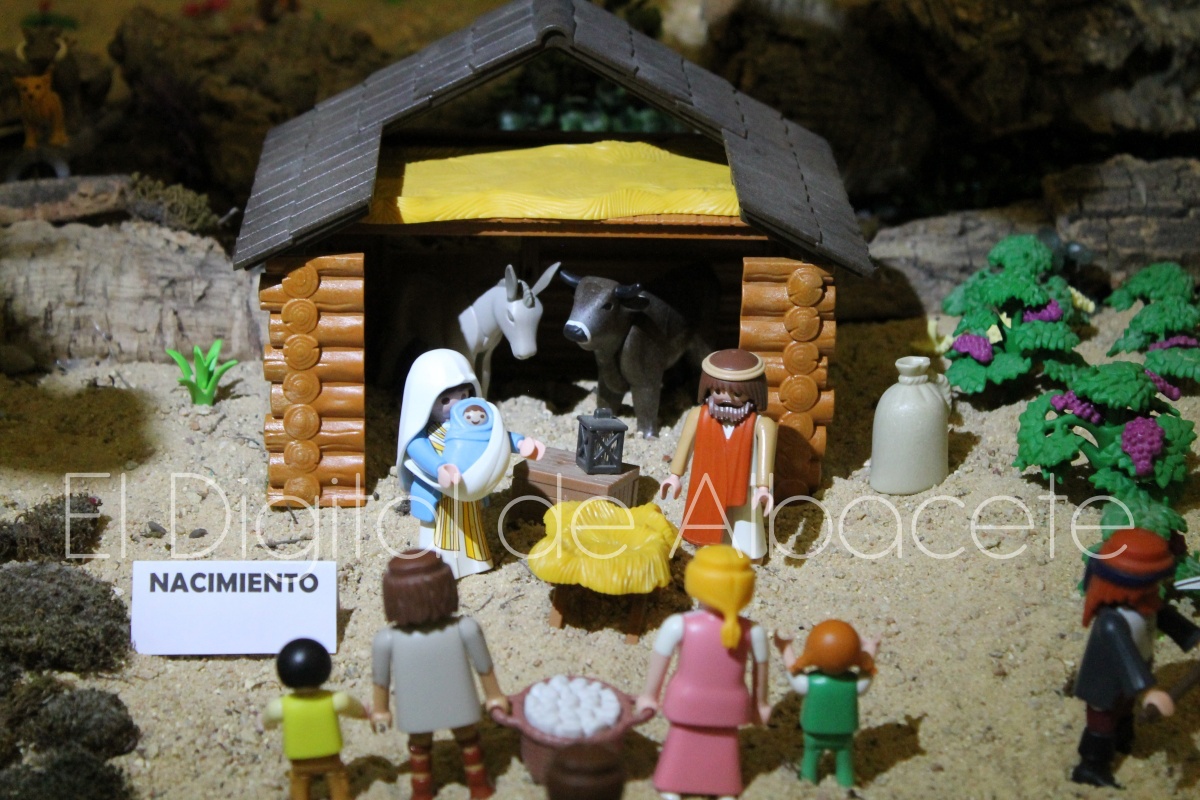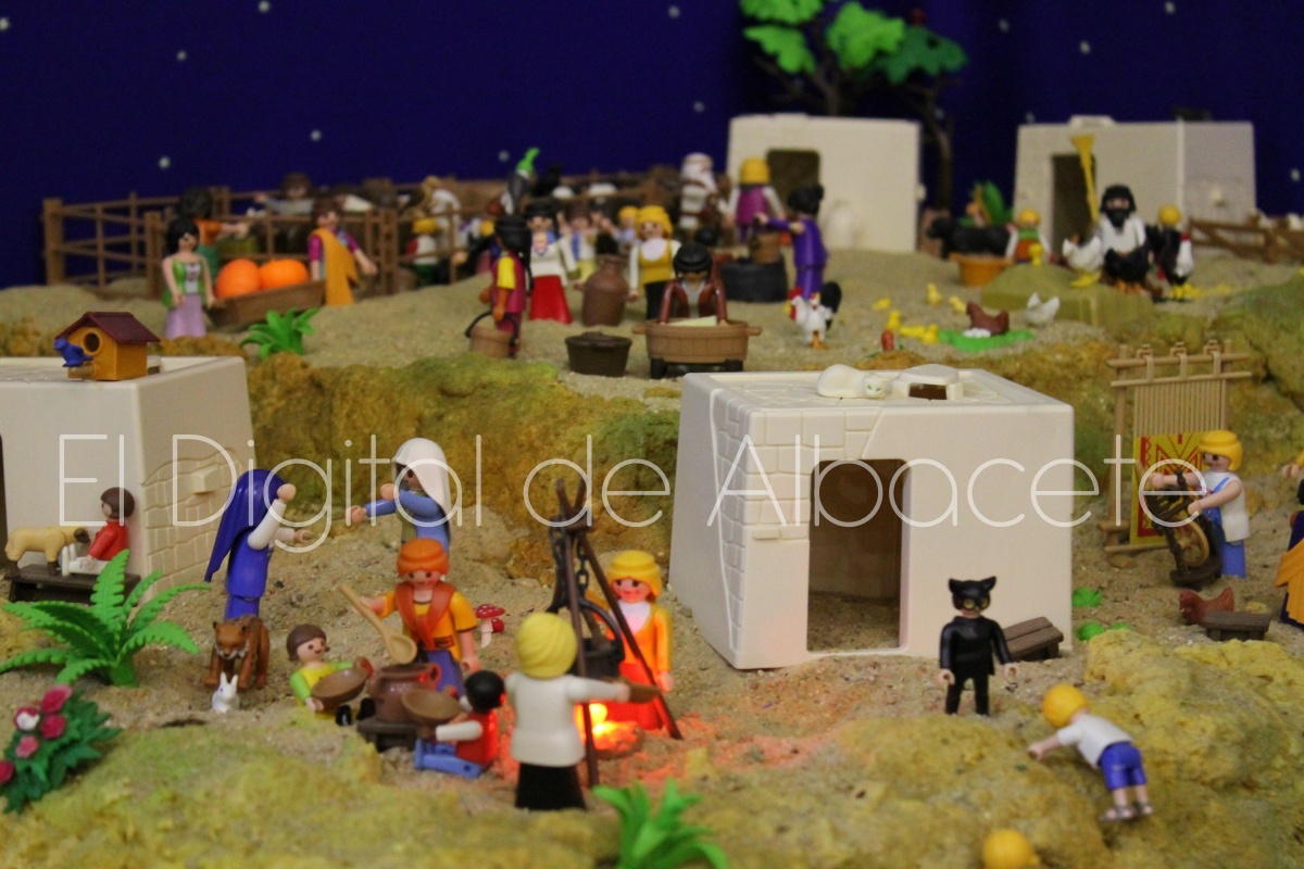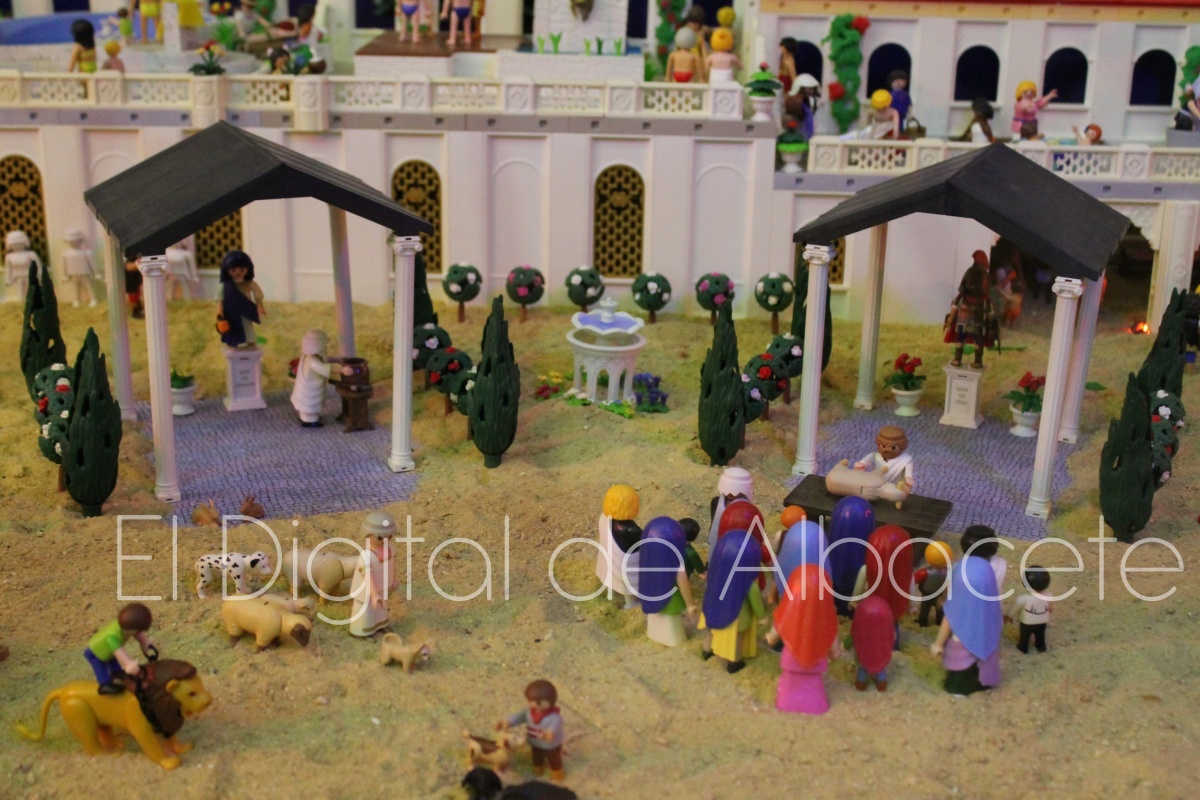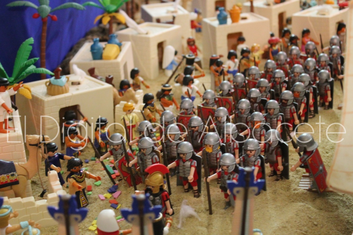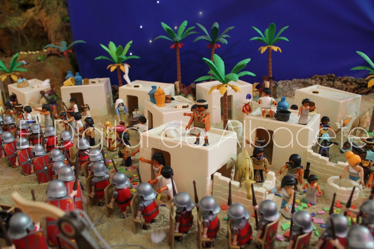 Como en ediciones anteriores, en este original belén se pueden encontrar figuras de Playmobil representando las principales escenas bíblicas. “Siempre incluimos las más representativas, desde la Anunciación a María, el Nacimiento de Jesús, su vida en Egipto, su paso por la sinagoga cuando era un niño, y, por supuesto, El sueño de José, La boda de María y José, María embarazada, María con su prima Isabel buscando posada, La anunciación de los pastores, o el Coro de Ángeles. Pero, como cada año, el belén trae muchas novedades. Así, además de esas principales escenas bíblicas, este año hemos añadido escenas del Antiguo Testamento como la de Moisés abriendo las aguas, el Arca de Noé, David y Goliat, Adán y Eva, y por último Julio Cesar y Cleopatra en el encuentro en Egipto. Además, como el 9 de noviembre se celebró la conmemoración de los 650 años de la obtención del Privilegio de Villazgo en 1375, un hito histórico que le otorgó la independencia y el título de ‘Villa’ (Villa de Albacete), por Don Alfonso de Aragón, Marqués de Villena, hemos querido representarlo en el belén. De este modo aparece el propio Marqués de Villena, junto a dos parejas de manchegos, el cuchillero, el sembrador, y el cartel del aniversario”, señala.