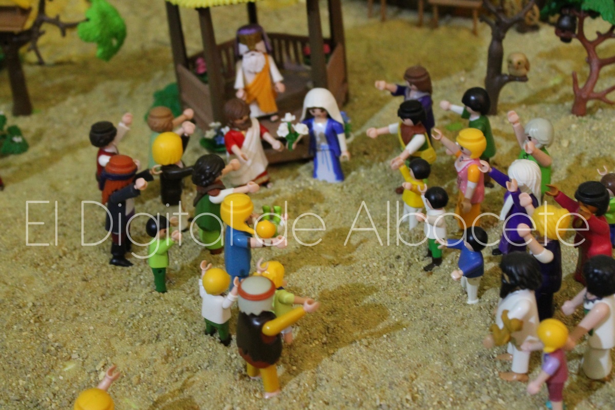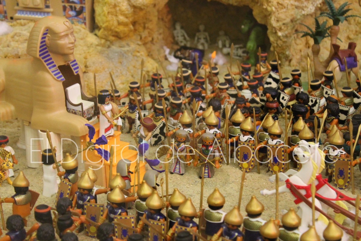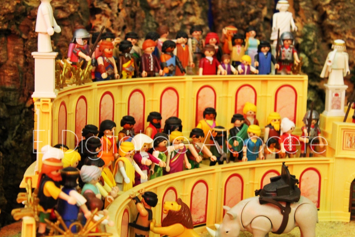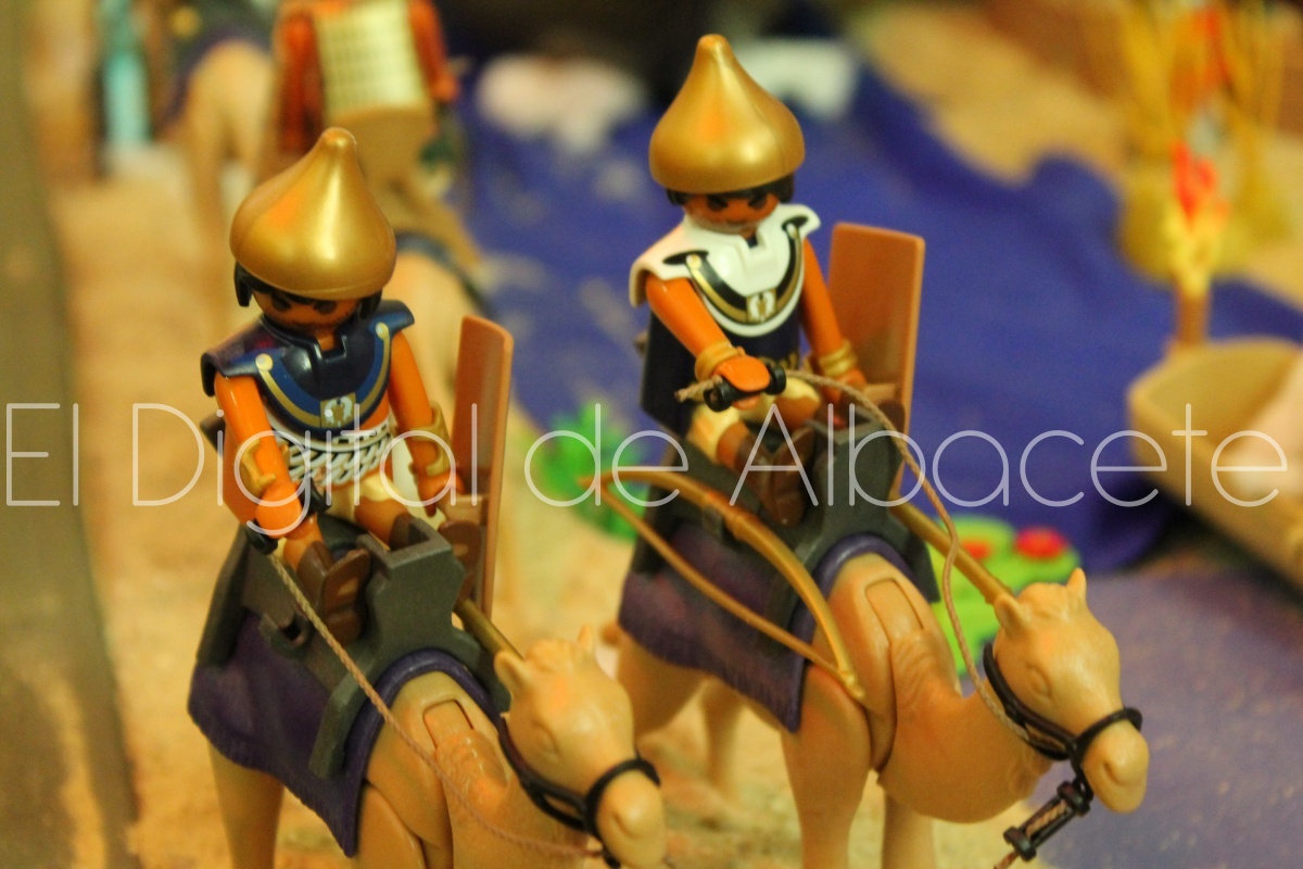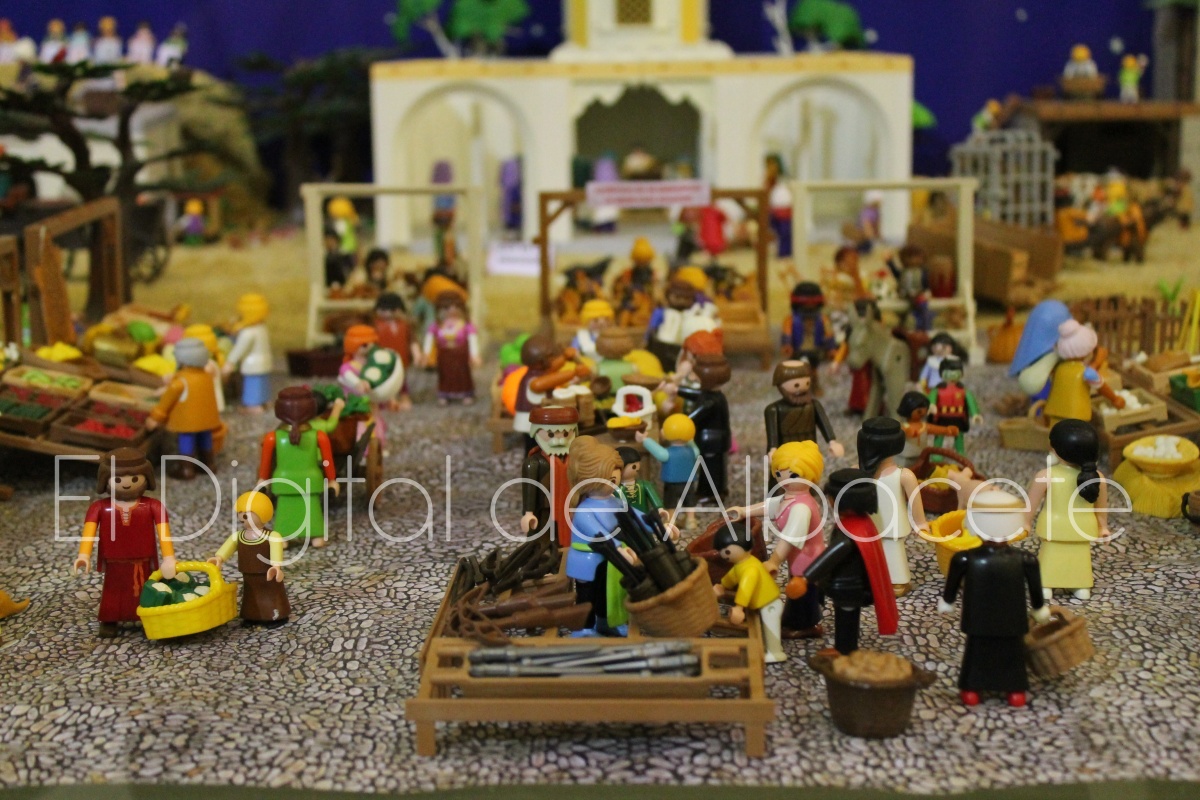 Como en ediciones anteriores, en este original belén se pueden encontrar figuras de Playmobil representando las principales escenas bíblicas. “Siempre incluimos las más representativas, desde la Anunciación a María, el Nacimiento de Jesús, su vida en Egipto, su paso por la sinagoga cuando era un niño, y, por supuesto, El sueño de José, La boda de María y José, María embarazada, María con su prima Isabel buscando posada, La anunciación de los pastores, o el Coro de Ángeles. Pero, como cada año, el belén trae muchas novedades. Así, además de esas principales escenas bíblicas, este año hemos añadido escenas del Antiguo Testamento como la de Moisés abriendo las aguas, el Arca de Noé, David y Goliat, Adán y Eva, y por último Julio Cesar y Cleopatra en el encuentro en Egipto. Además, como el 9 de noviembre se celebró la conmemoración de los 650 años de la obtención del Privilegio de Villazgo en 1375, un hito histórico que le otorgó la independencia y el título de ‘Villa’ (Villa de Albacete), por Don Alfonso de Aragón, Marqués de Villena, hemos querido representarlo en el belén. De este modo aparece el propio Marqués de Villena, junto a dos parejas de manchegos, el cuchillero, el sembrador, y el cartel del aniversario”, señala.