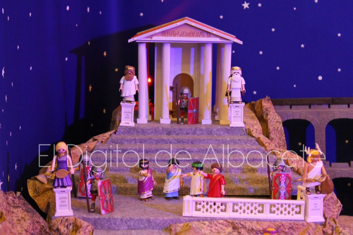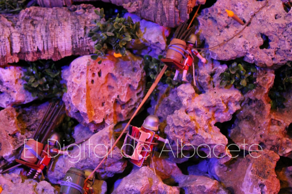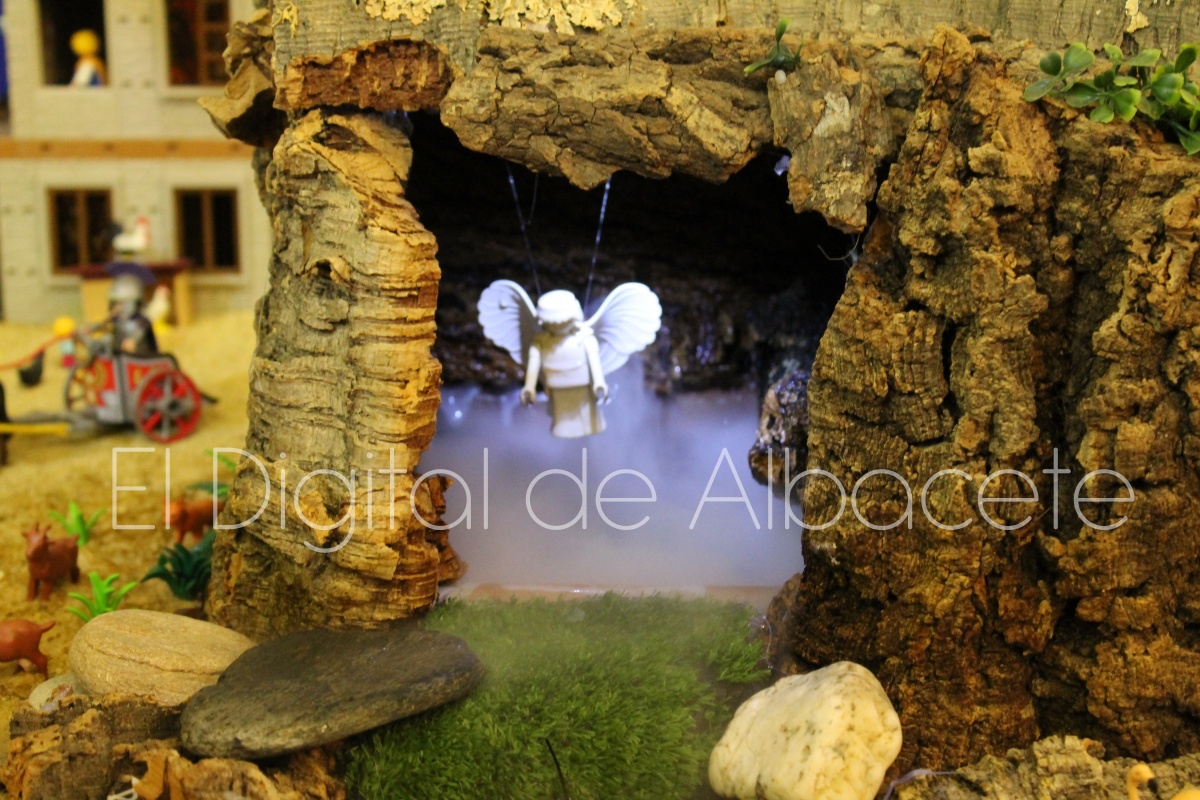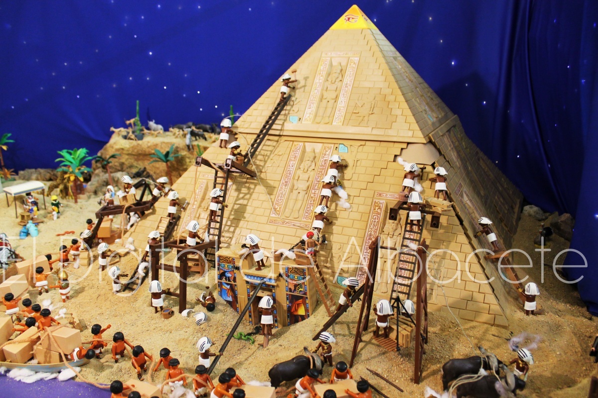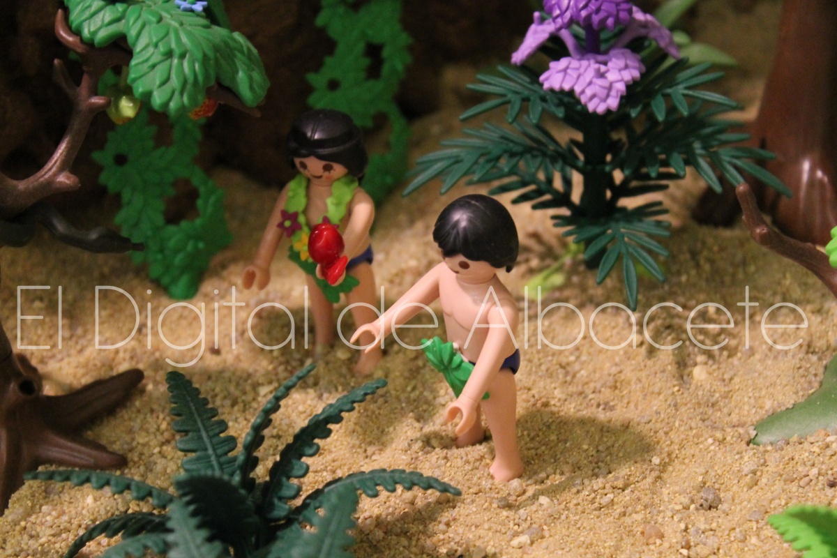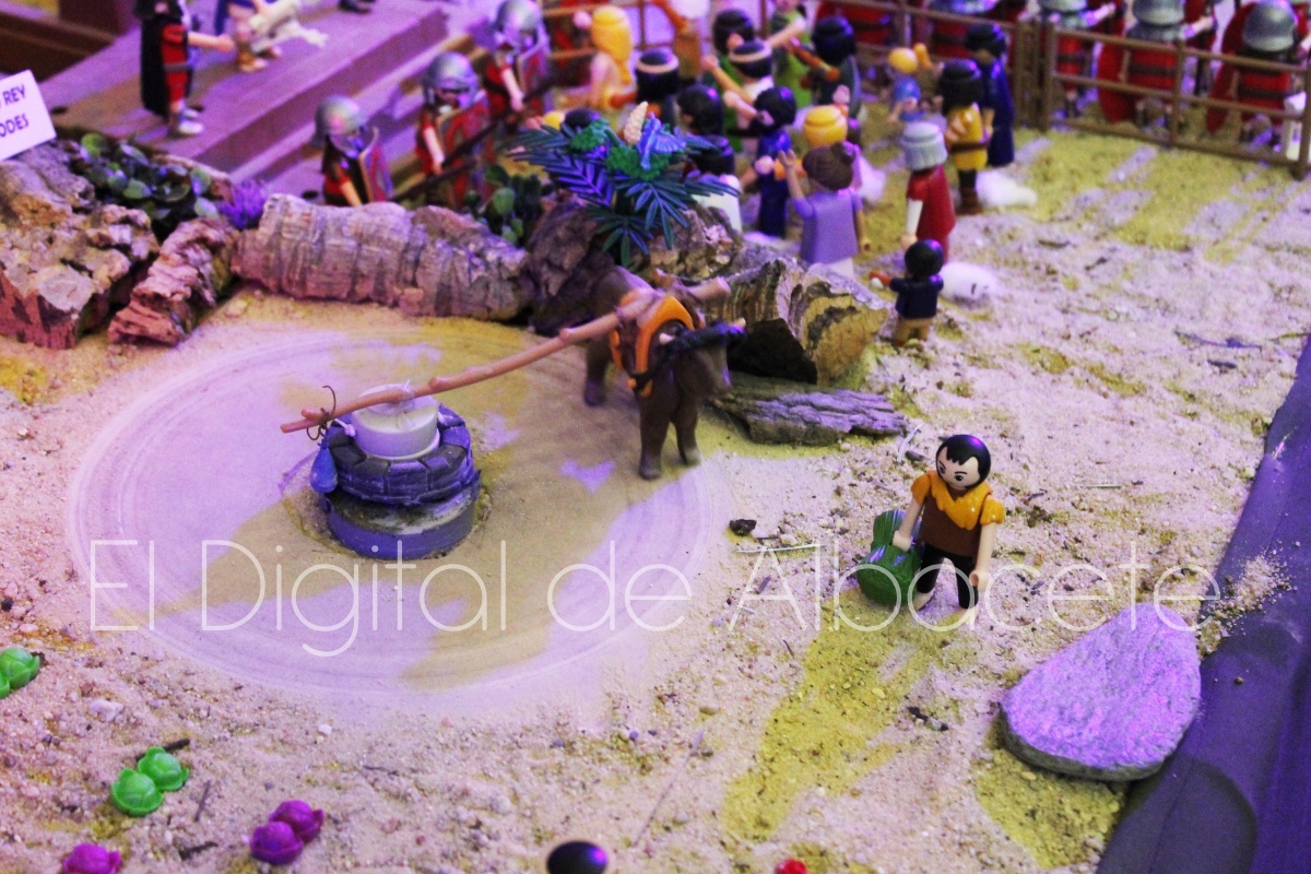Como en ediciones anteriores, en este original belén se pueden encontrar figuras de Playmobil representando las principales escenas bíblicas. “Siempre incluimos las más representativas, desde la Anunciación a María, el Nacimiento de Jesús, su vida en Egipto, su paso por la sinagoga cuando era un niño, y, por supuesto, El sueño de José, La boda de María y José, María embarazada, María con su prima Isabel buscando posada, La anunciación de los pastores, o el Coro de Ángeles. Pero, como cada año, el belén trae muchas novedades. Así, además de esas principales escenas bíblicas, este año hemos añadido escenas del Antiguo Testamento como la de Moisés abriendo las aguas, el Arca de Noé, David y Goliat, Adán y Eva, y por último Julio Cesar y Cleopatra en el encuentro en Egipto. Además, como el 9 de noviembre se celebró la conmemoración de los 650 años de la obtención del Privilegio de Villazgo en 1375, un hito histórico que le otorgó la independencia y el título de ‘Villa’ (Villa de Albacete), por Don Alfonso de Aragón, Marqués de Villena, hemos querido representarlo en el belén. De este modo aparece el propio Marqués de Villena, junto a dos parejas de manchegos, el cuchillero, el sembrador, y el cartel del aniversario”, señala.