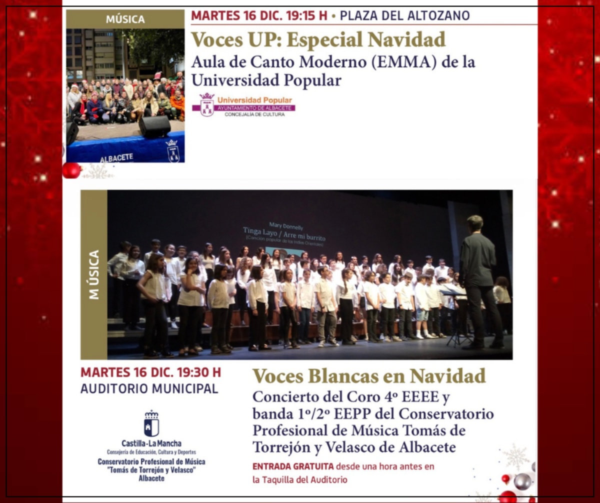 Poco después, a las 19:30 horas, el Auditorio Municipal será el escenario del concierto ‘Voces Blancas en Navidad’, a cargo del Coro de 4º EEEE y la Banda de 1º/2º EEPP del Conservatorio Profesional de Música Tomás de Torrejón y Velasco de Albacete. El recital pondrá en valor el trabajo educativo y artístico del alumnado, con entrada gratuita, disponible desde una hora antes en la taquilla del Auditorio.