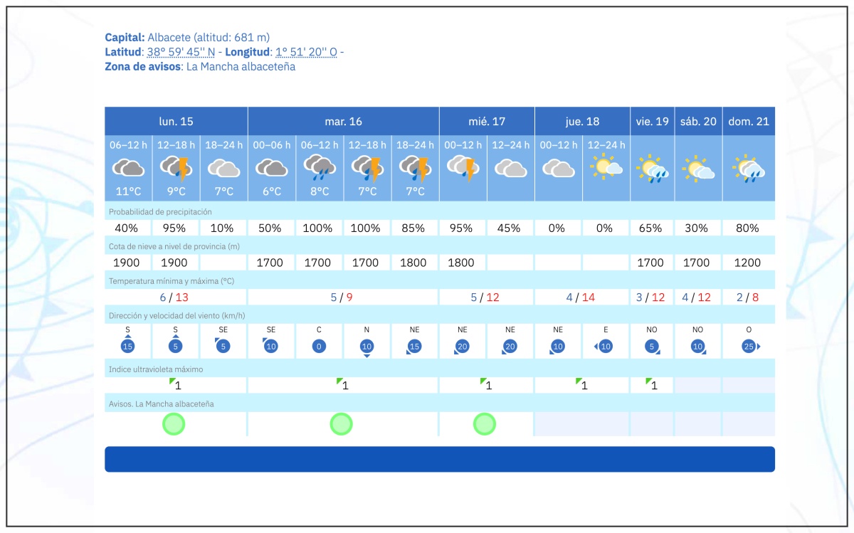 La Agencia Estatal de Meteorología (AEMET) prevé para Albacete una semana marcada por la inestabilidad, con lluvias y tormentas entre el lunes y el miércoles, un respiro el jueves y un nuevo empeoramiento de cara al fin de semana.