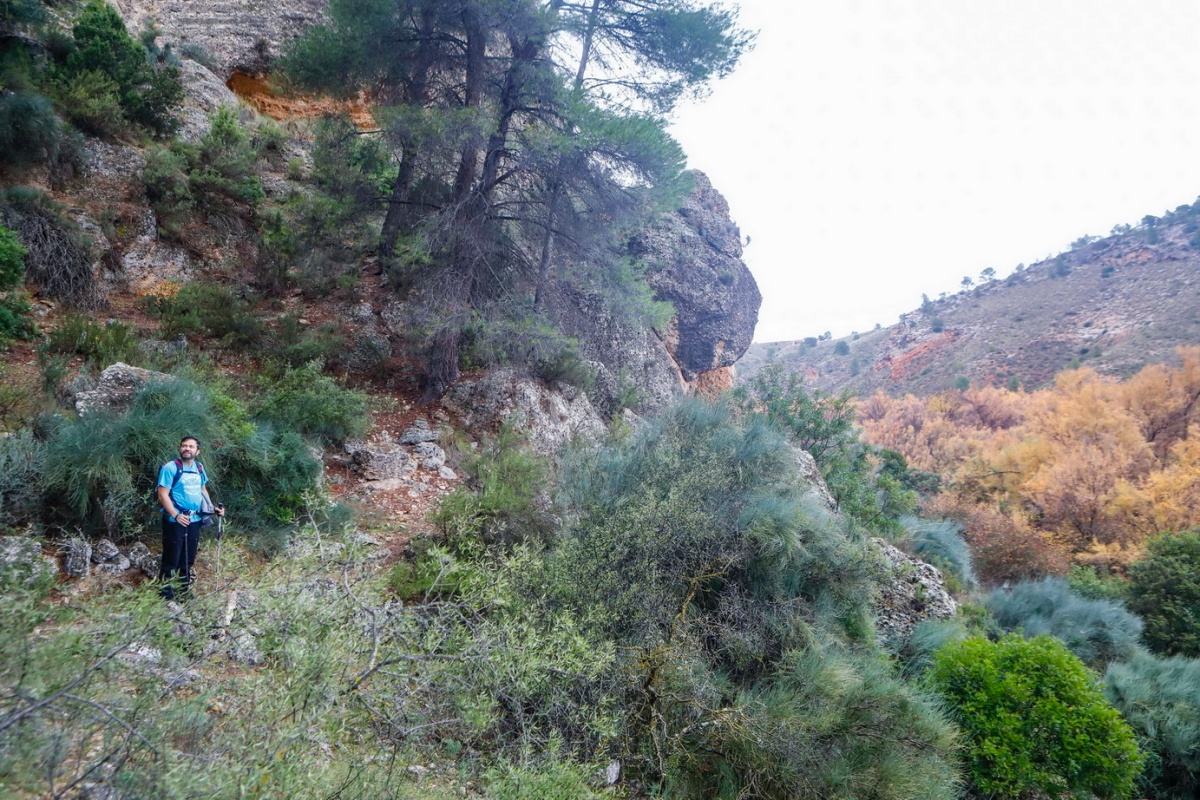 Con el cielo cubierto, sobre las nueve de la mañana, desde la puerta del Ayuntamiento, que se sitúa frente a la iglesia, arrancaría la marcha, descendiendo por las peculiares calles de Jorquera hasta llegar al cauce del río Júcar. Cruzarían este por el puente, para girar a la derecha y caminar por la orilla a pie de roca, hasta comenzar a ascender por la antigua calzada romana, para adentrase en un bosque de pinos hasta llegar al primero de los miradores, con la maravillosa vista del pueblo al frente y todo el valle que forma el Júcar a su paso.