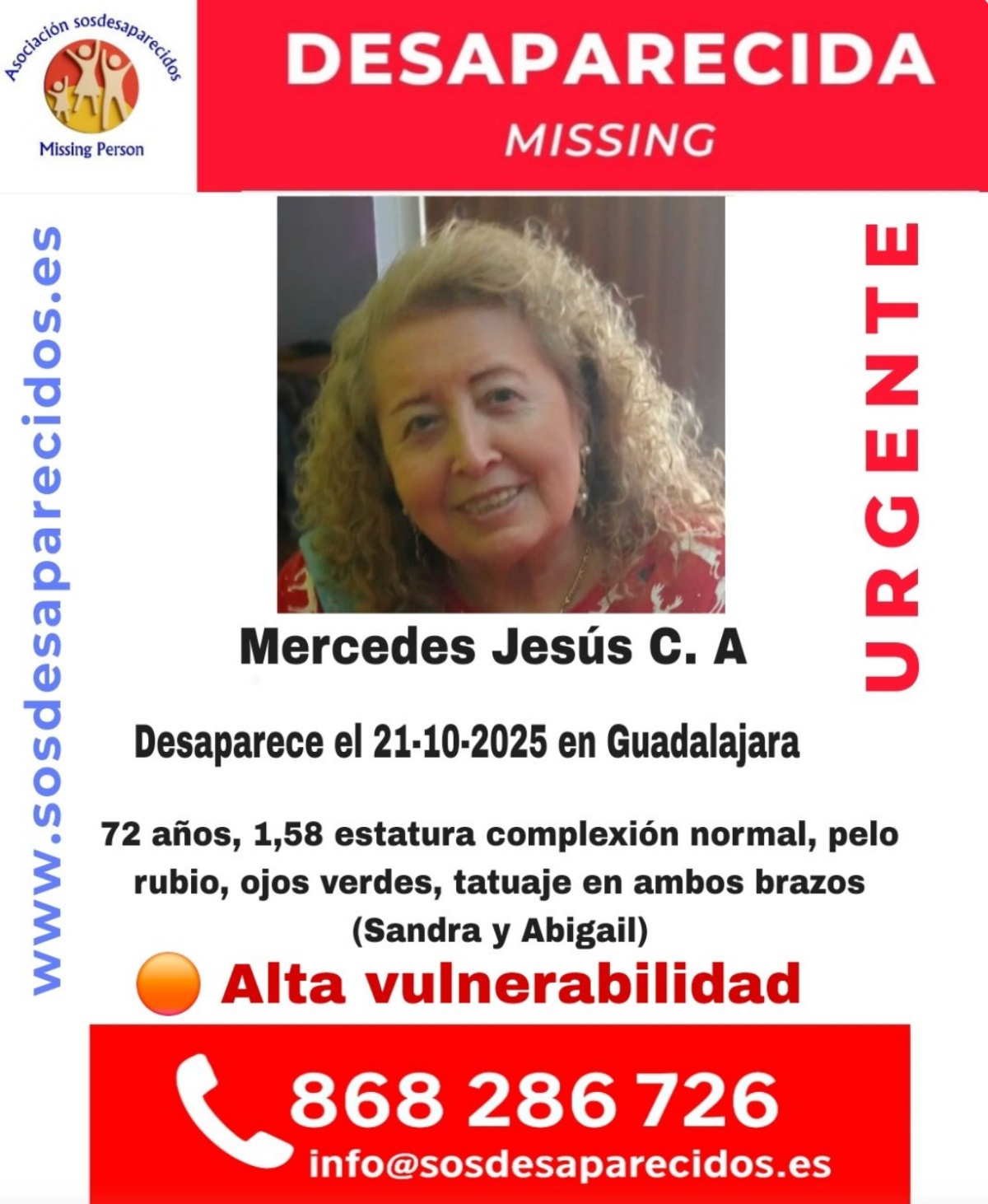 De 72 años de edad, Mercedes Jesús es una persona con “alta vulnerabilidad”, mide cerca de 1.58 metros y es de complexión normal. Tiene el pelo rubio y los ojos verdes, tal y como ha señalado SOS Desaparecidos mediante su perfil en X (antes Twitter).