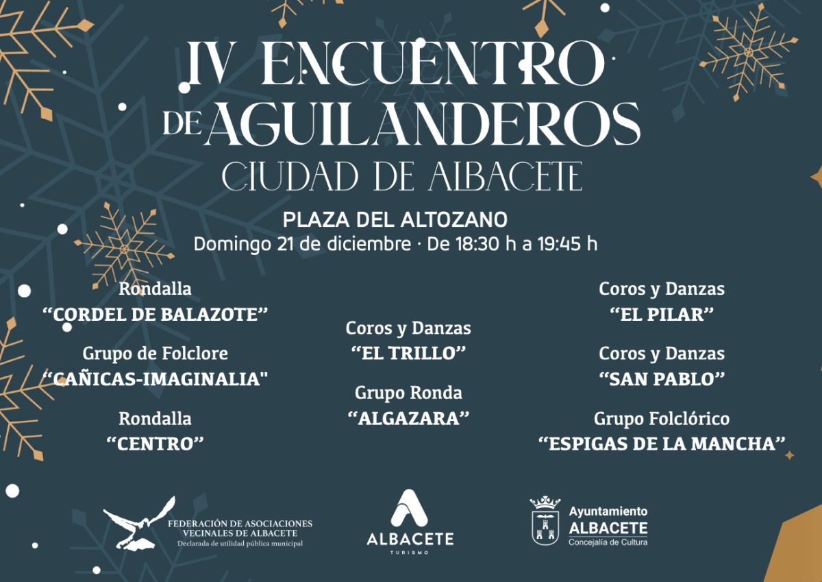 Cita especialmente señalada la de este domingo, 21 de diciembre, donde Coros y Danzas ‘El Trillo’, Grupo Ronda ‘Algazara’, Coros y Danzas ‘El Pilar’, Coros y Danzas ‘San Pablo’, Rondalla ‘Cordel de Balazote’, Grupo de Folclore ‘Cañicas Imaginalia’, ‘Barrio Centro Albacete’ y el Grupo Folclórico ‘Espigas de La Mancha’ se darán cita en los diferentes barrios de la ciudad para llenarlos de música en las horas de mañana, mientras que a partir de las 18:30 horas se darán cita en la Plaza del Altozano en el IV Encuentro de Aguilanderos Ciudad de Albacete.